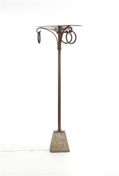 Copper floor lamp with granite plinth and lampshade disc supported by three uprights supporting rings. Italy, 1910s/1920s. (h 193 cm.) (defects)