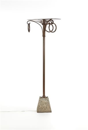Lampada da terra in rame con plinto in granito e disco paralume sostenuto da tre montanti reggenti anelli. Italia, anni '10/'20. (h cm 193) (difetti)