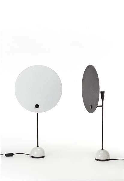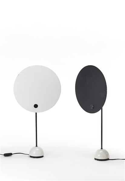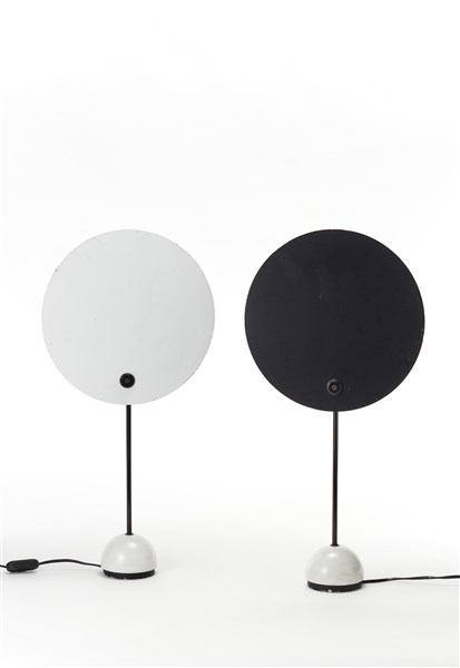Lotto di due lampade da tavolo modello "Kuta". Produzione O-Luce, Milano, 1980. Alluminio smaltato bianco e nero. (h cm 60,5) (lievi difetti)