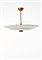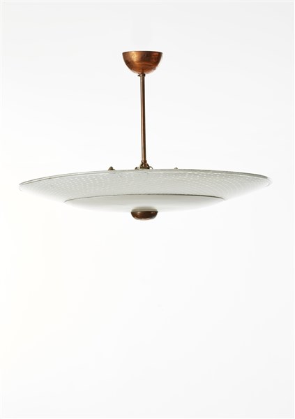 Lampada a sospensione con struttura in ottone paralume in alluminio verniciato bianco e diffusore in vetro soffiato a reticello incolore e lattimo. Italia, anni '30. (h cm 40; d cm 58) (lievi difetti)