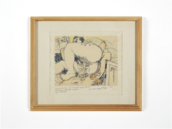 Disegno di soggetto erotico recante nota manoscritta. Biro e pastelli su carta. 1954. Firmato "T. Buzzi" in basso a destra (cm 28x32). In cornice con passepartout. (lievi difetti)