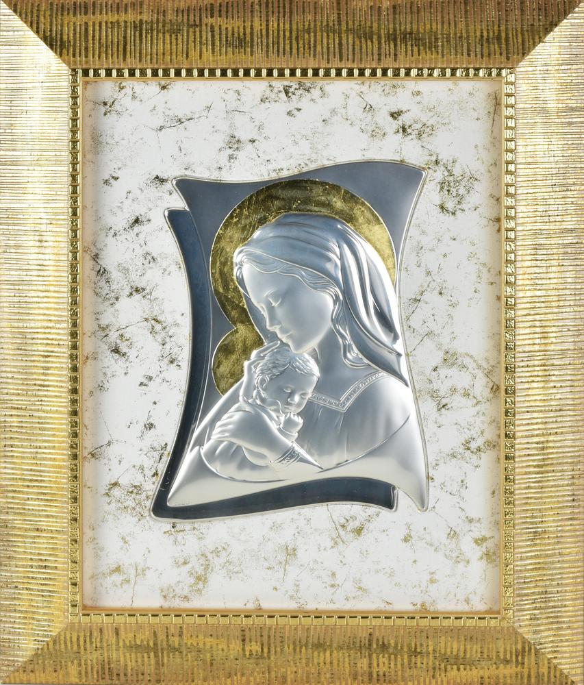 SCULTURA IN ARGENTO SBALZATO satinata, lucida e dorata raffigurante Madonna...