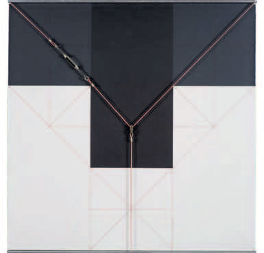Gianfranco Pardi Milano, 1933 - 2012 ARCHITETTURA, 1974 Acrilico, grafite, corda e acciaio su tela, cm 75x75. Firmato, datato e titolato al verso: Pardi 74 “Architettura” 75x75. Provenienza: Milano, Studio Marconi; Collezione privata.