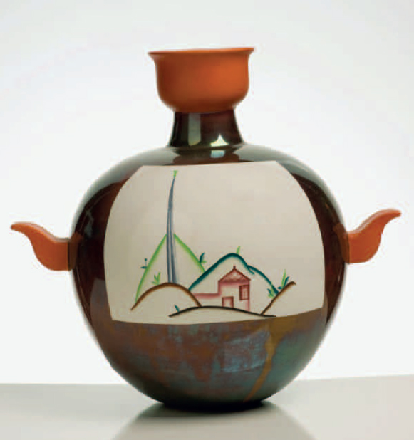 Guido Andlovitz VASO, 1930 Eseguito da S.C.I. In porcellana di forma sferica decorato con due riquadri a paesaggio minimo su superficie iridata, anse mosse. Firma: Lavenia; altezza cm 32