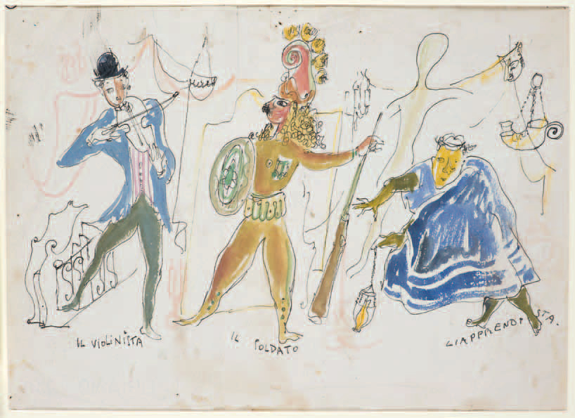 Gio Ponti IL VIOLINISTA, IL SOLDATO, L’APPRENDISTA, anni ‘40 Acquarello e china su carta, cm 23,5x32 Allegata una lettera che certifica che il disegno fu di proprietà di Pietro Melandri. Opera registrata presso Gio Ponti Archives con il numero 08004/000