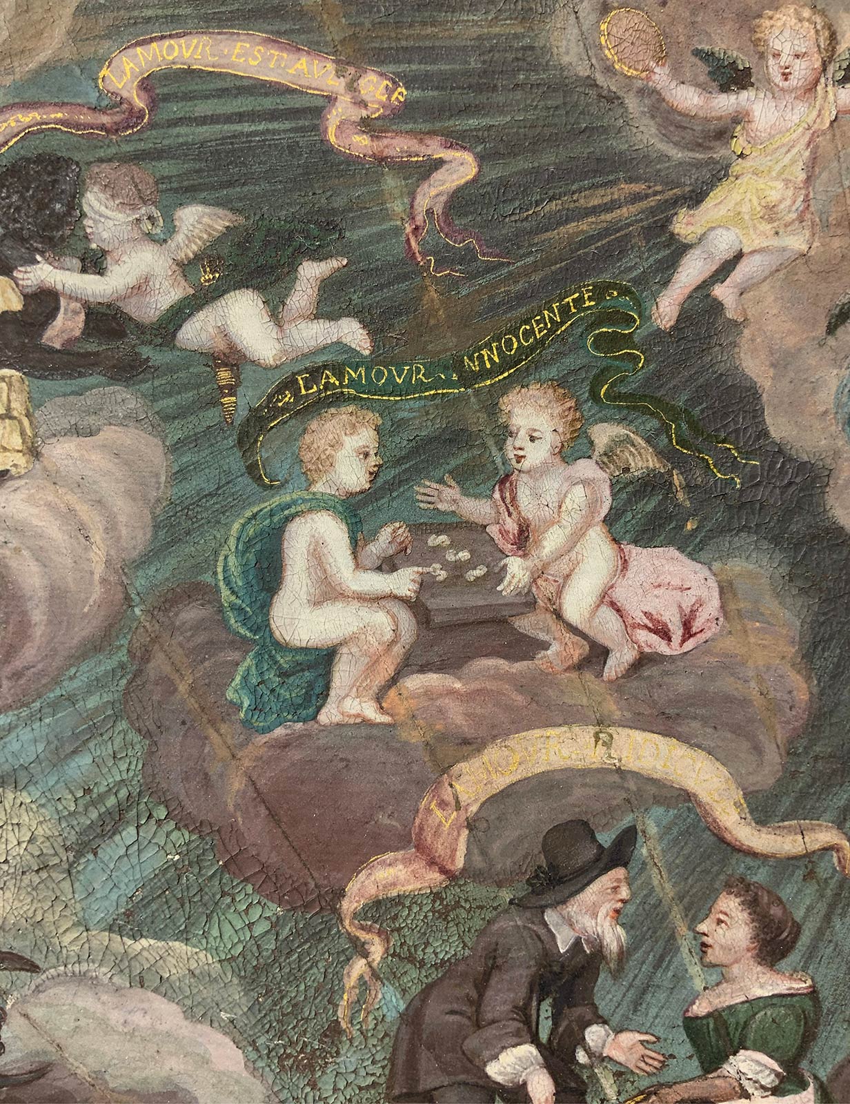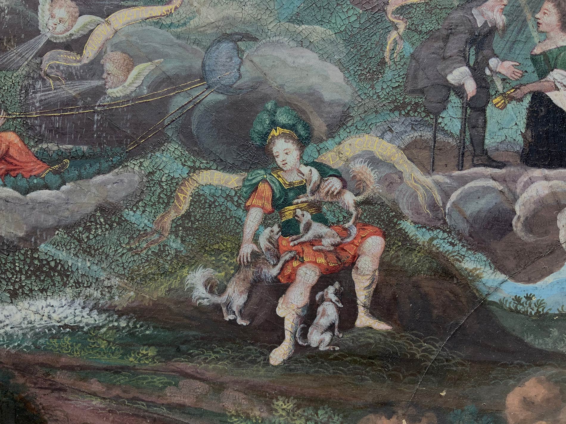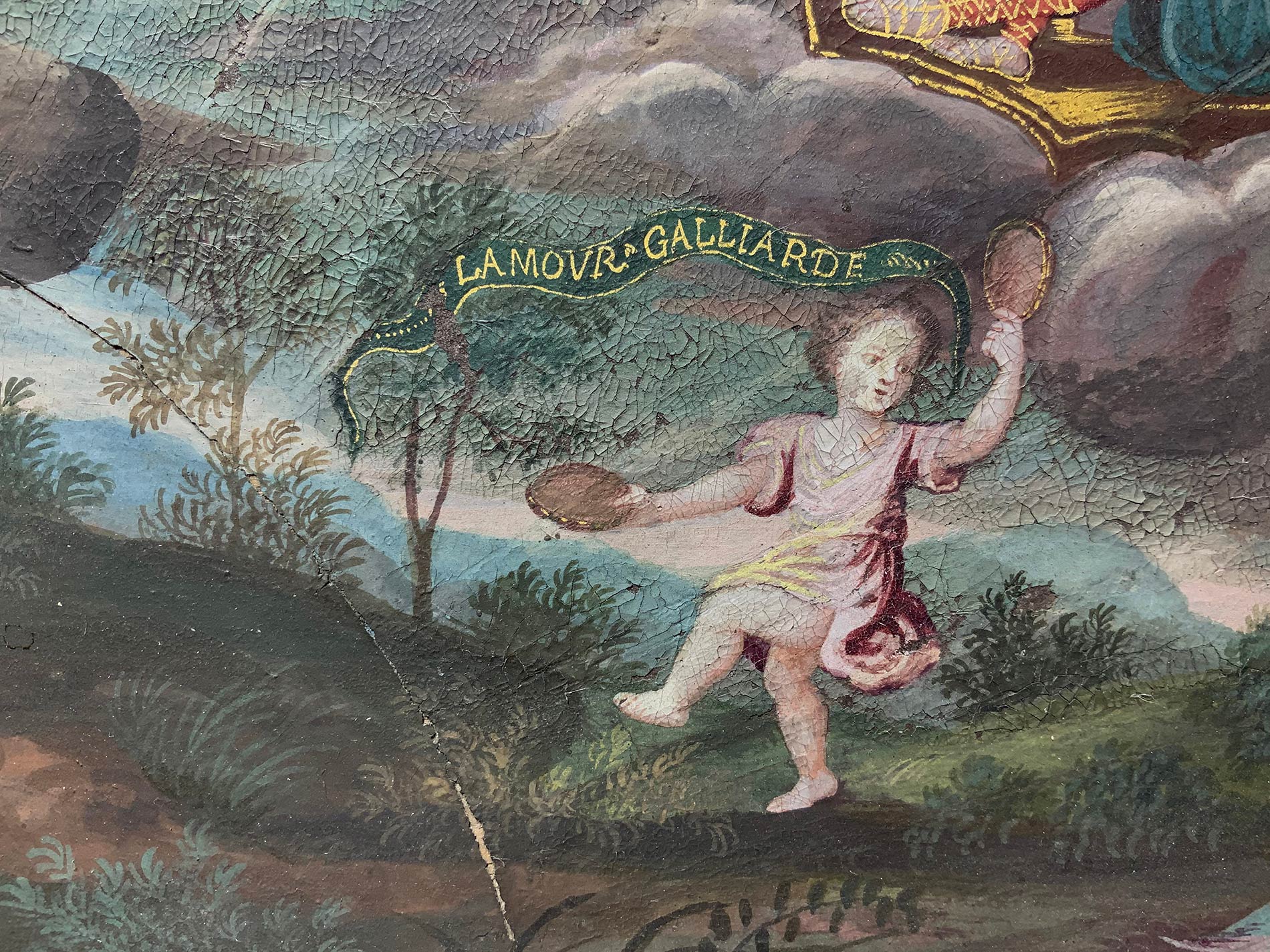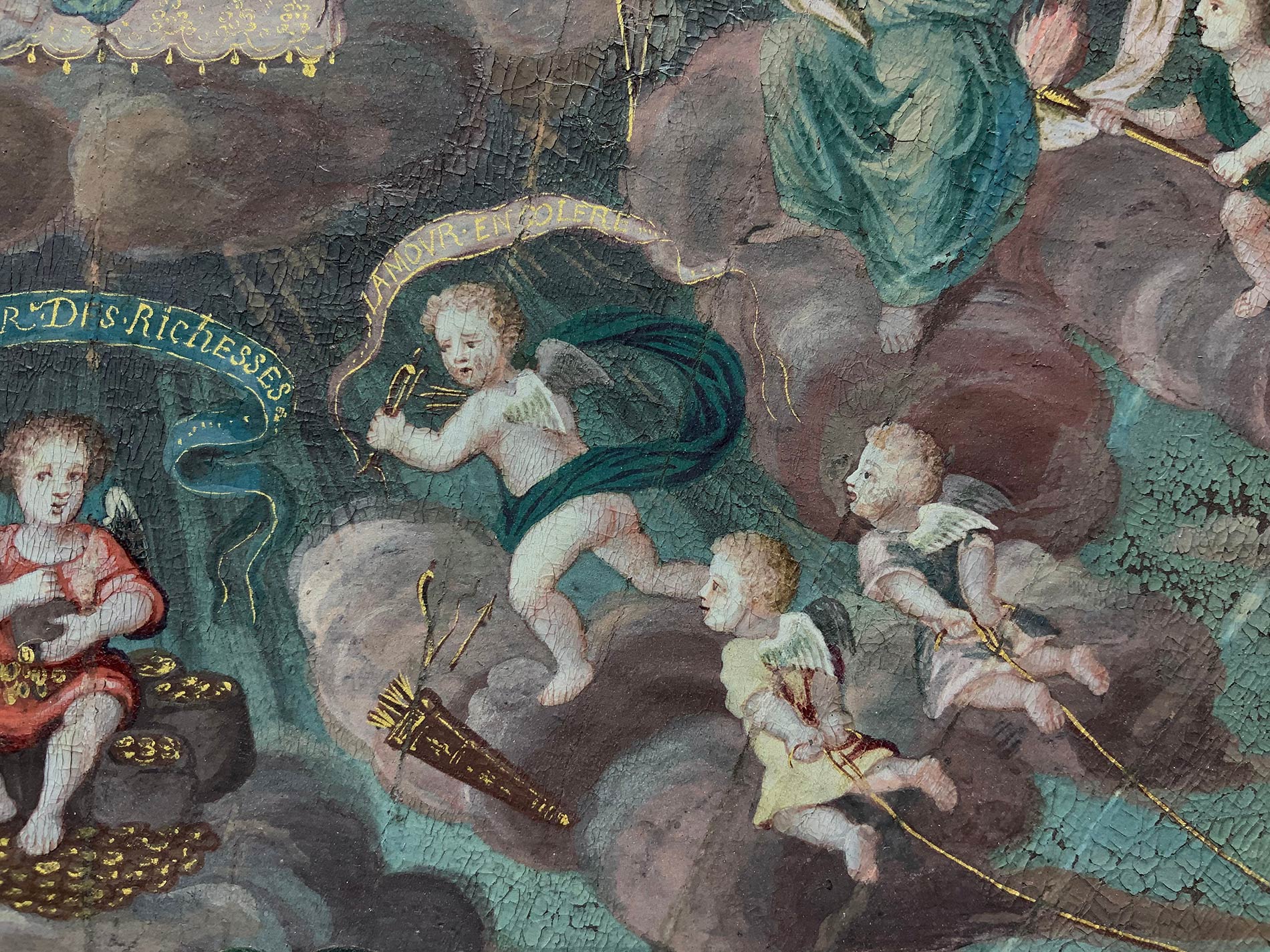 Henri Lerambert (Parigi metà 500-1609). Tribunale dell’amore. Cm 27x47,5, tempera su carta applicata a tavola in legno di rovere. Certificazione Prof. Francesco Gallo, docente Accademia delle Belle Arti di Roma. Autore presente al Louvre di Parigi