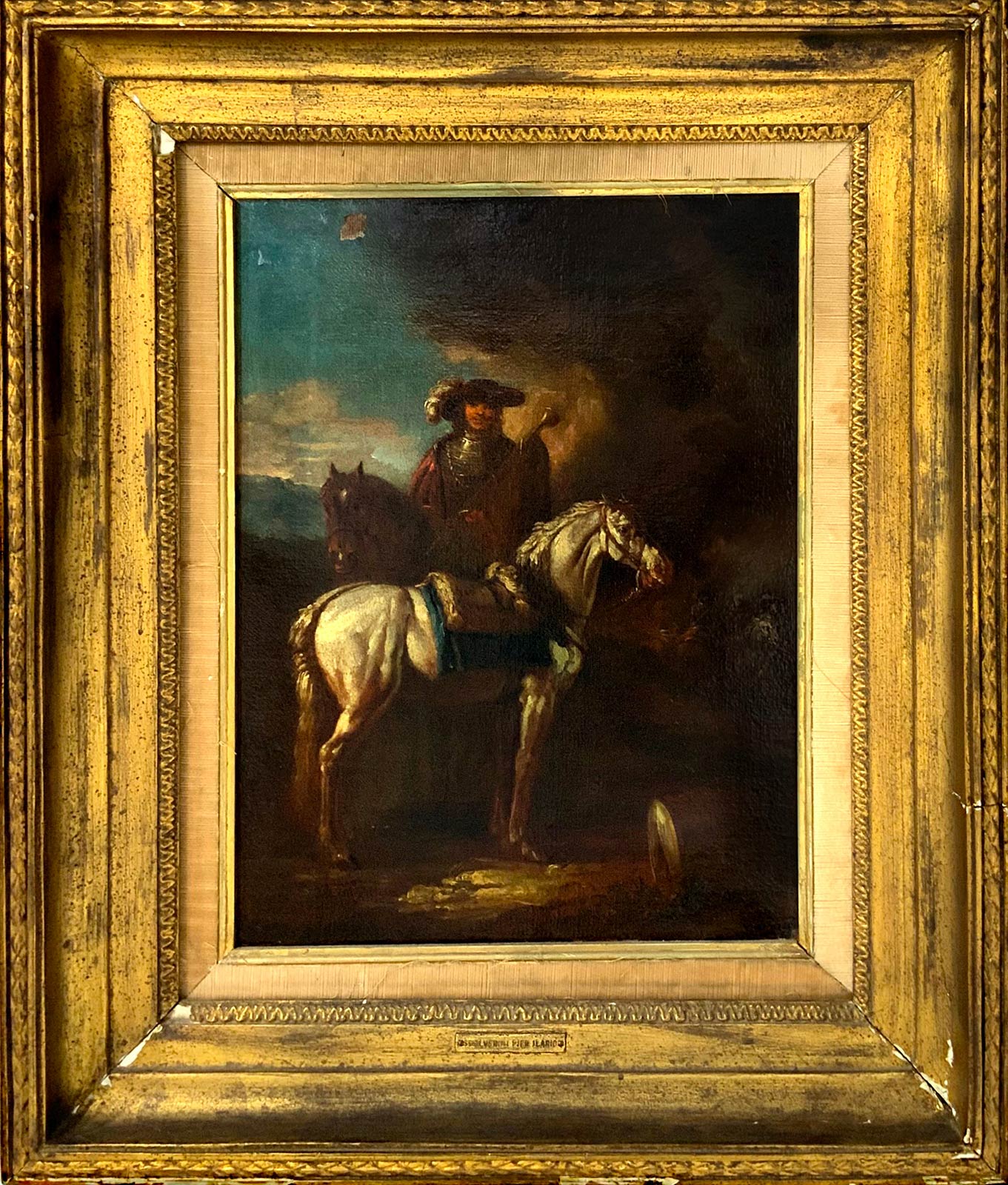 Attribuito a Ilario Giacinto Mercanti detto lo Spolverini (Parma 1657-Piacenza1734). Cavaliere a cavallo. 44x32,5, olio su tela. Piccole cadute di colore. Vecchia Attribuzione anni '60 di Amadore Porcella, Ex Presidente Federazione Nazionale degli Esperti e Critici d'arte. Provenienza antica collezione del Principe Boncompagni Ludovisi (timbro in ceralacca sul retro). Conf. dipinto Duca di Parma Antonio Farnese nella Pinacoteca di Parma.