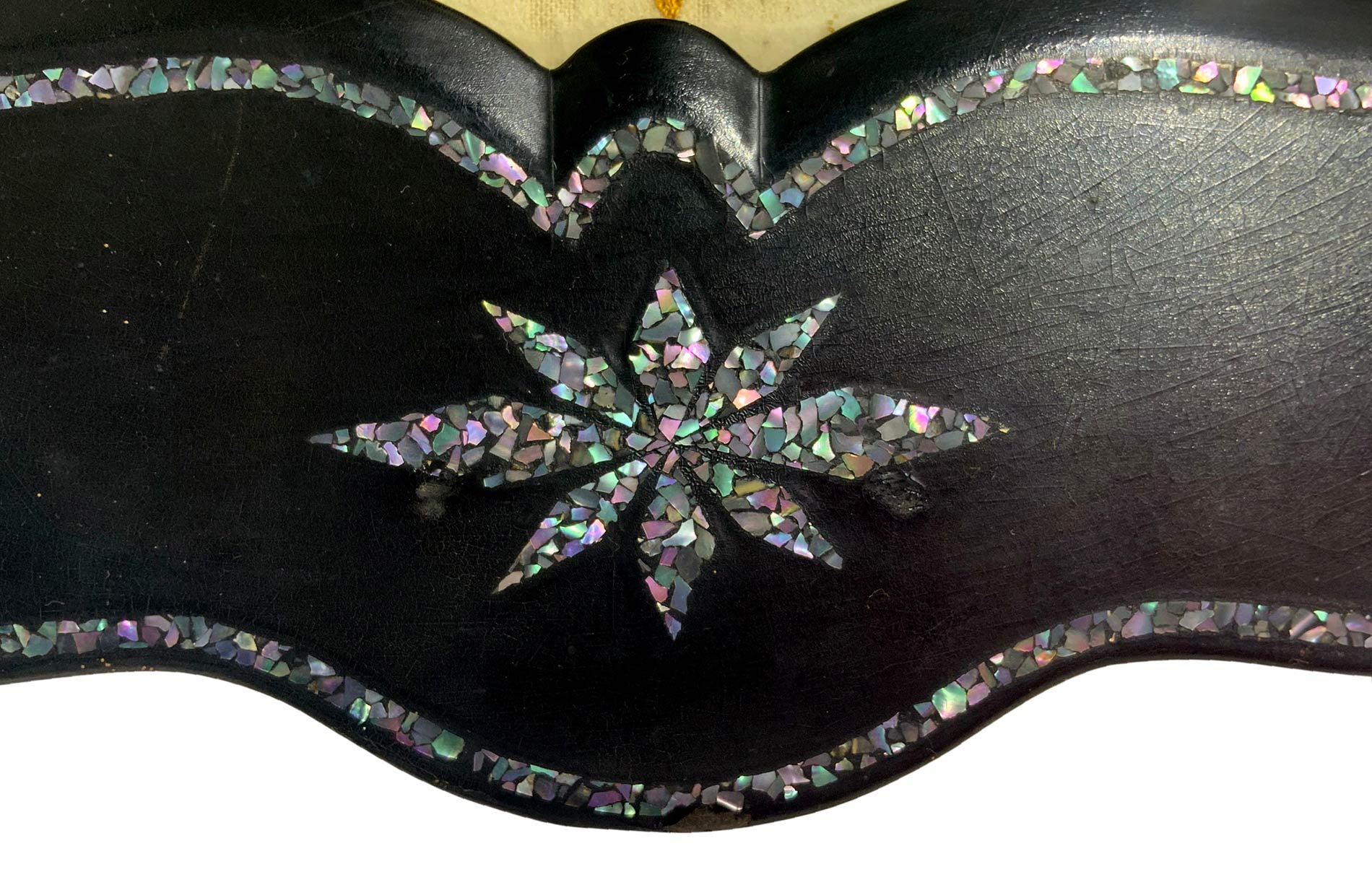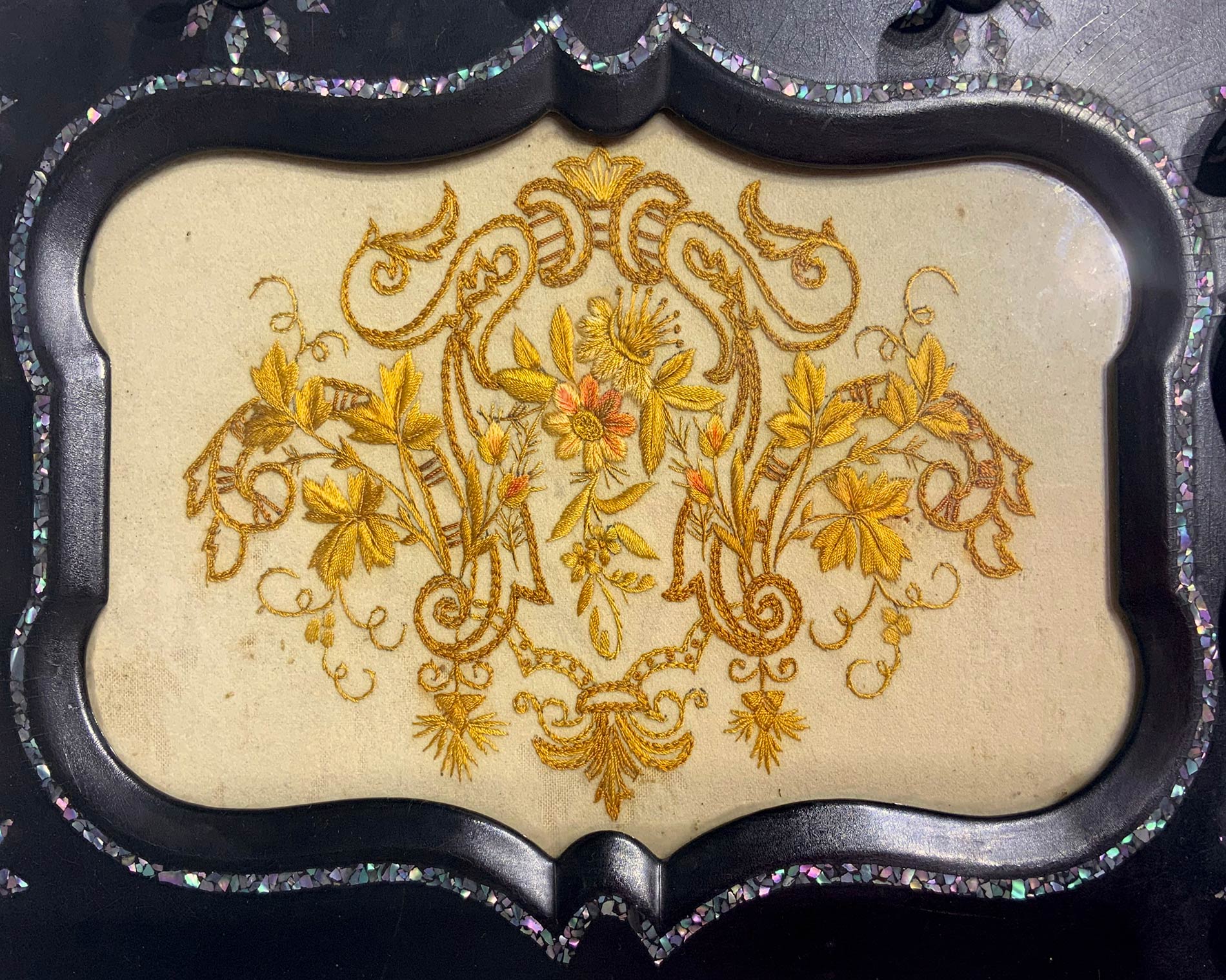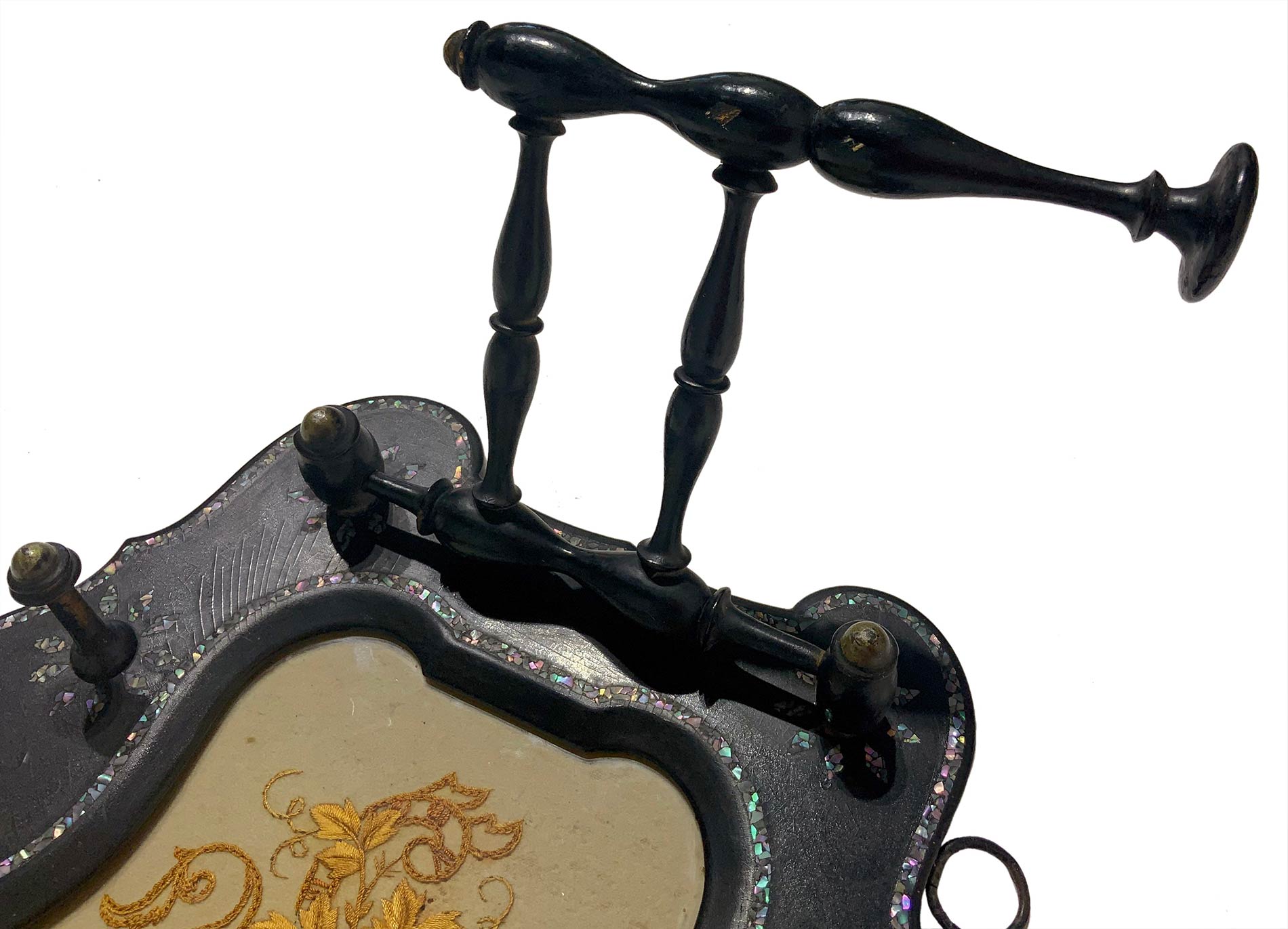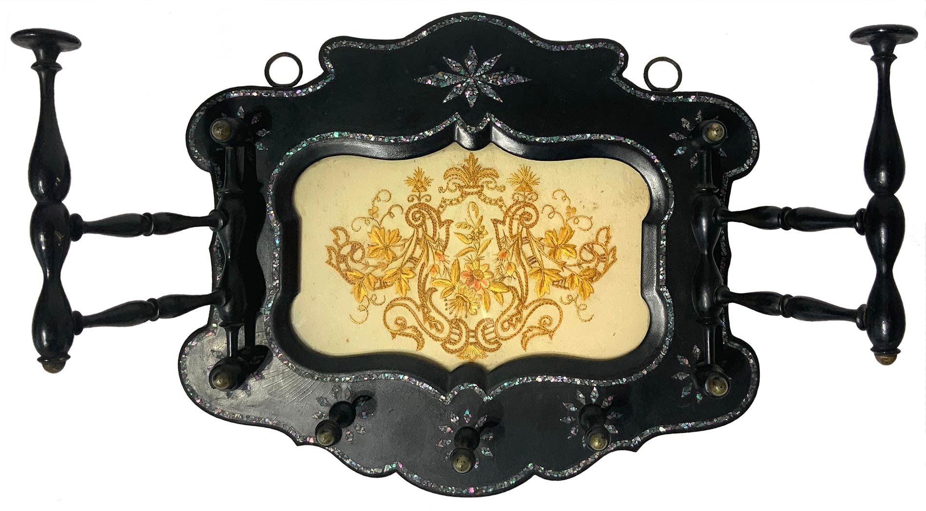 Appendiabiti, Sicilia, XIX secolo. In legno nero ebanizzato con intarsi di madreperla e ricamo centrale in seta. Cm 32,5x39, profondità cm 17