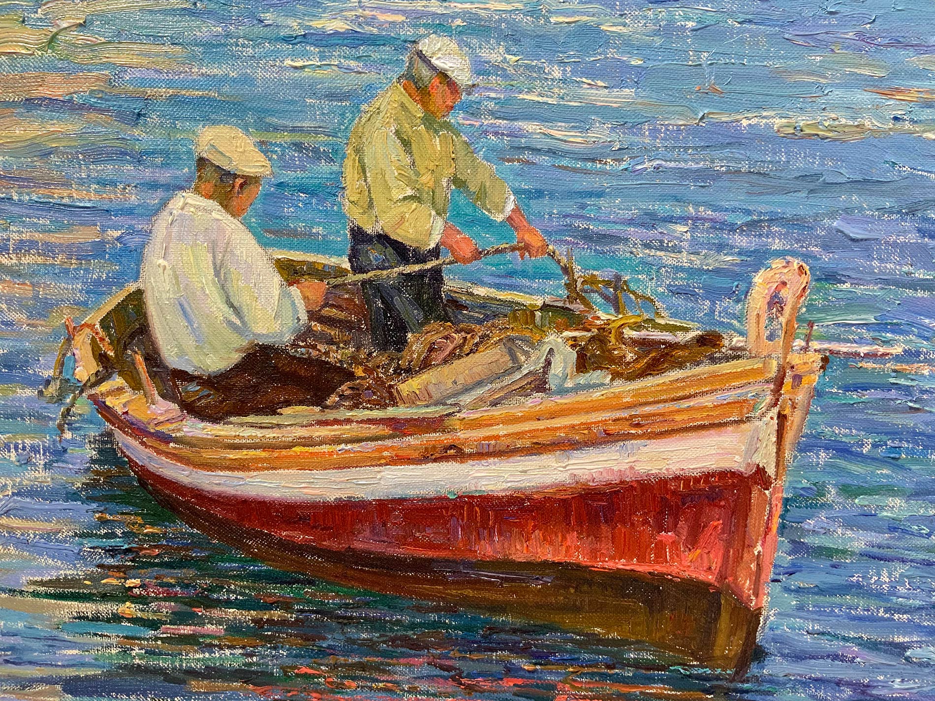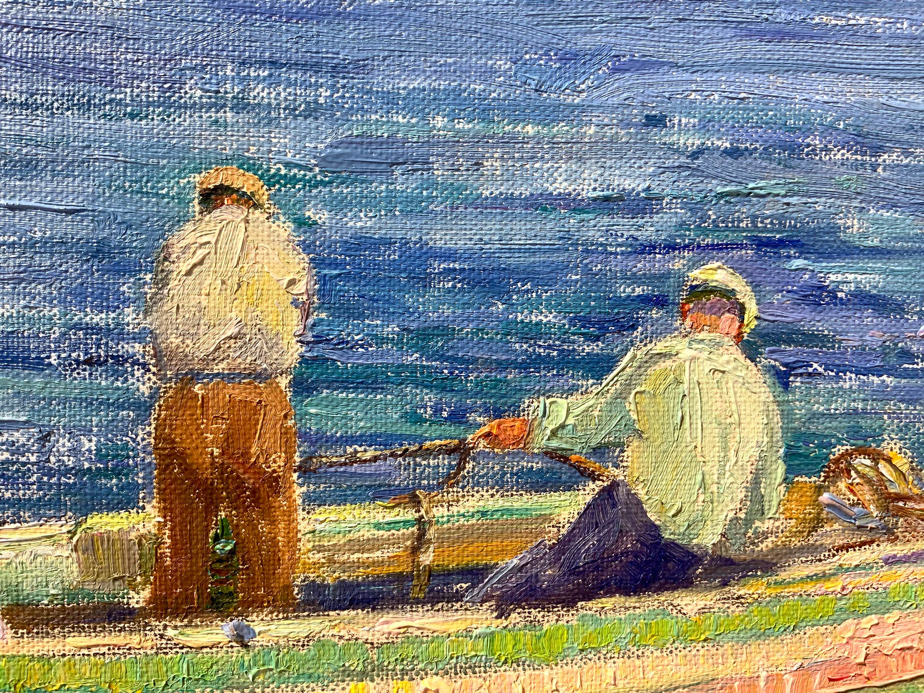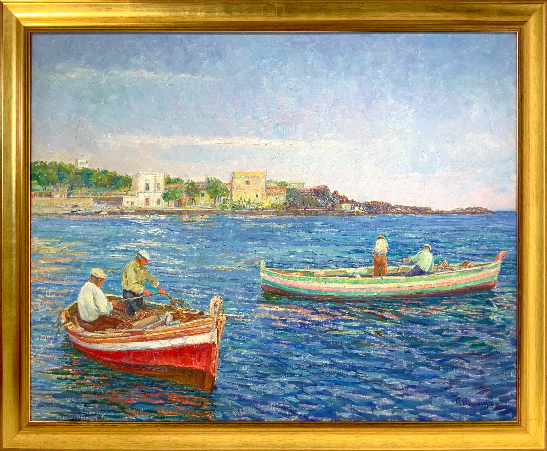 Roberto Rimini (Palermo 1888- Acitrezza 1971). Marina di Capomulini (Catania) con barche. 78x100, olio su tela. Pubblicato pg 196 del catalogo Roberto Rimini, Ed. Giuseppe Maimone del 2002, opera n.165.