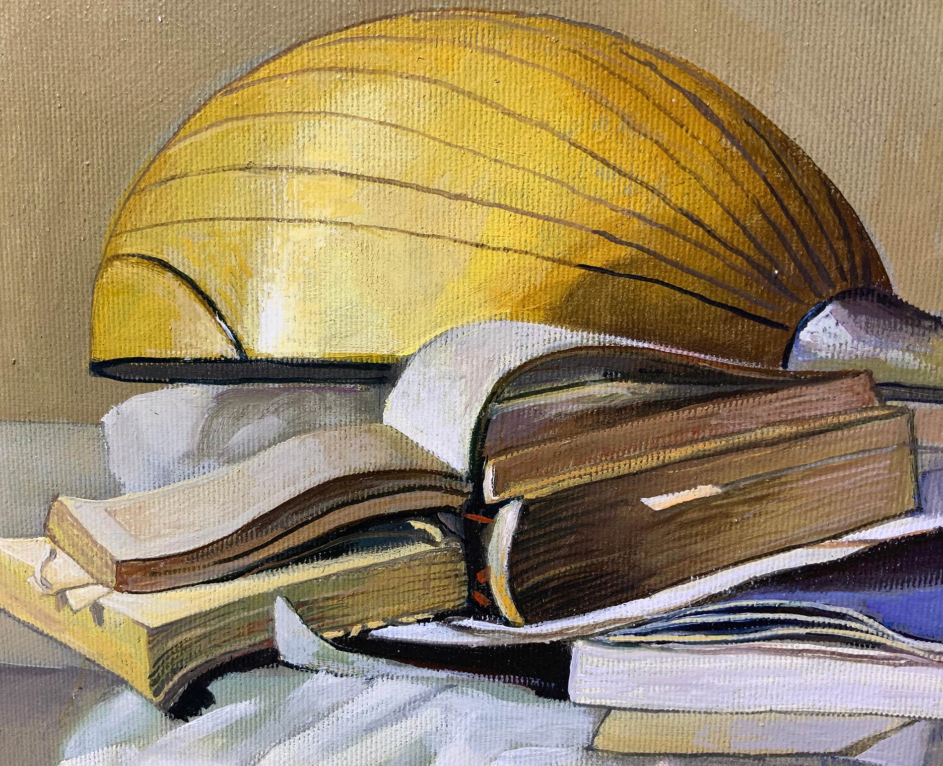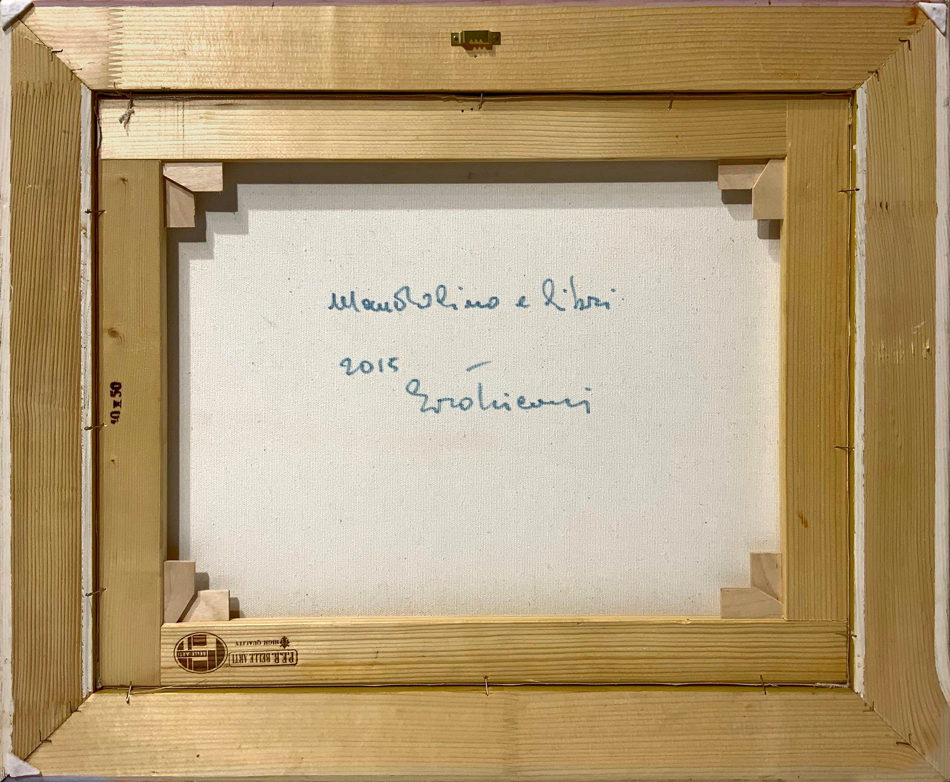 Saro Tricomi (Catania, 1937). Natura morta con Mandolino e libri. 40x50, olio su tela. Firmato in basso a destra. Datato 2015 e firmato sul retro.