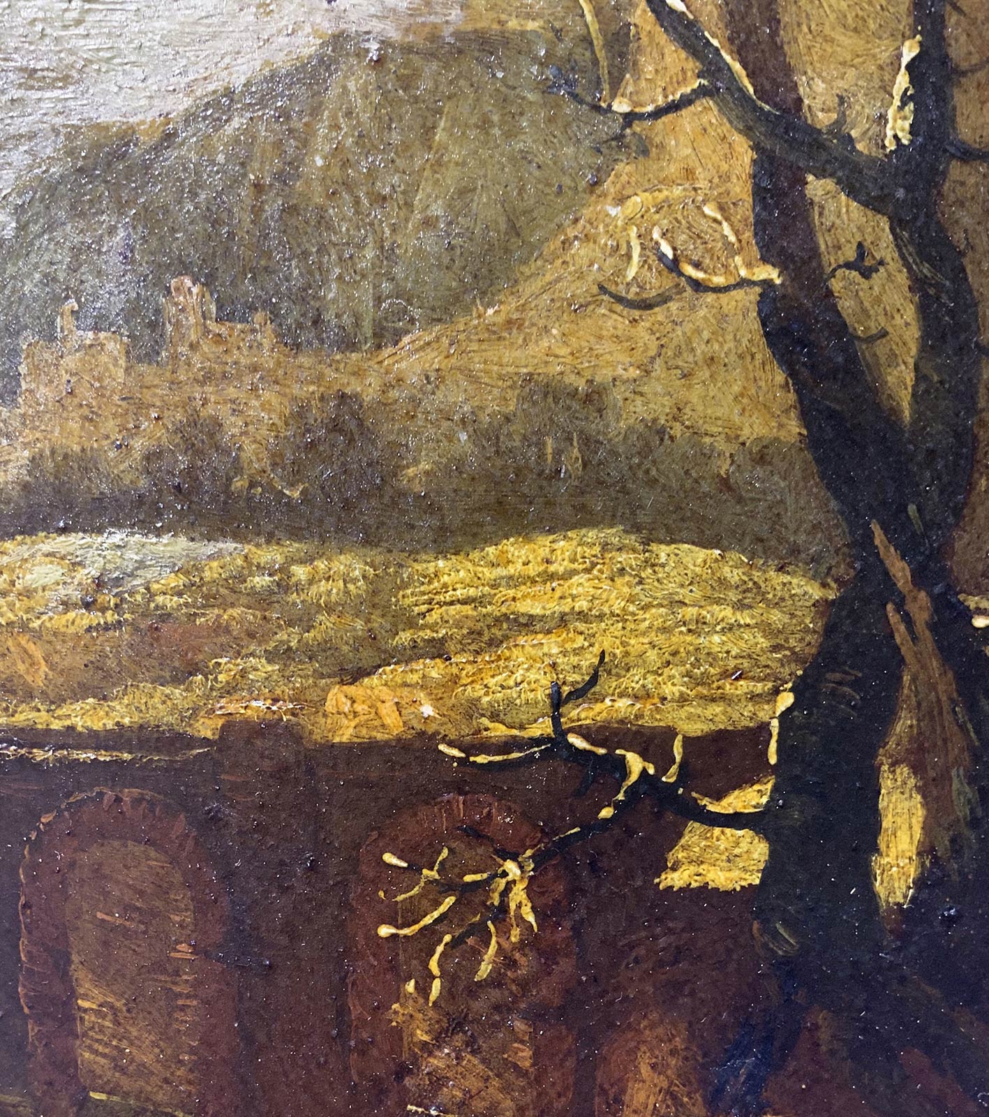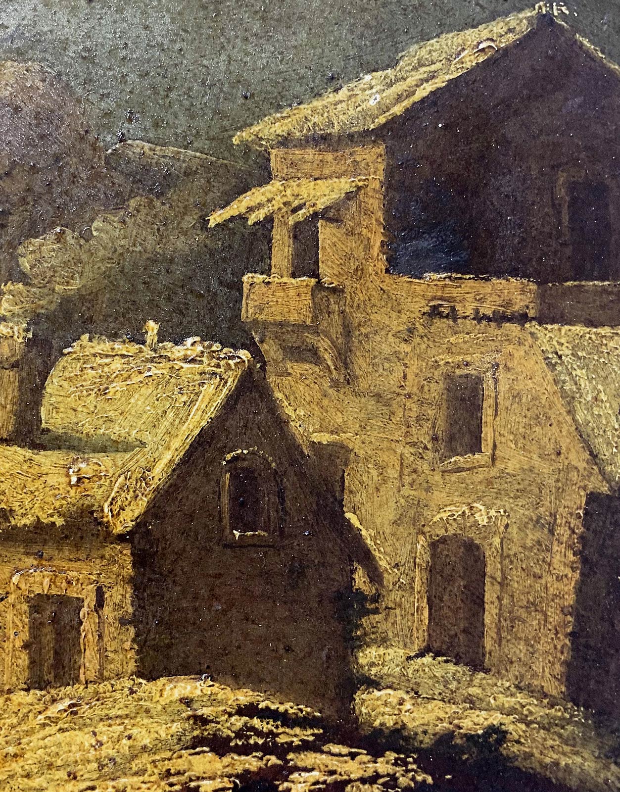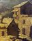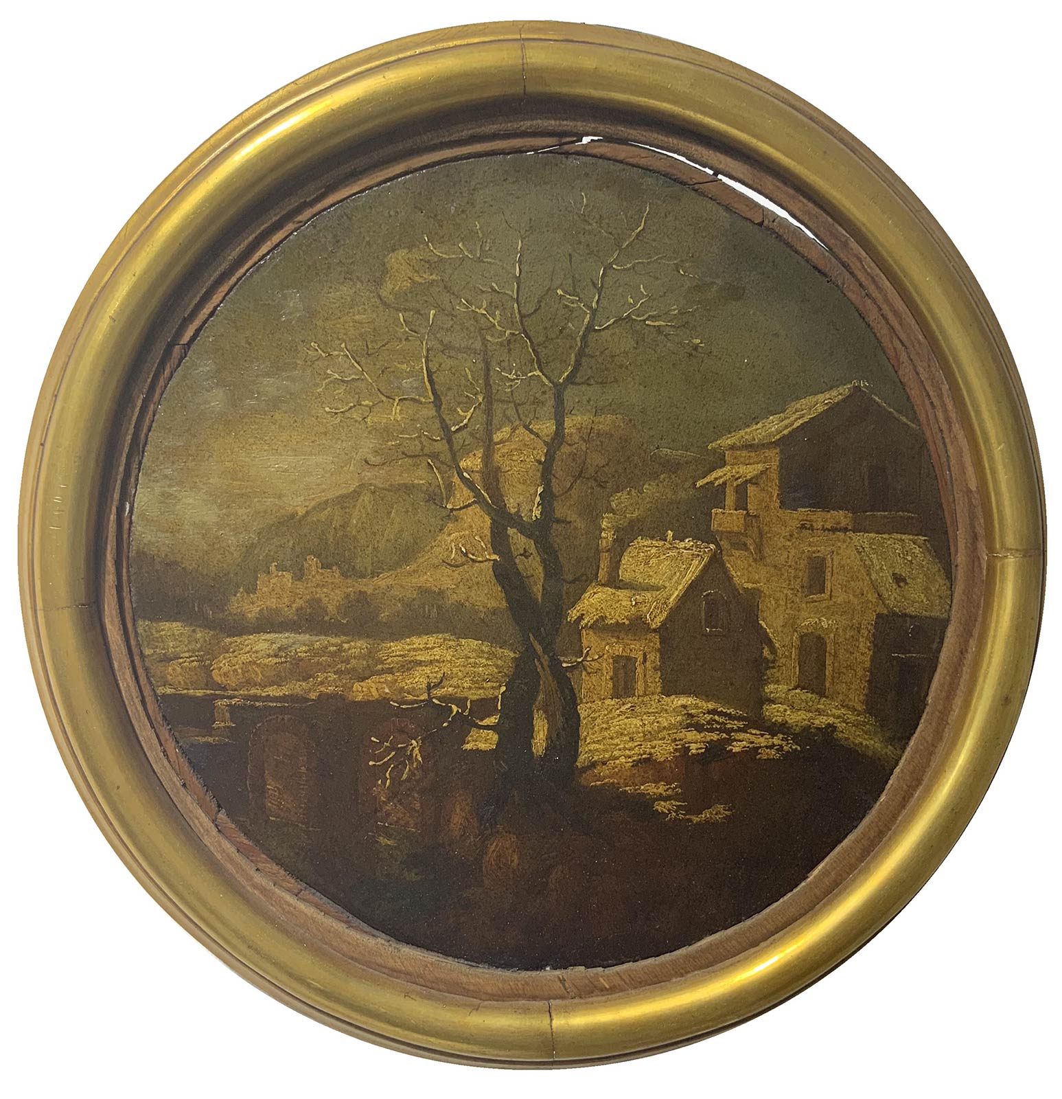 Pittore della seconda metà del XVIII Secolo. Tondo con paesaggio di casette innevate. Diametro 27, olio su tavola. Antica collezione Notaio Cav. Fazio. Superficie del dipinto risulta interessata dalla presenza di uno strato di vernice ossidata e ingiallita.
