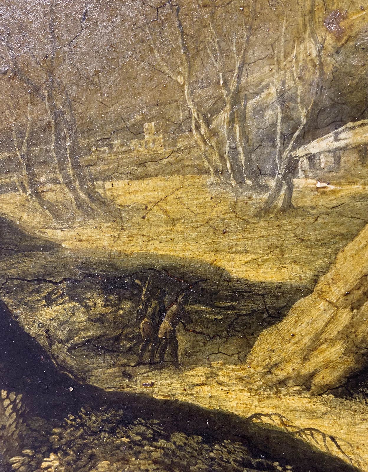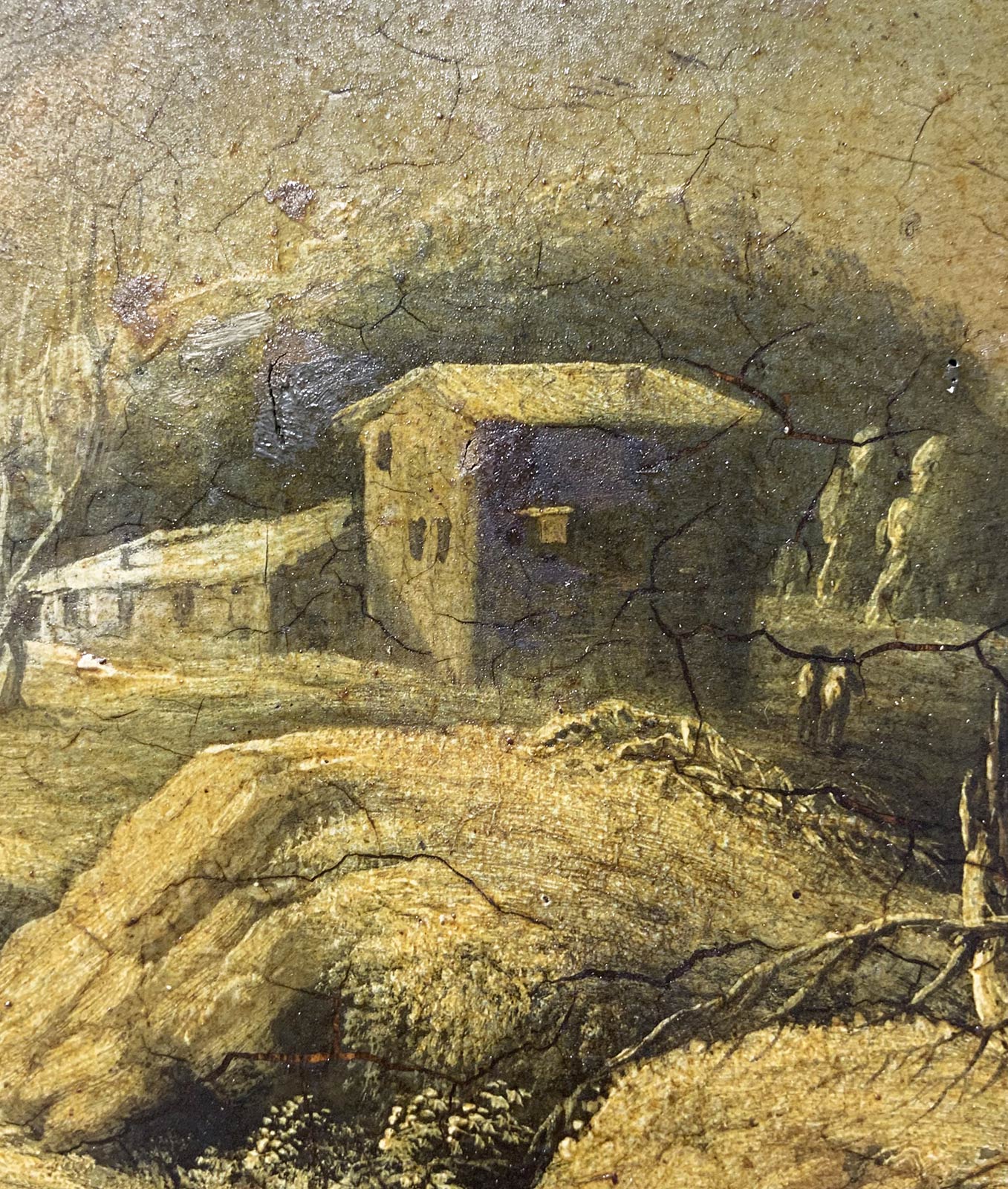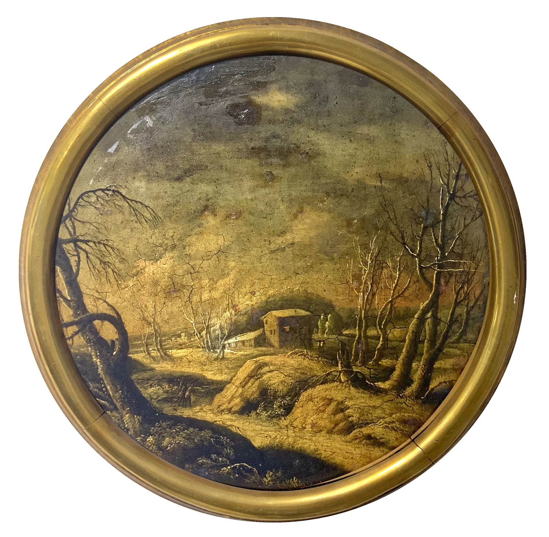 Pittore della seconda metà del XVIII Secolo. Tondo con paesaggio innevato. Diametro 27, olio su tavola. Antica collezione Notaio Cav. Fazio. Superficie del dipinto risulta interessata dalla presenza di uno strato di vernice ossidata e ingiallita.