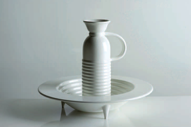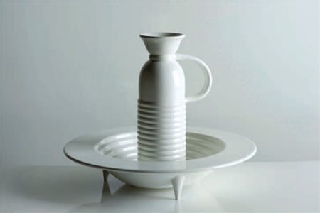 Ugo La Pietra “BROCCA E BACINELLA”, 1991 Eseguite da Fusella, realizzate in due esemplari. Ceramica a colaggio smaltata bianco Faenza; firma: Design Ugo La Pietra Prod: Linea 2F Italia 1991; altezza cm 31 e diametro cm 42 Provenienza: Archivio Ugo La Pietra Bibliografia: U. La Pietra, La Sinestesia delle arti. 1960 - 2000, Milano, 2001, pag. 232 (per approfondimenti sul progetto)
