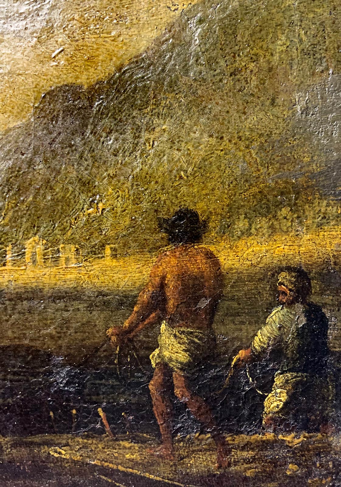 Ambito di Nicolò Codazzi (Napoli 1642-Genova 1693). Paesaggio con rovine. 32x49, olio su tela. Opera dichiarata d'interesse culturale ai sensi dell'art. 13 del D. Lgs 42/2004, l'acquisto è subordinato all'esercizio della prelazione da parte della Soprintendenza BB.CC.AA. Antica collezione Notaio Cav. Fazio. Superficie del dipinto risulta interessata dalla presenza di uno strato di vernice ossidata e ingiallita.