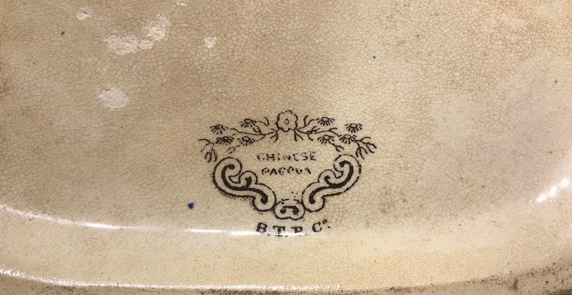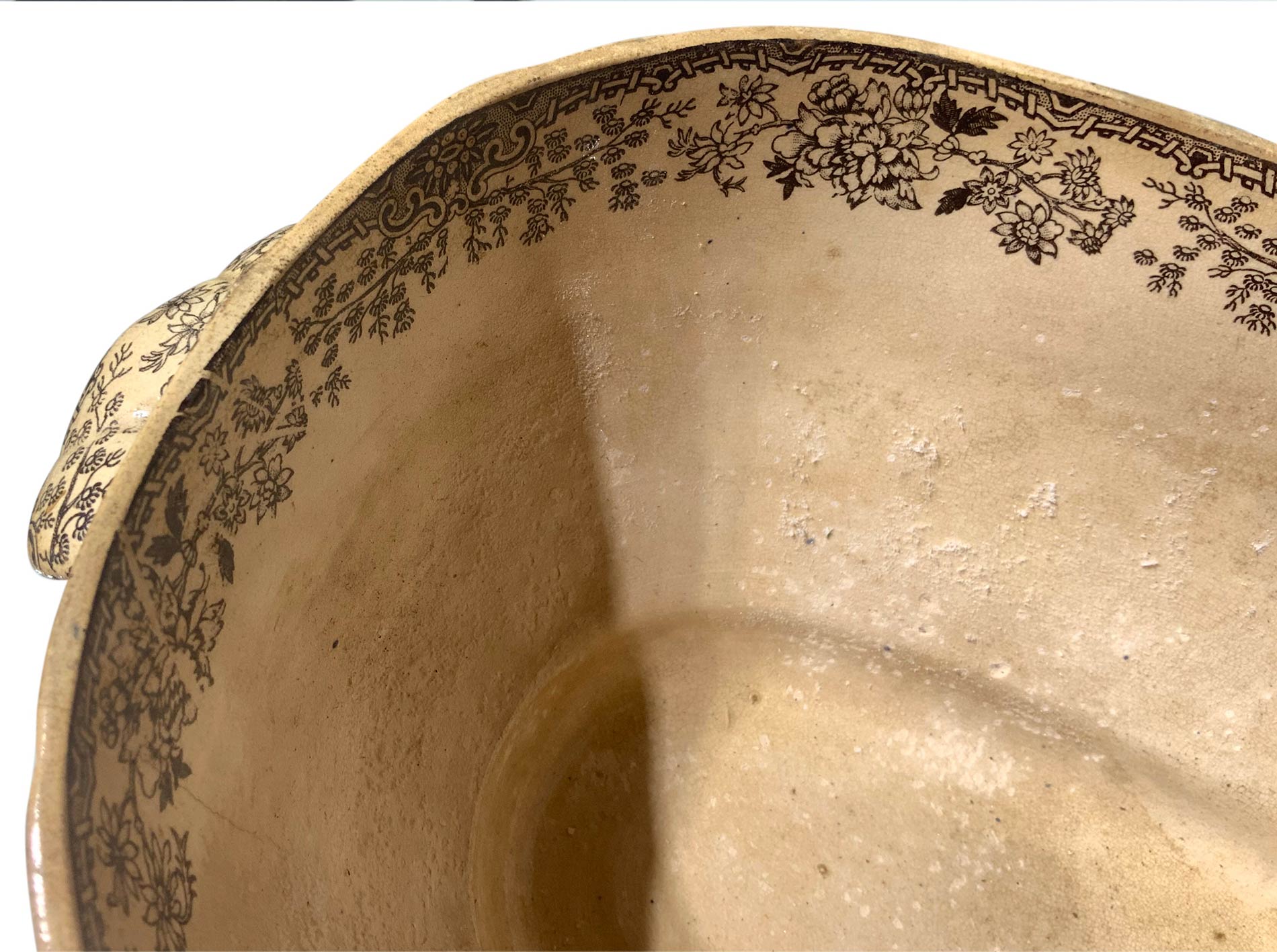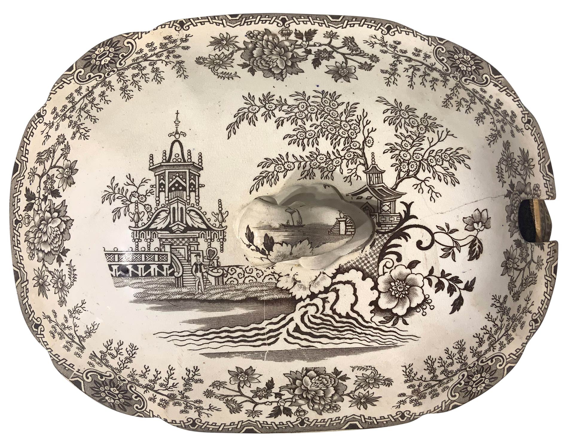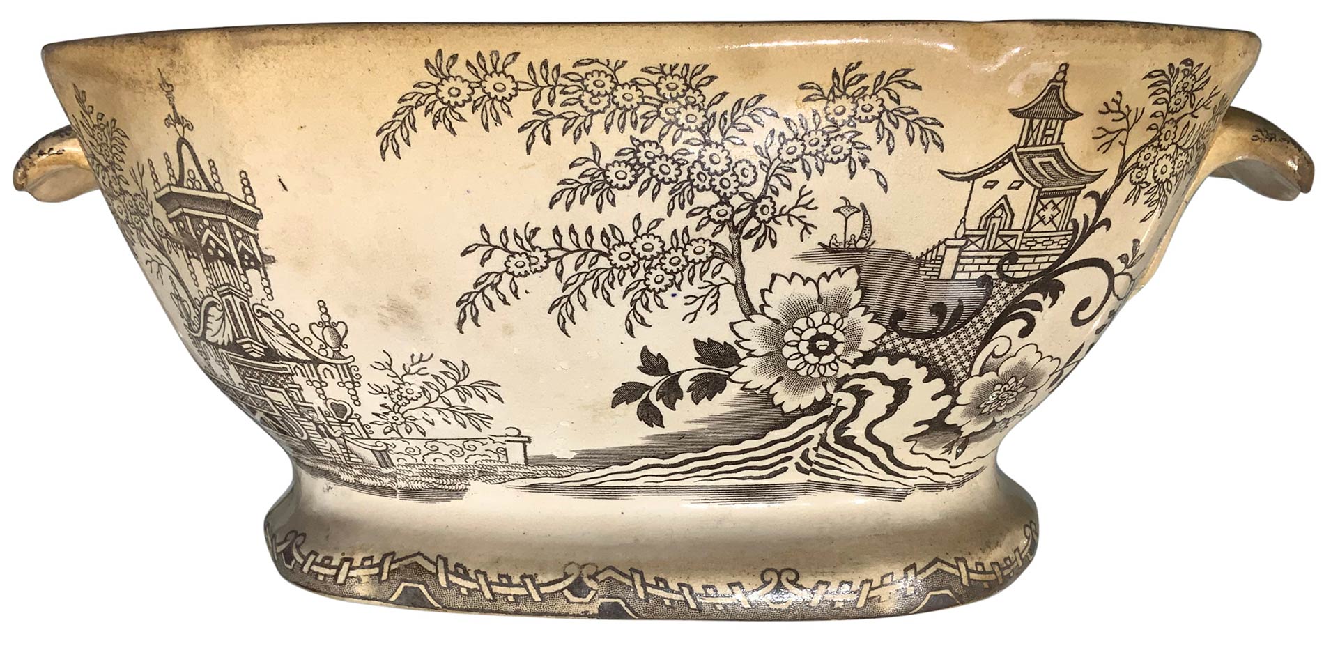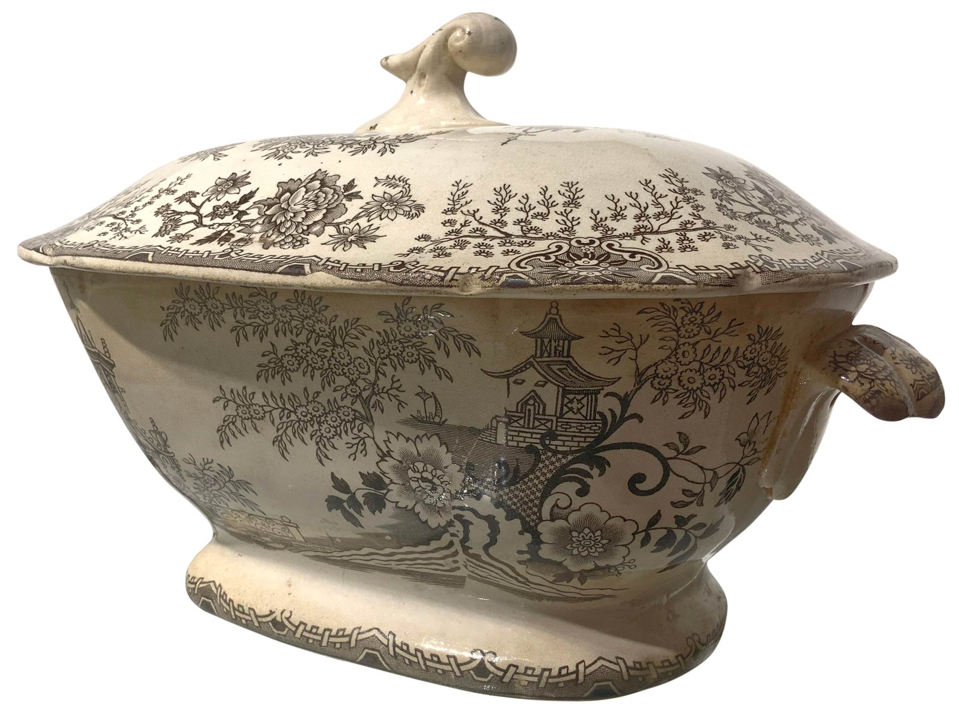 Zuppiera nei toni del marrone raffigurante paesaggi e pagoda. XX Secolo. Filato