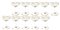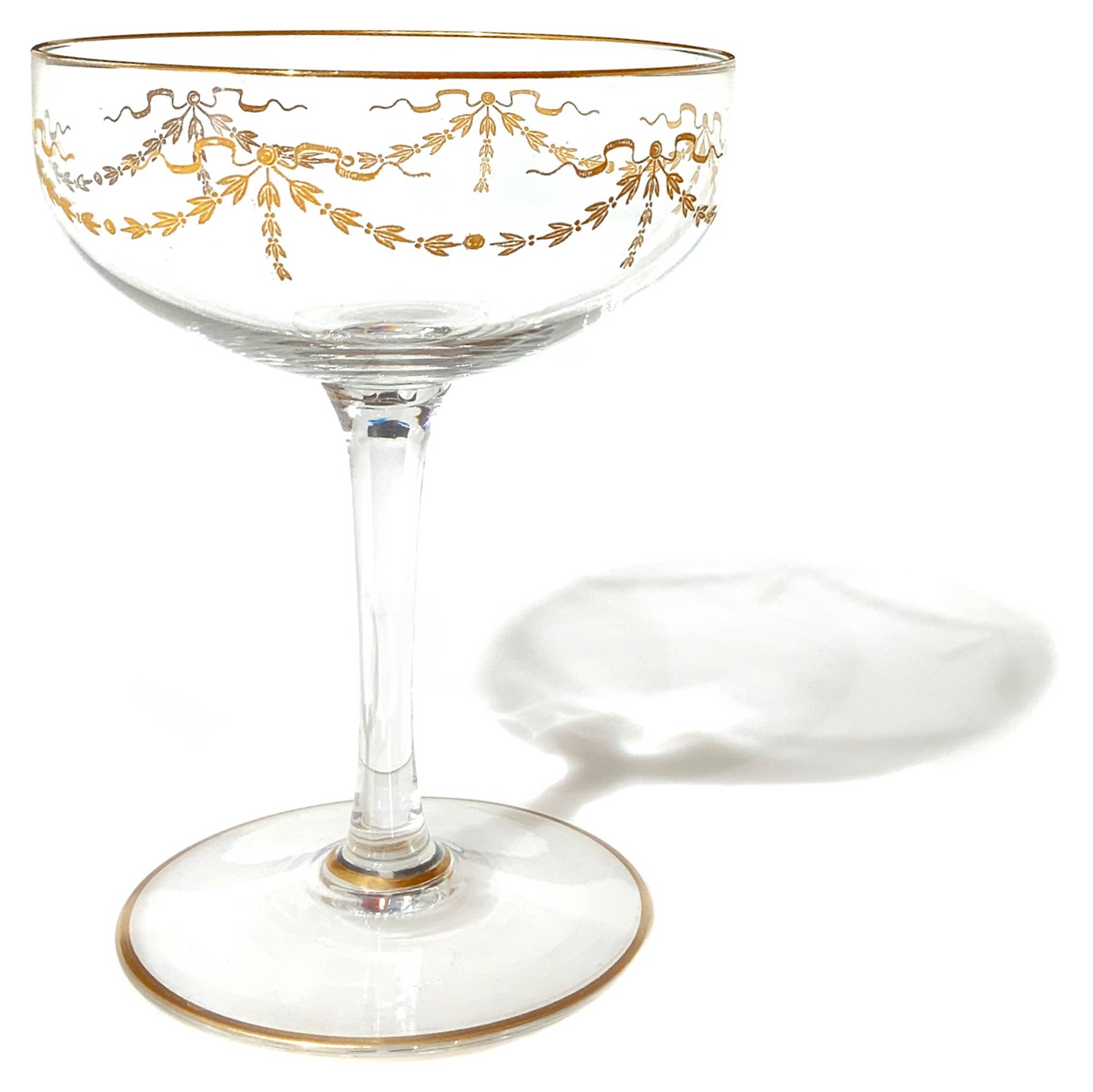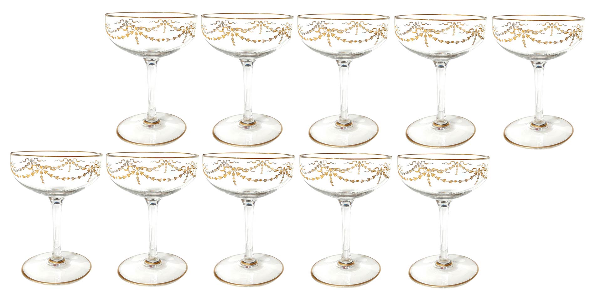 Servizio di 12 bicchieri da champagne in cristallo con merletto in colore oro.