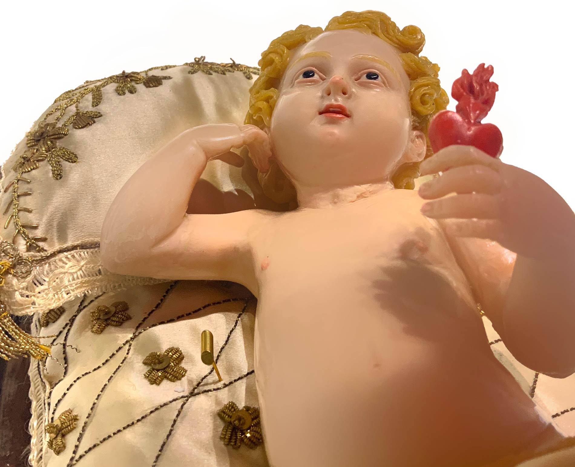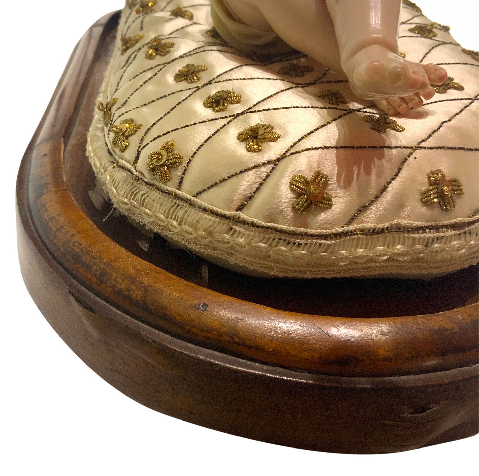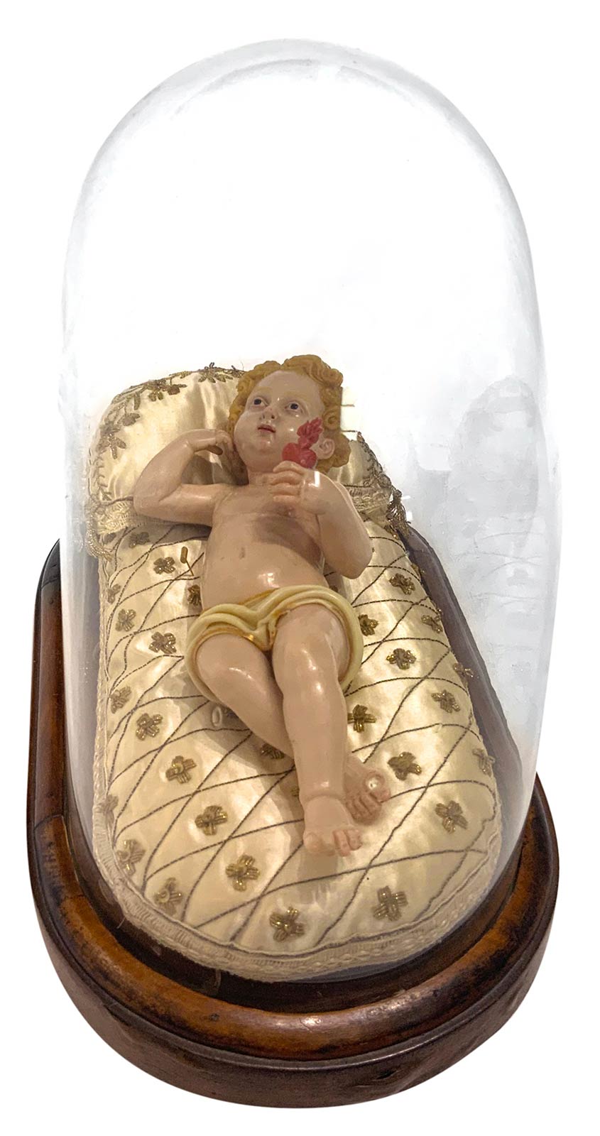 Lotto 113 | Bambinello in cera in teca di vetro originale. XIX secolo. Bambinello Cm 24....