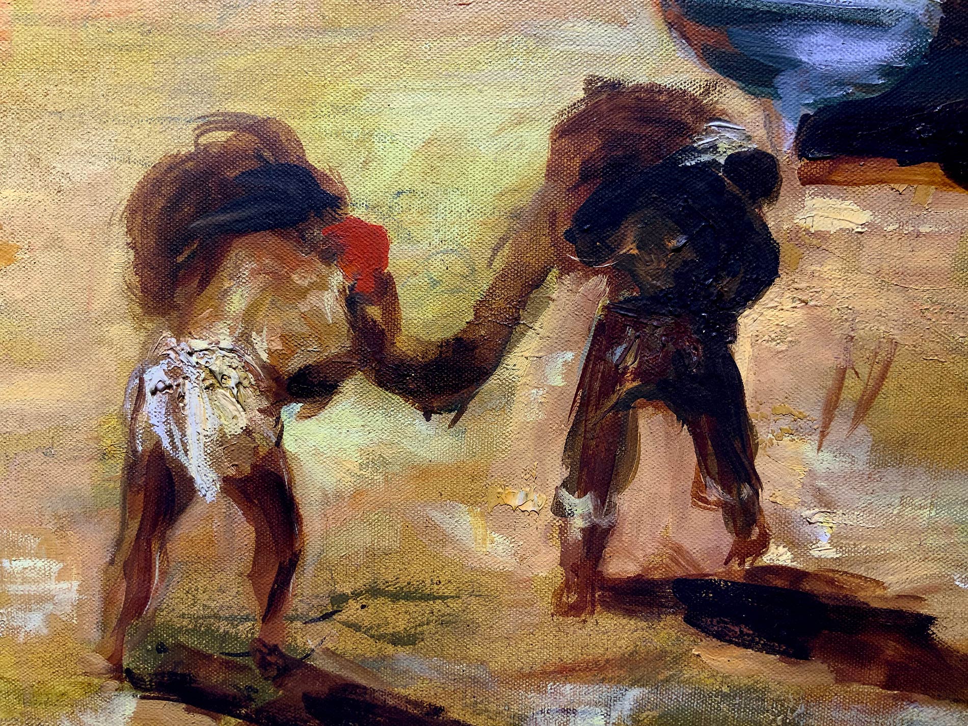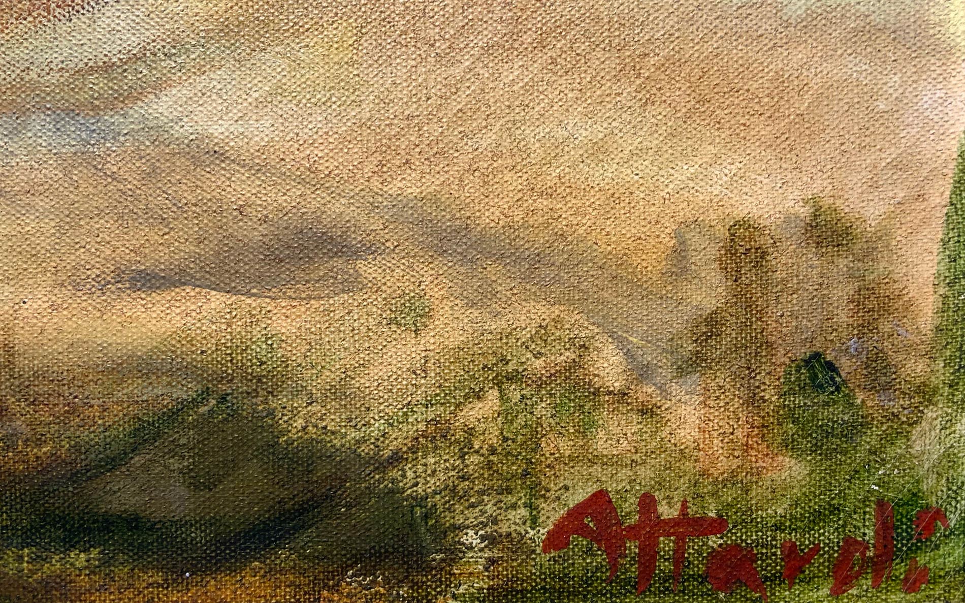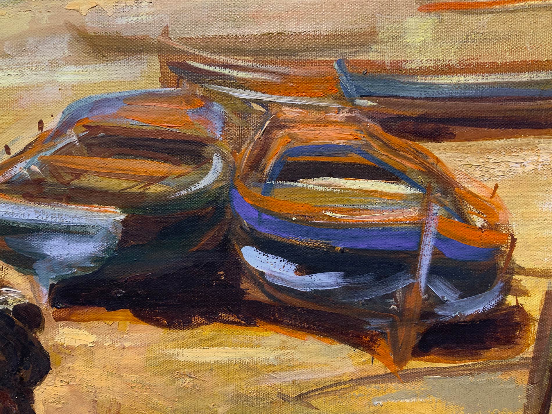 Ugo Attardi (1923, Genova-2006, Roma). Paesaggio con barche. 48x92, olio su tela. Firmato in basso a destra. Firmato e datato 957 su retro.