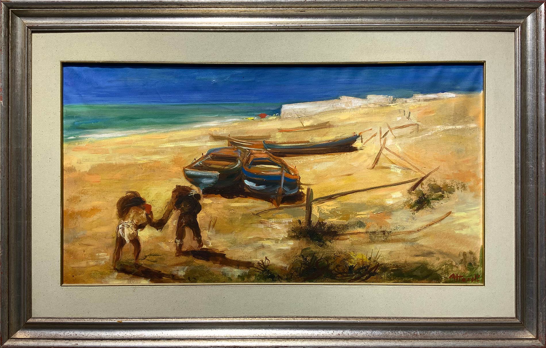 Ugo Attardi (1923, Genova-2006, Roma). Paesaggio con barche. 48x92, olio su...