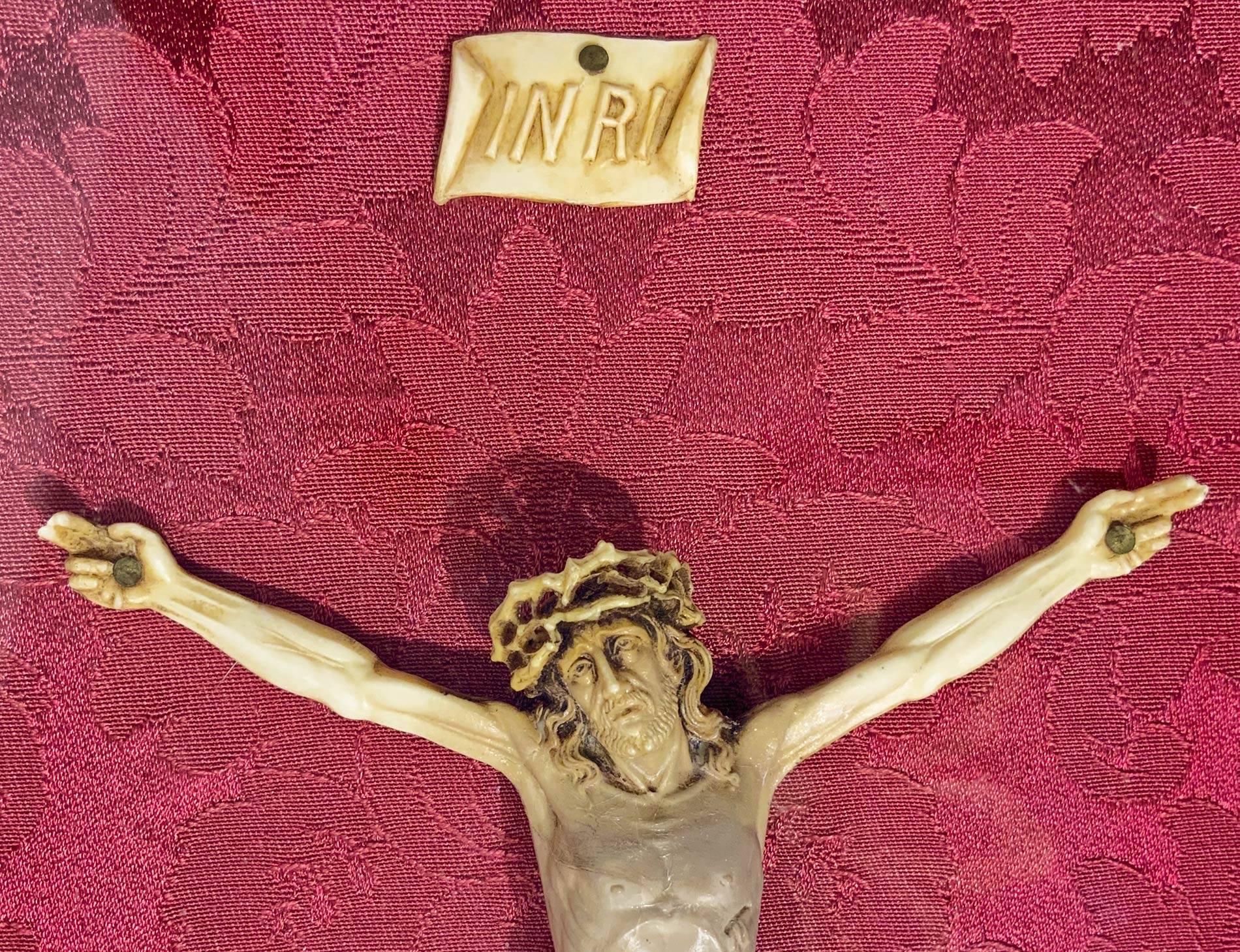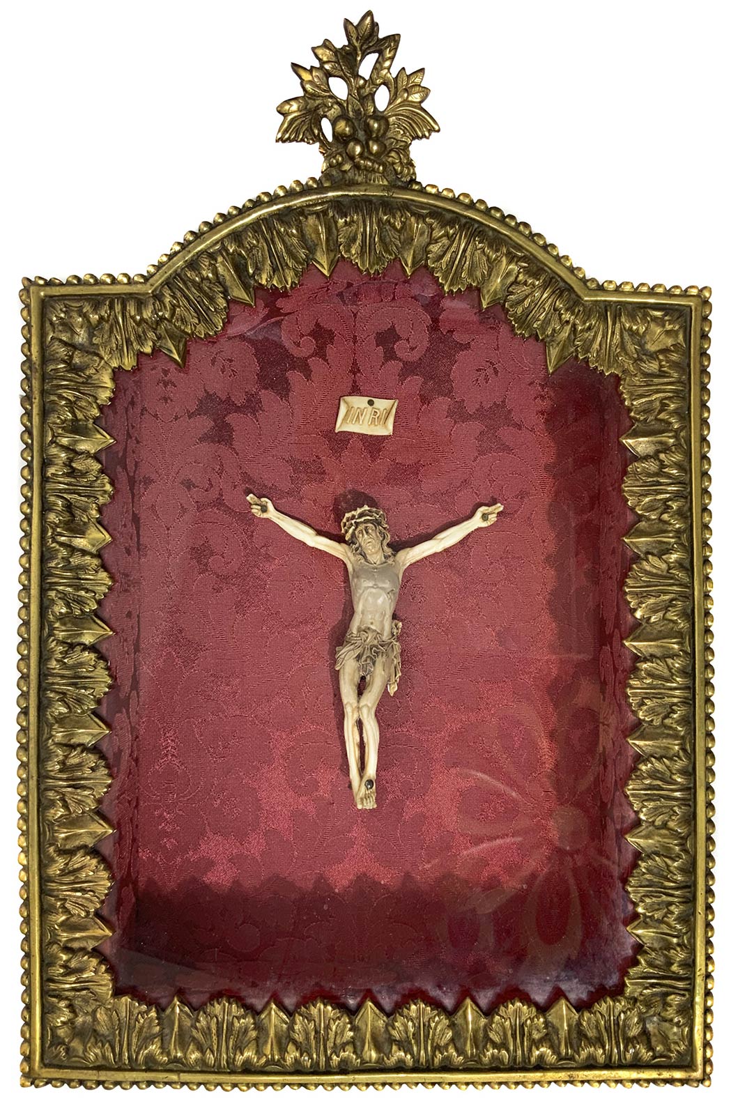 Piccolo Cristo in bacheca in bronzo dorato del XIX Secolo. Cm 37x25,5
