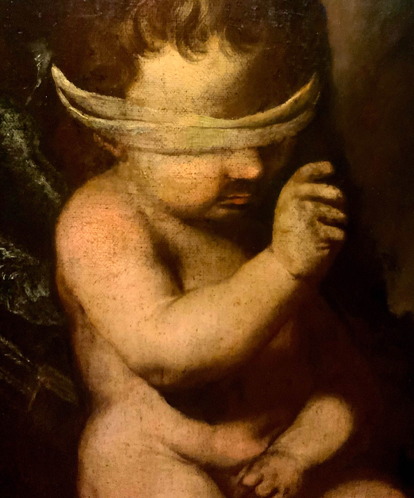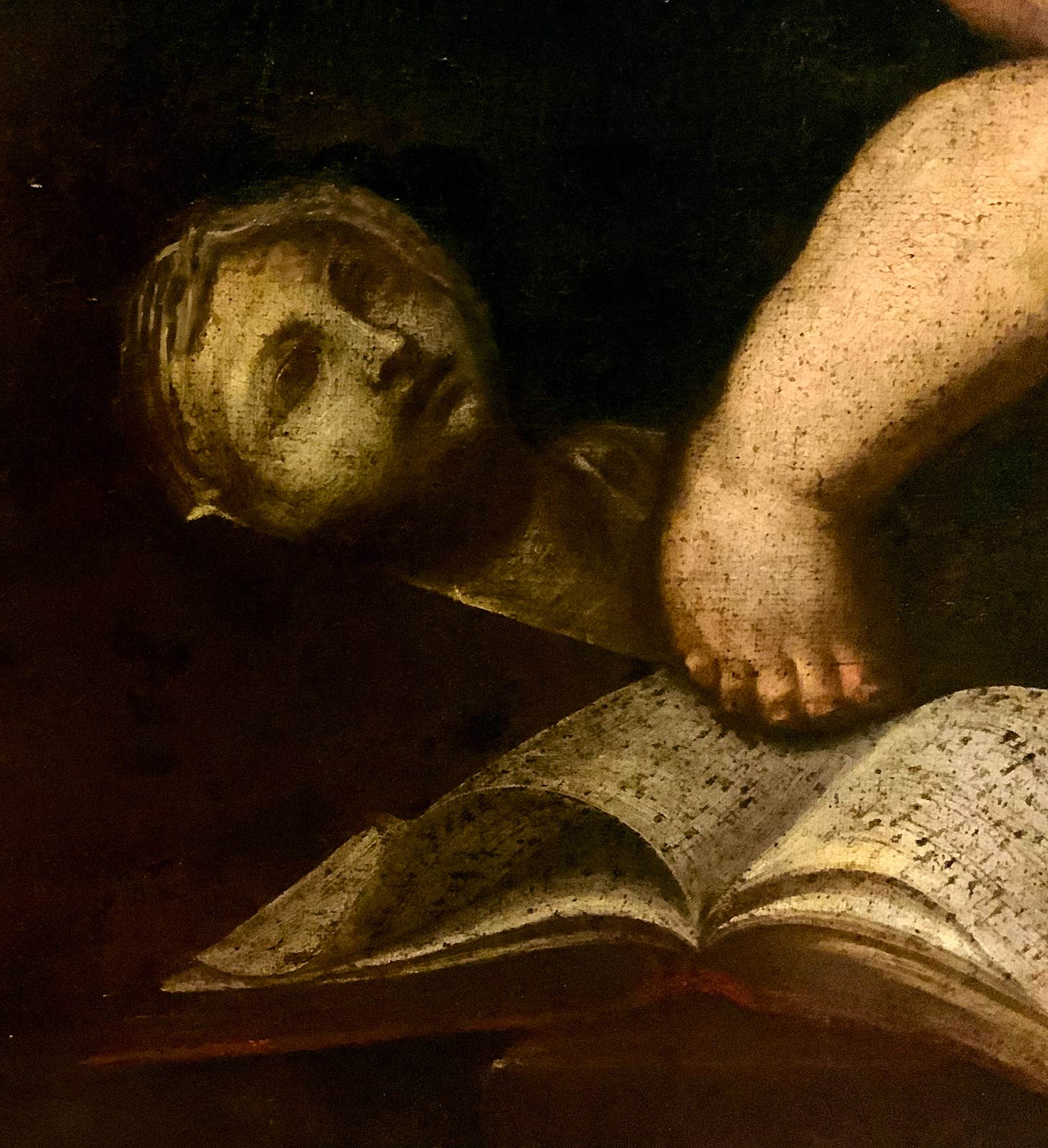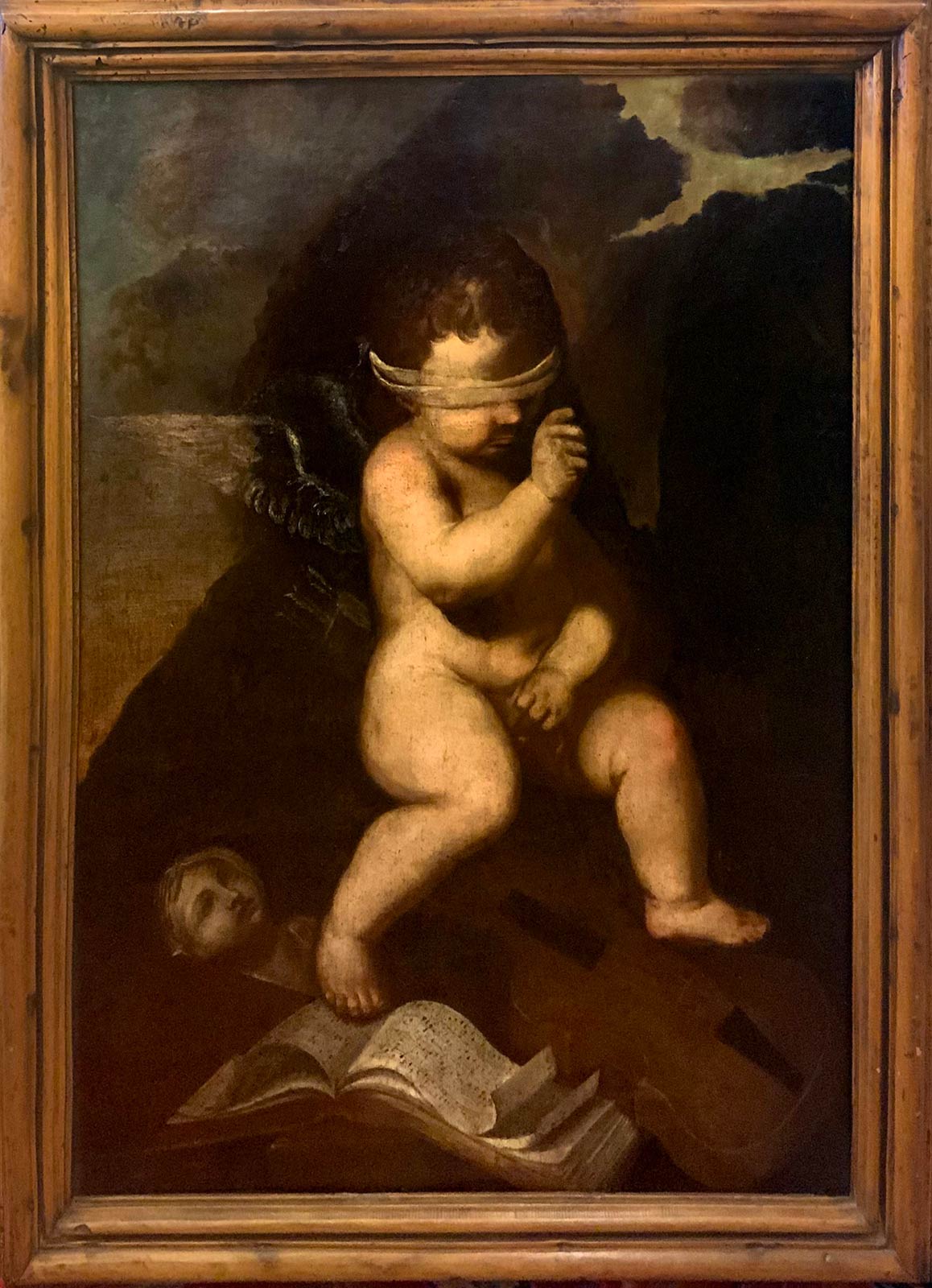 Pittore bolognese del XVII/XVIII Secolo, Cerchia di Cignani Carlo. Allegoria della musica e della poesia. La benda indica che le arti della musica e della poesia sono apprezzabili senza l'aiuto della vista. Cm 95x72, olio su tela.
