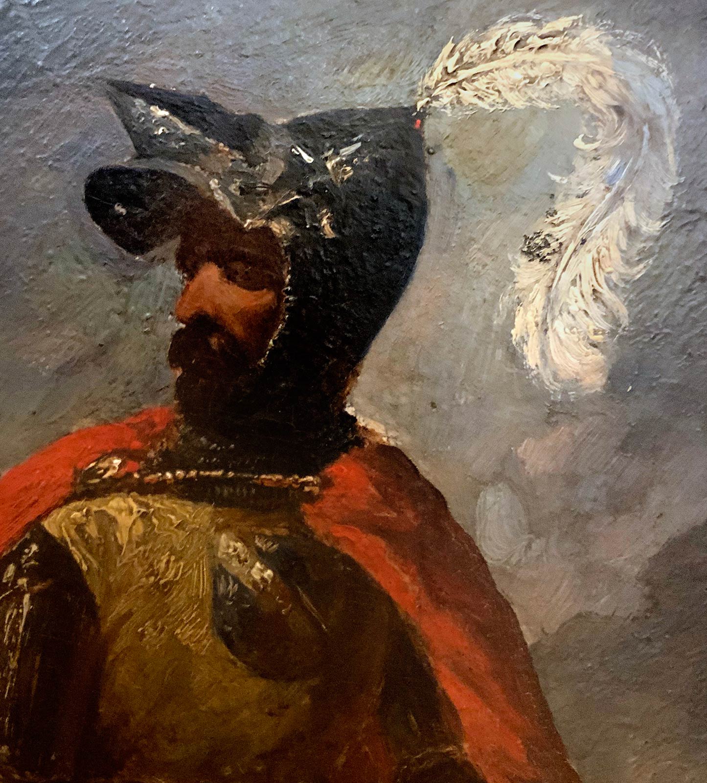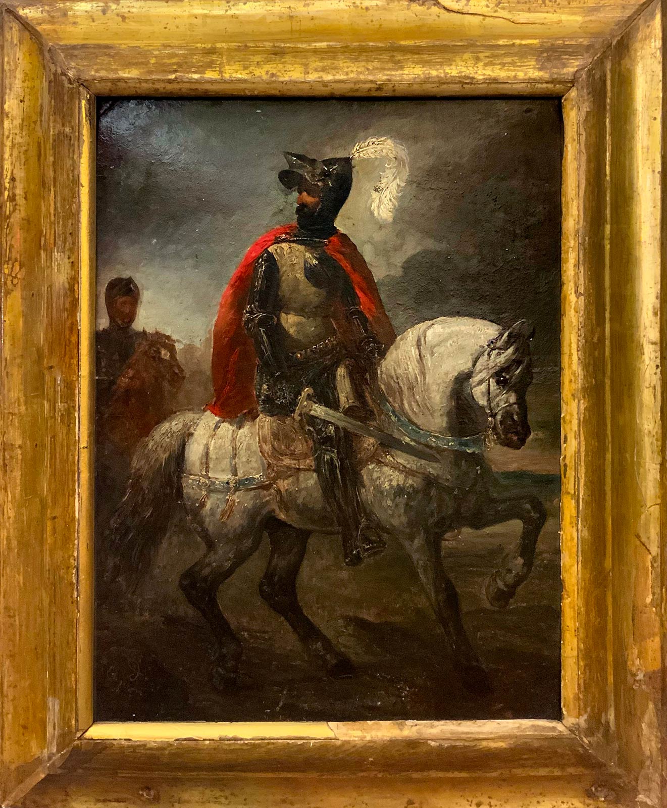 Charles Dominique Joseph Eisen (1720- 1778). Don Chisciotte della Mancia. 45x34, olio su papier machè. Siglato con monogramma
