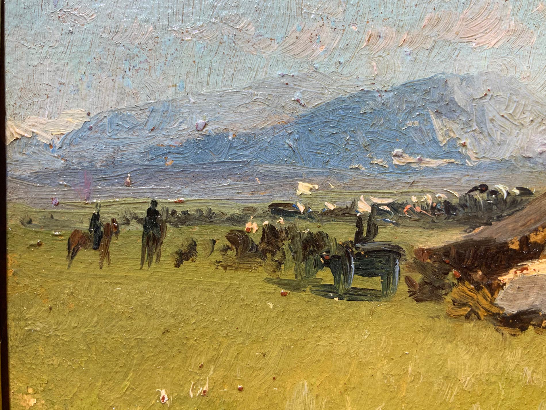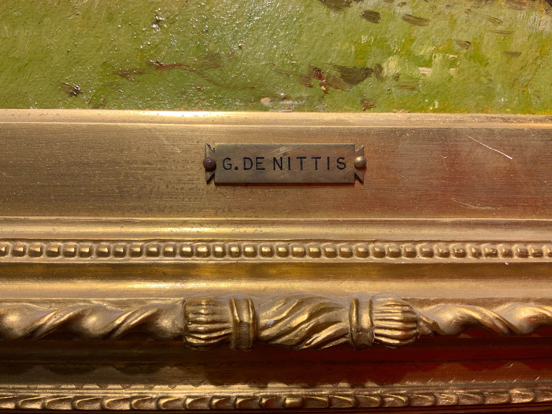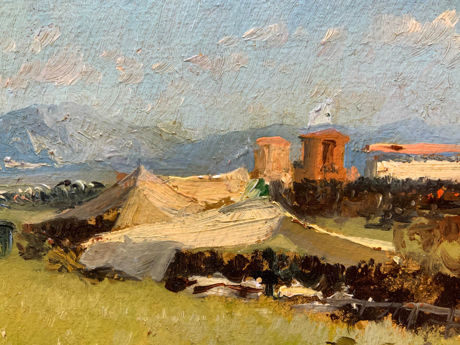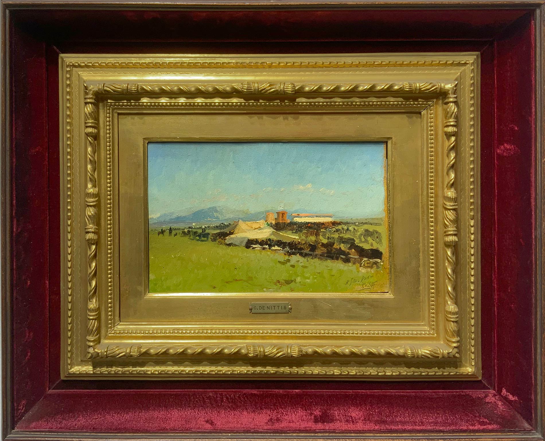 Pittore italiano del XIX secolo. Accampamento militare. 15,5x24, olio su cartone. Firmato De Nittis in basso a destra e dedicato. Datato sul retro 21 Aprile 1879.