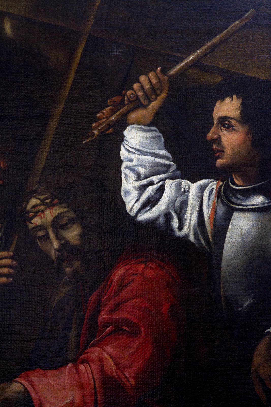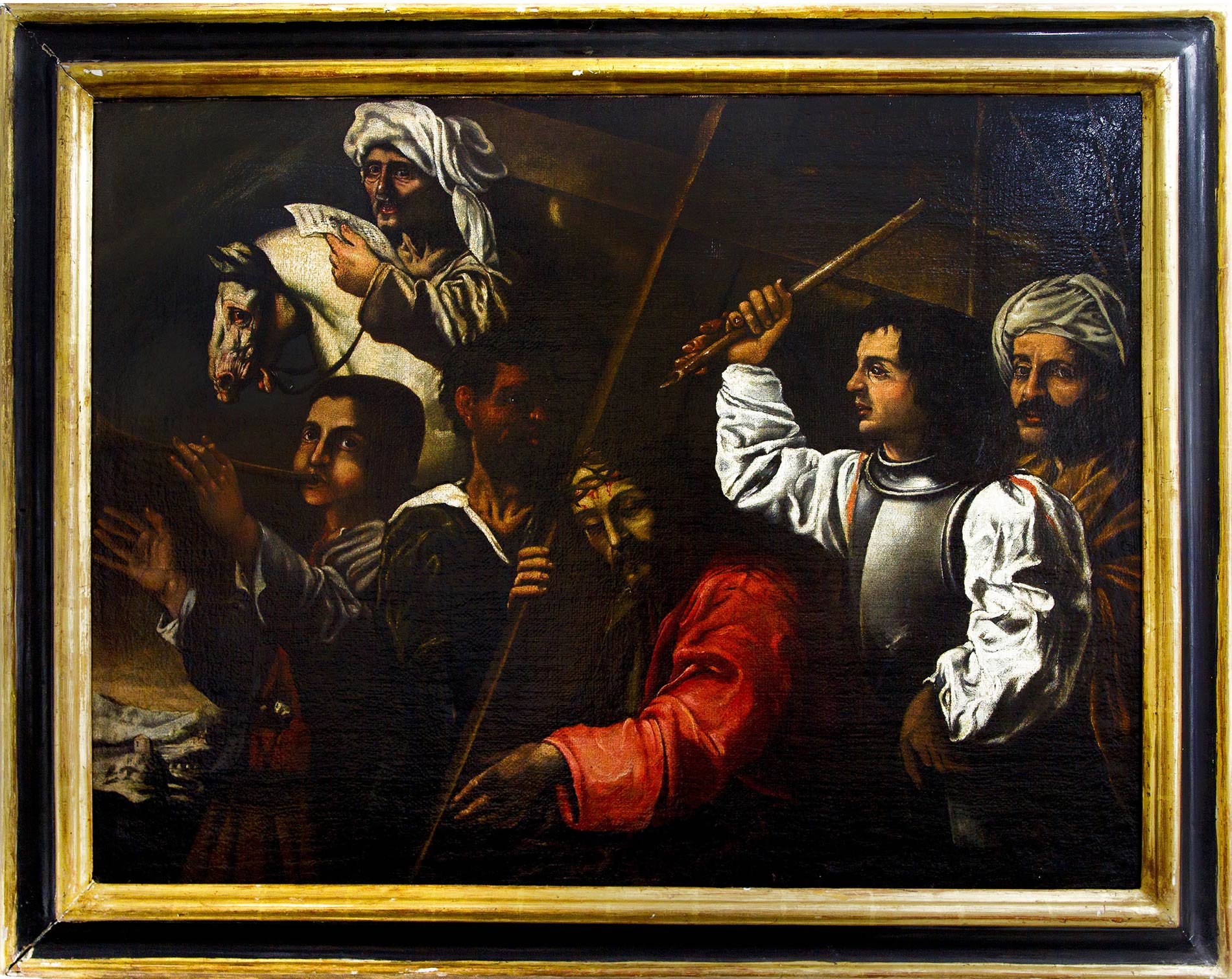 Pittore siciliano del XVII Secolo. Dipinto caravaggesco raffigurante Cristo Crucifero in ascesa al calvario attorniato da personaggi. Mario Minniti (attrib.). 75x103, Olio su tela Opera sicuramente del periodo romano, dove il Minniti, frequentando la bottega di Lorenzo Siciliano, ha avuto modo di conoscere e accompagnarsi a Michelangelo Merisi detto ""Il Caravaggio"". Questa frequentazione gli permette di assimilare i toni caravaggeschi, che non sono certo da paragonare a quelli del Maestro, ma che risentono in parte di quel chiaroscurale plastico del Caravaggio, di cui era divenuto collaboratore, amico e modello. Infatti, in diverse opere del Caravaggio, é riconoscibile la sua figura, essendosi lui prestato come modello: vedi ad esempio ""Il Fanciullo con Il Canestro di Frutta"", ""Il Concerto"", ""Il Ragazzo Morso dal Ramarro"", ecc. Lo stile del Minniti, si può riassumere nel dipinto in oggetto quale rappresentazione pittorica dai toni discreti, quasi luministici, in cui il colore viene distribuito in un formula atta a mettere in risalto gli aspetti formali del dipinto, anziché quelli plastici. Per tali motivi, la pittura del Minniti ebbe un discreto successo al suo rientro in Sicilia (1606), tra le varie committenze locali.