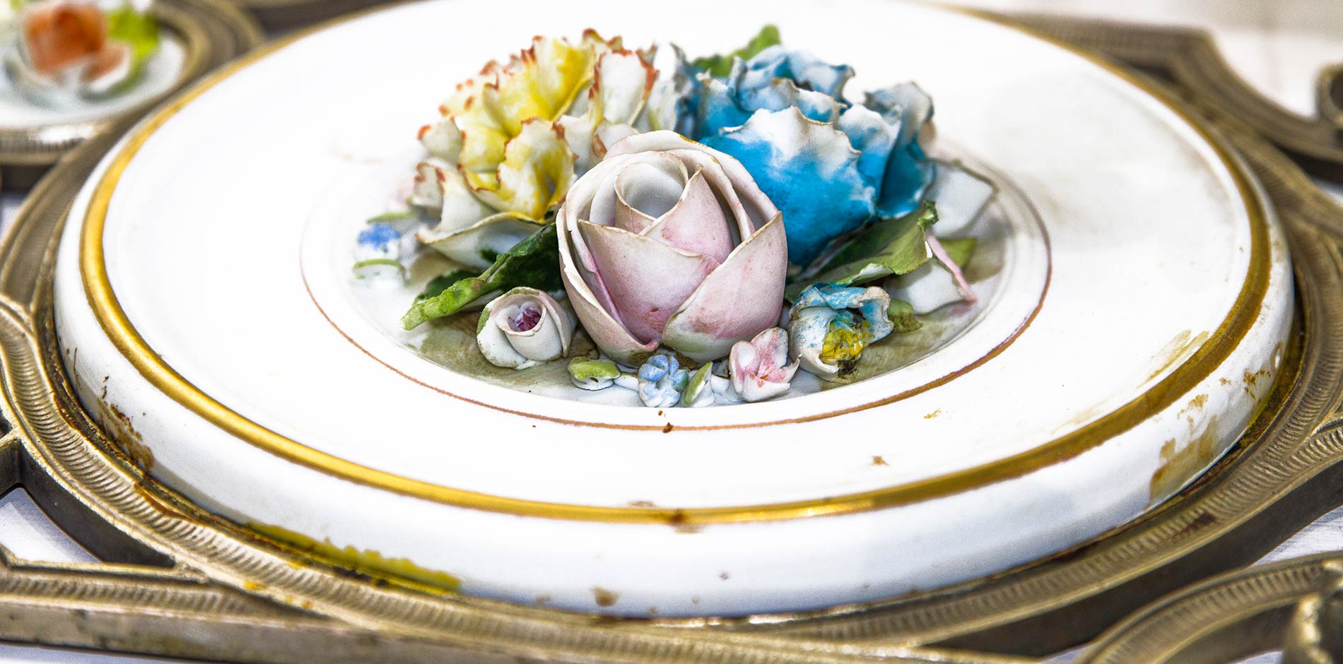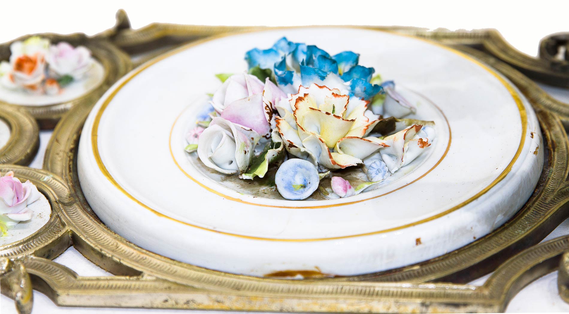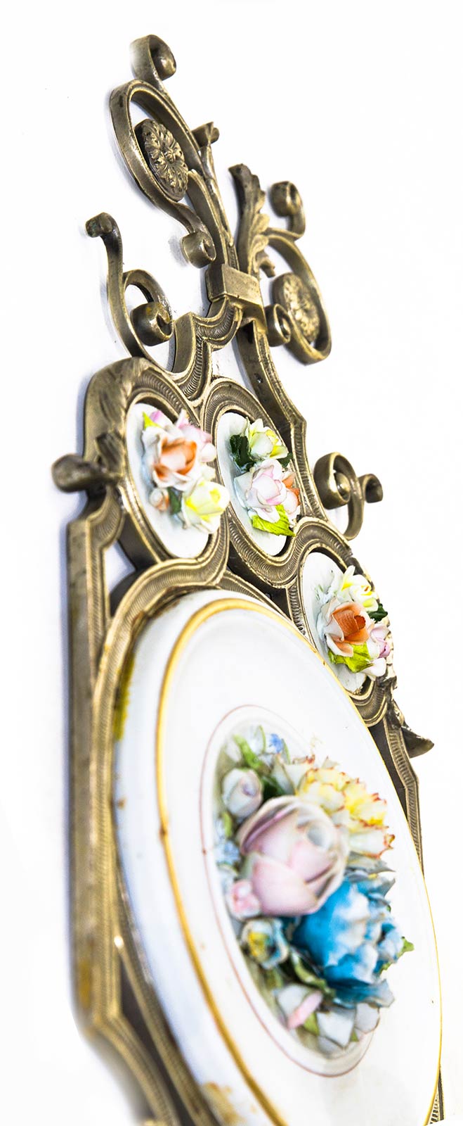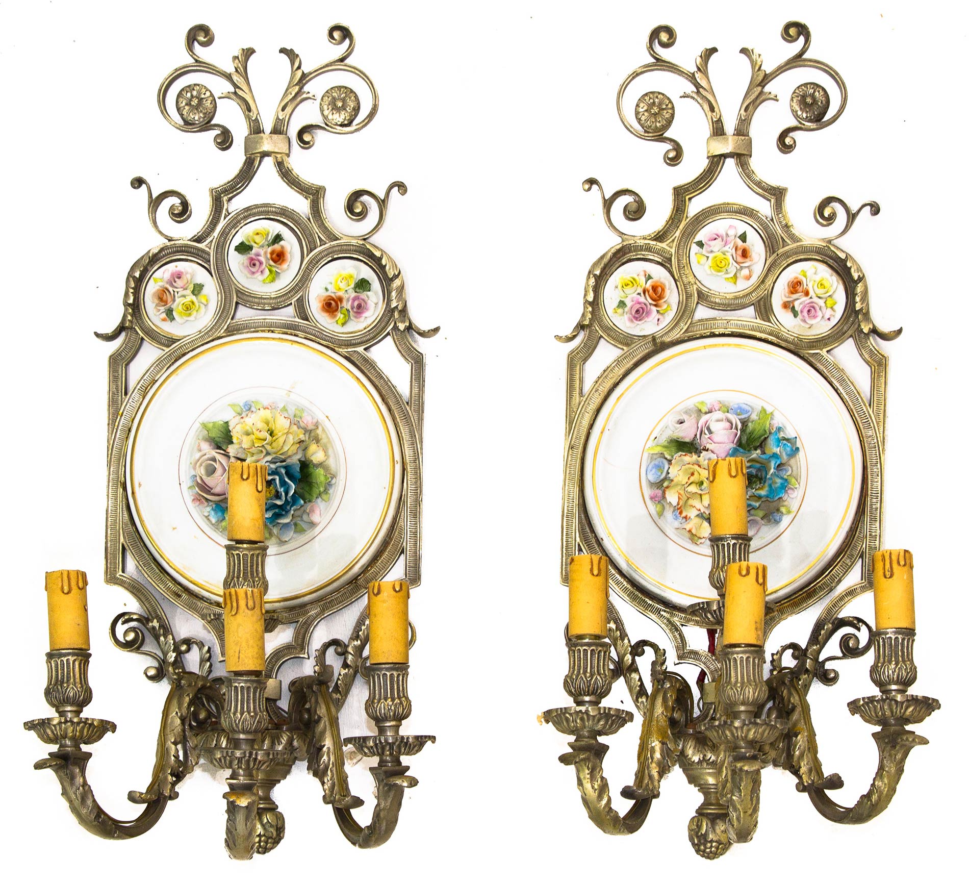 Coppia di applique in metallo con porcellana di Capodimonte. 4 luci