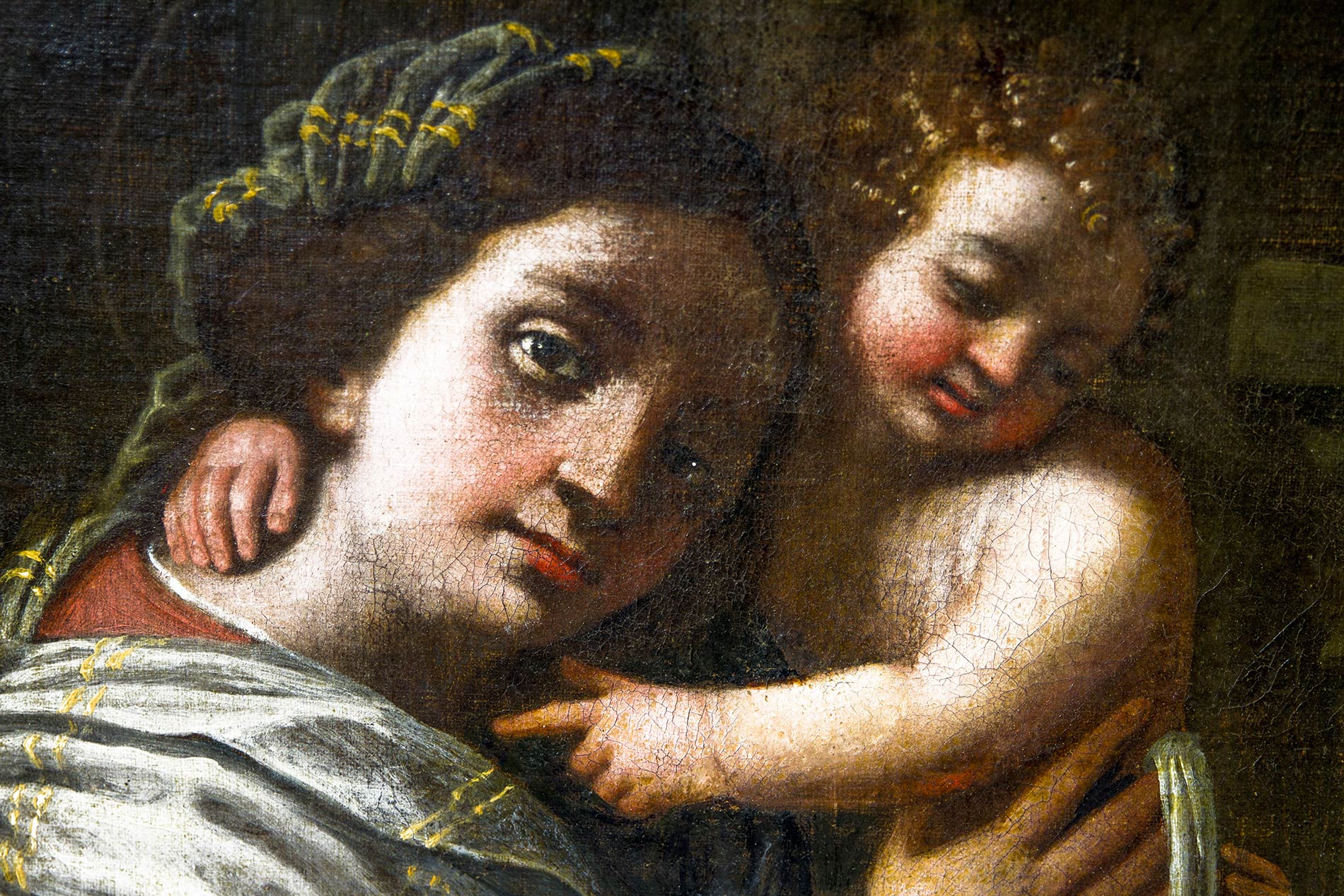 Pittore italiano del XVIII Secolo. Madonna con bambino e S.Giovannino. 90x71. Olio su tela