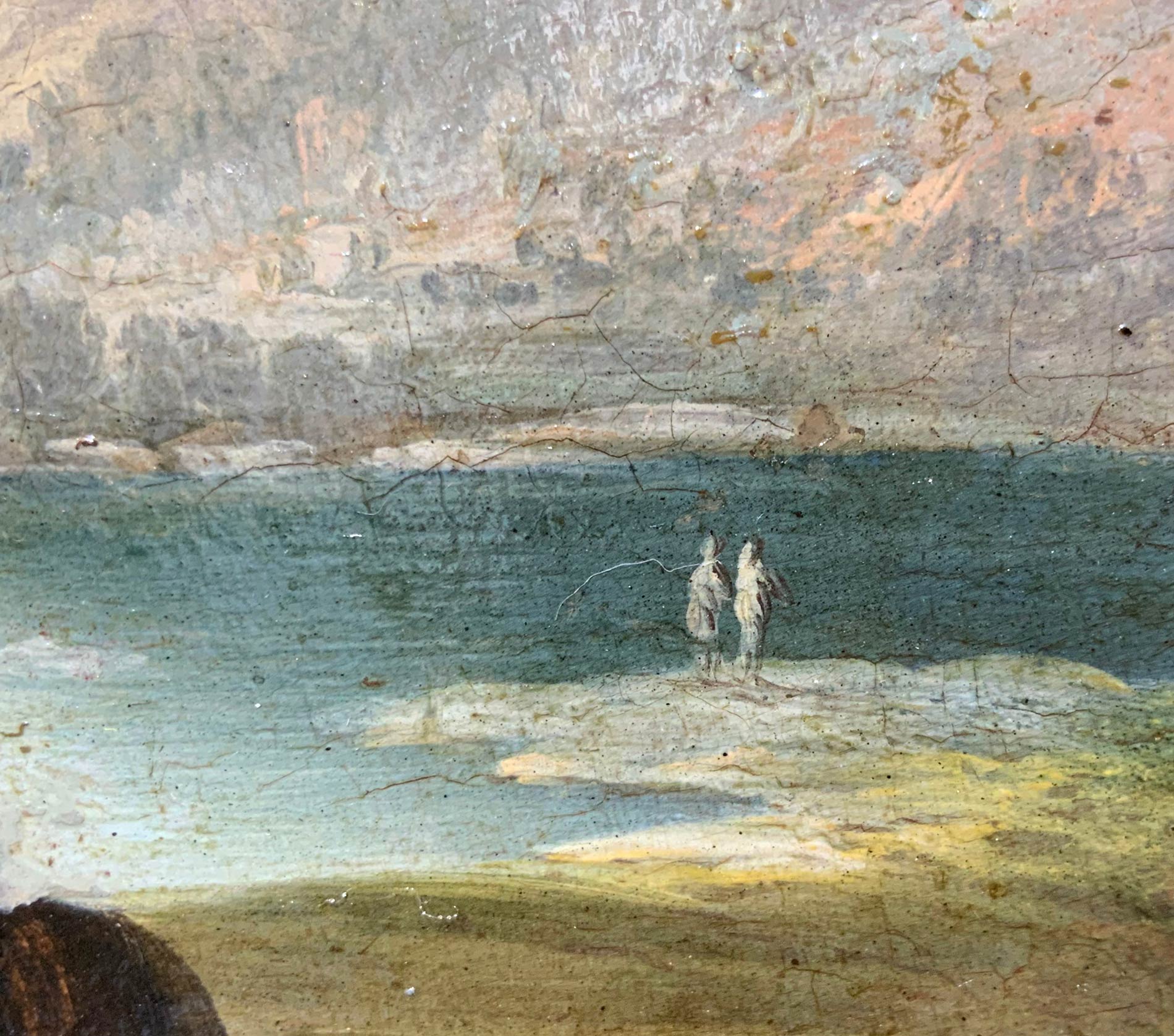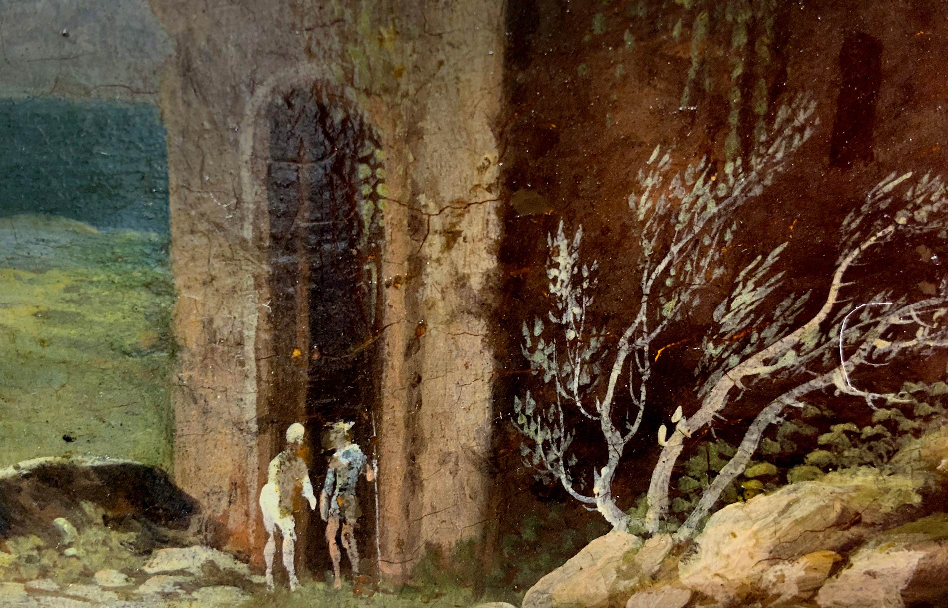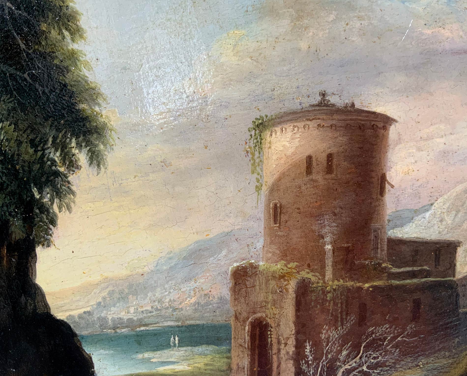 Pittore della seconda metà del XVIII Secolo. Tondo con paesaggio ed architettura, torre. Diametro 27, olio su tavola. Antica collezione Notaio Cav. Fazio.
