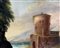Pittore della seconda metà del XVIII Secolo. Tondo con paesaggio ed architettura, torre. Diametro 27, olio su tavola. Antica collezione Notaio Cav. Fazio.