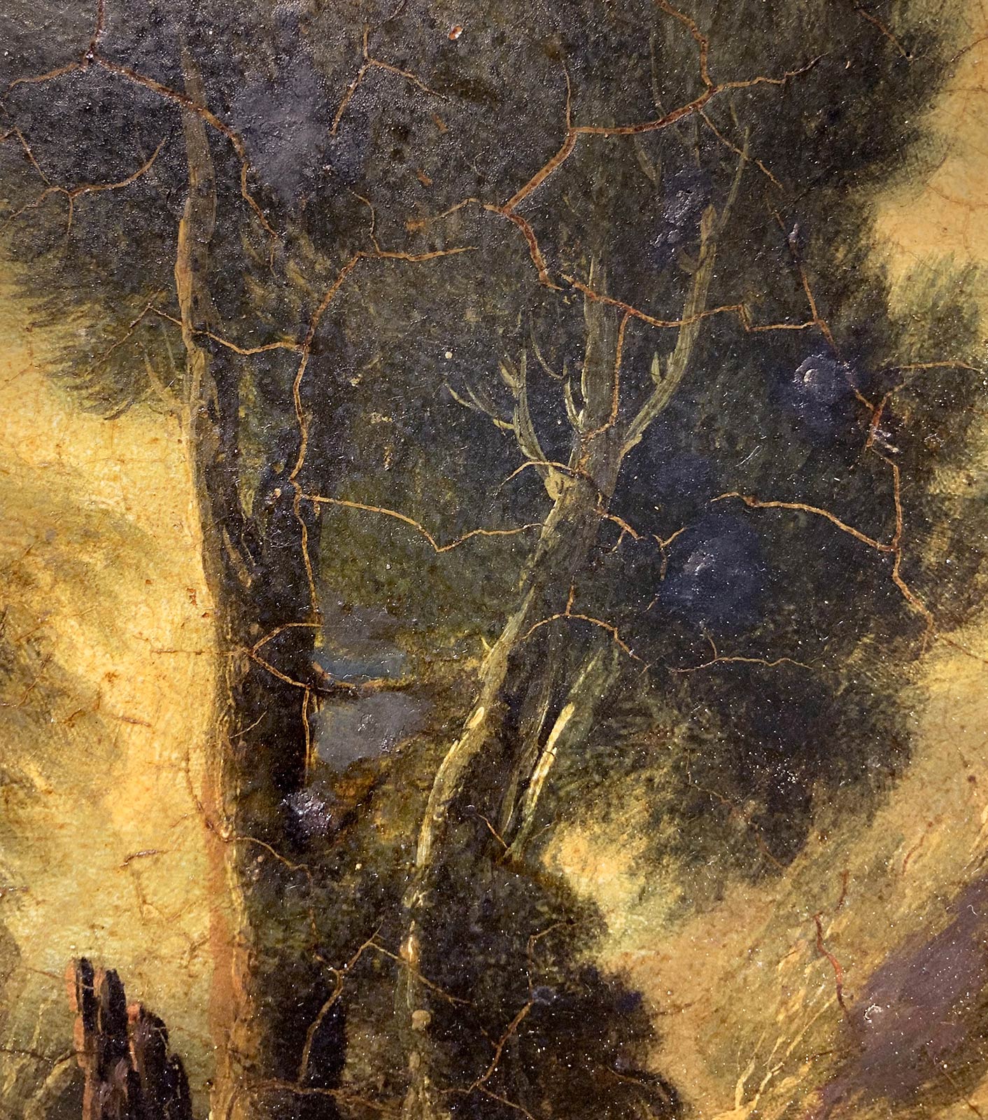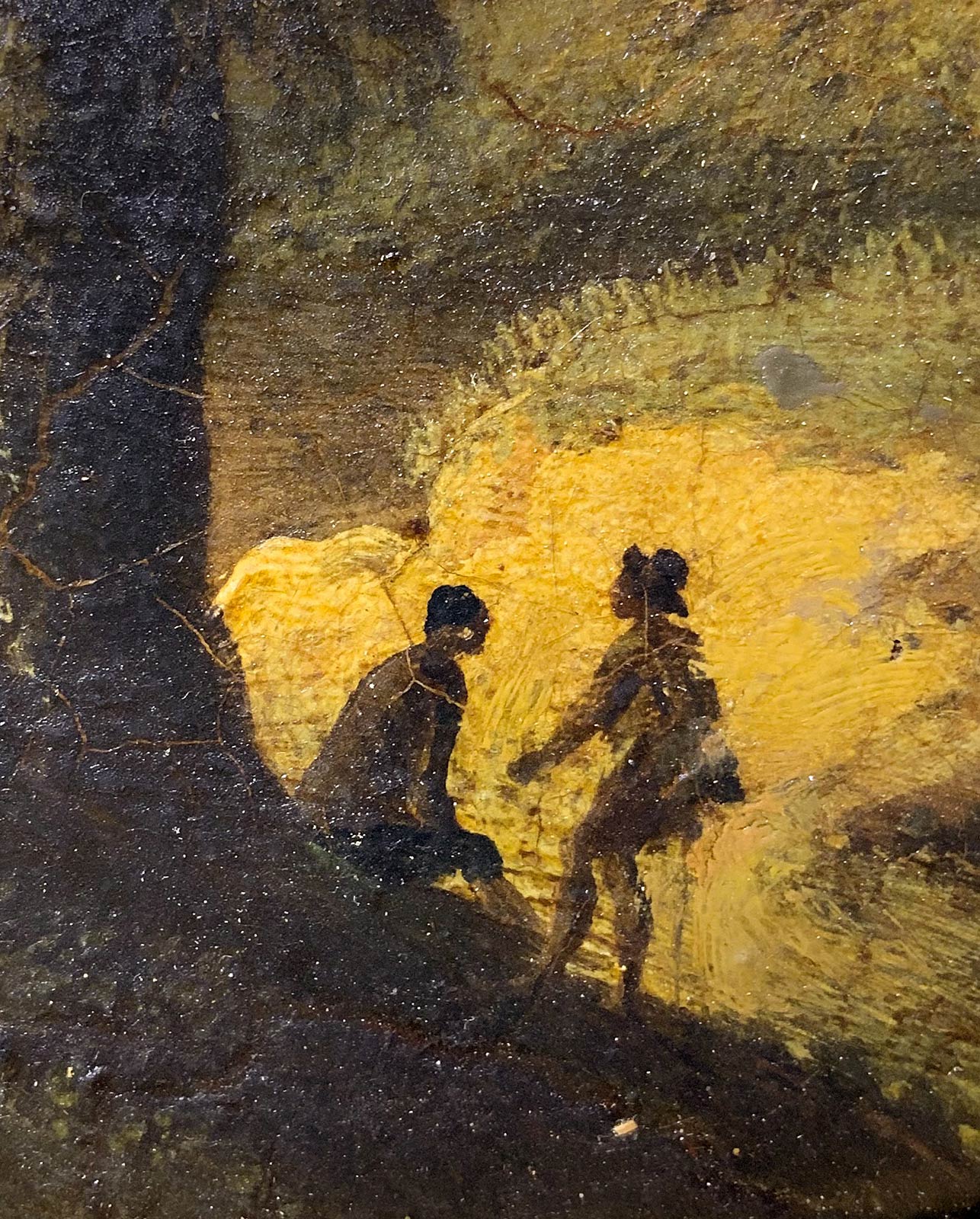 Pittore della seconda metà del XVIII Secolo. Tondo con paesaggio bucolico e figure. Diametro 27, olio su tavola. Antica collezione Notaio Cav. Fazio. Superficie del dipinto risulta interessata dalla presenza di uno strato di vernice ossidata e ingiallita.