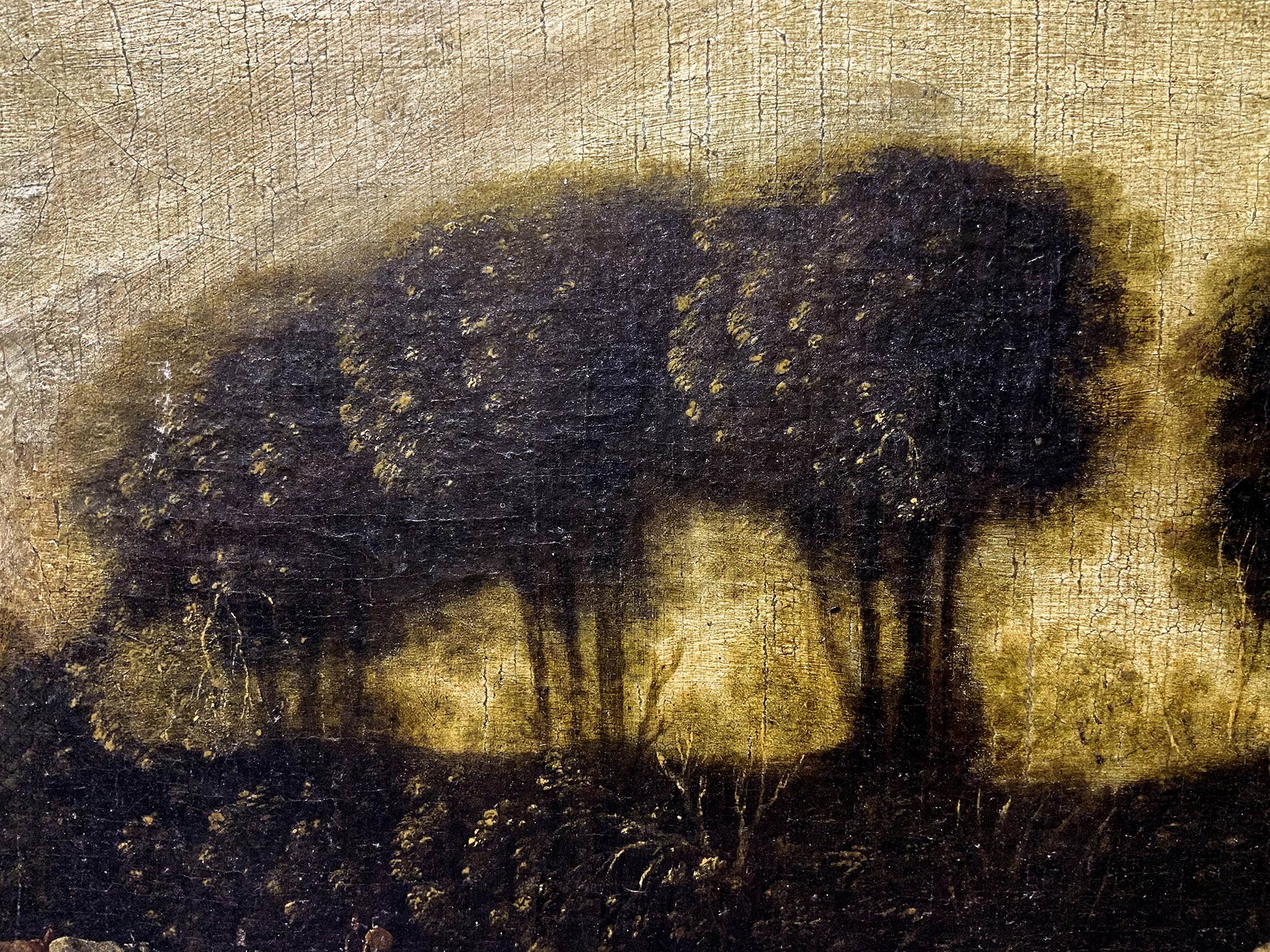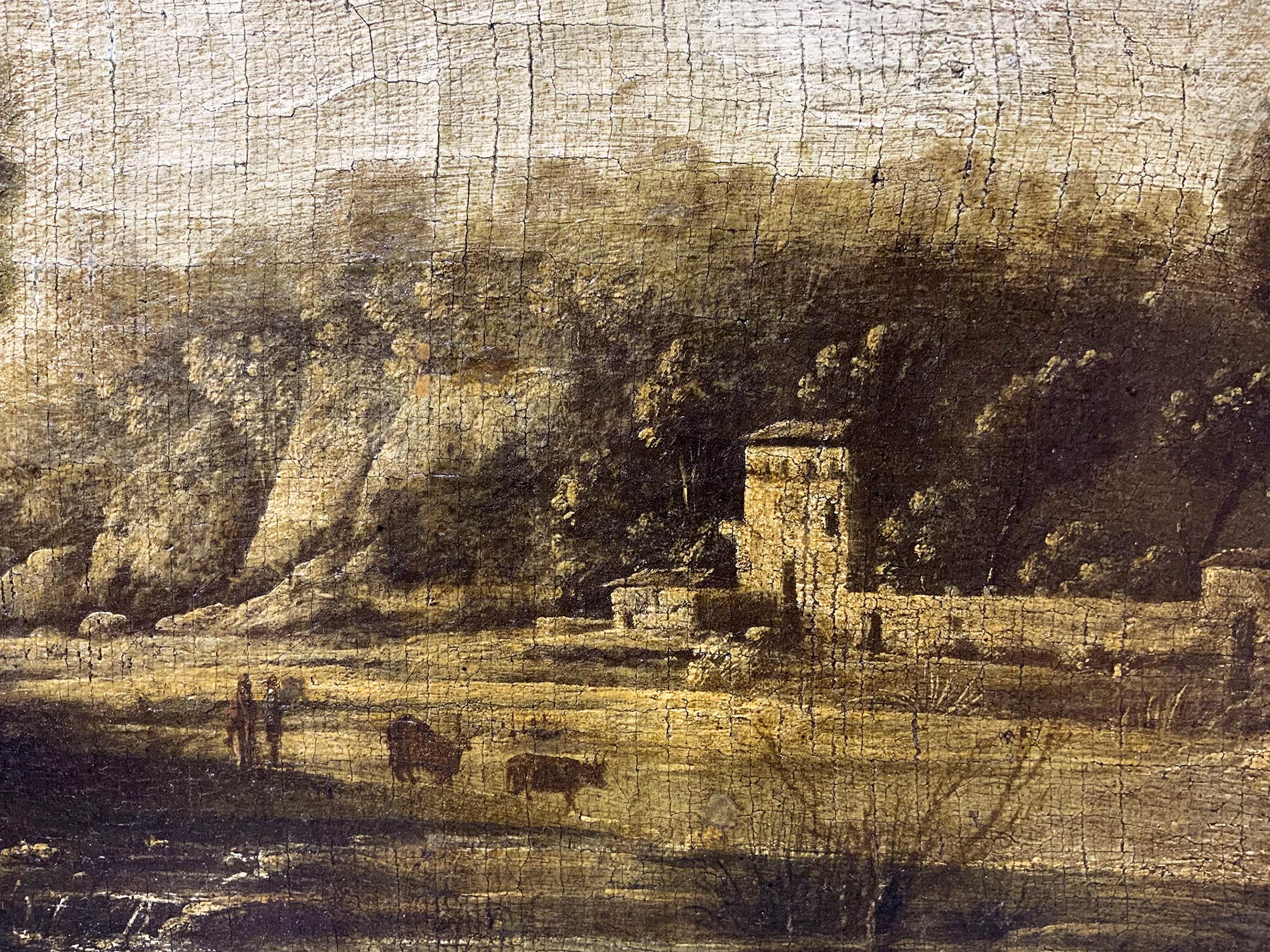 Pittore italiano del inizi XIX Secolo. Paesaggio bucolico con casa sul lago. 50x75, olio su tela. Piccolo foro. Antica collezione Notaio Cav. Fazio. Superficie del dipinto risulta interessata dalla presenza di uno strato di vernice ossidata e ingiallita.