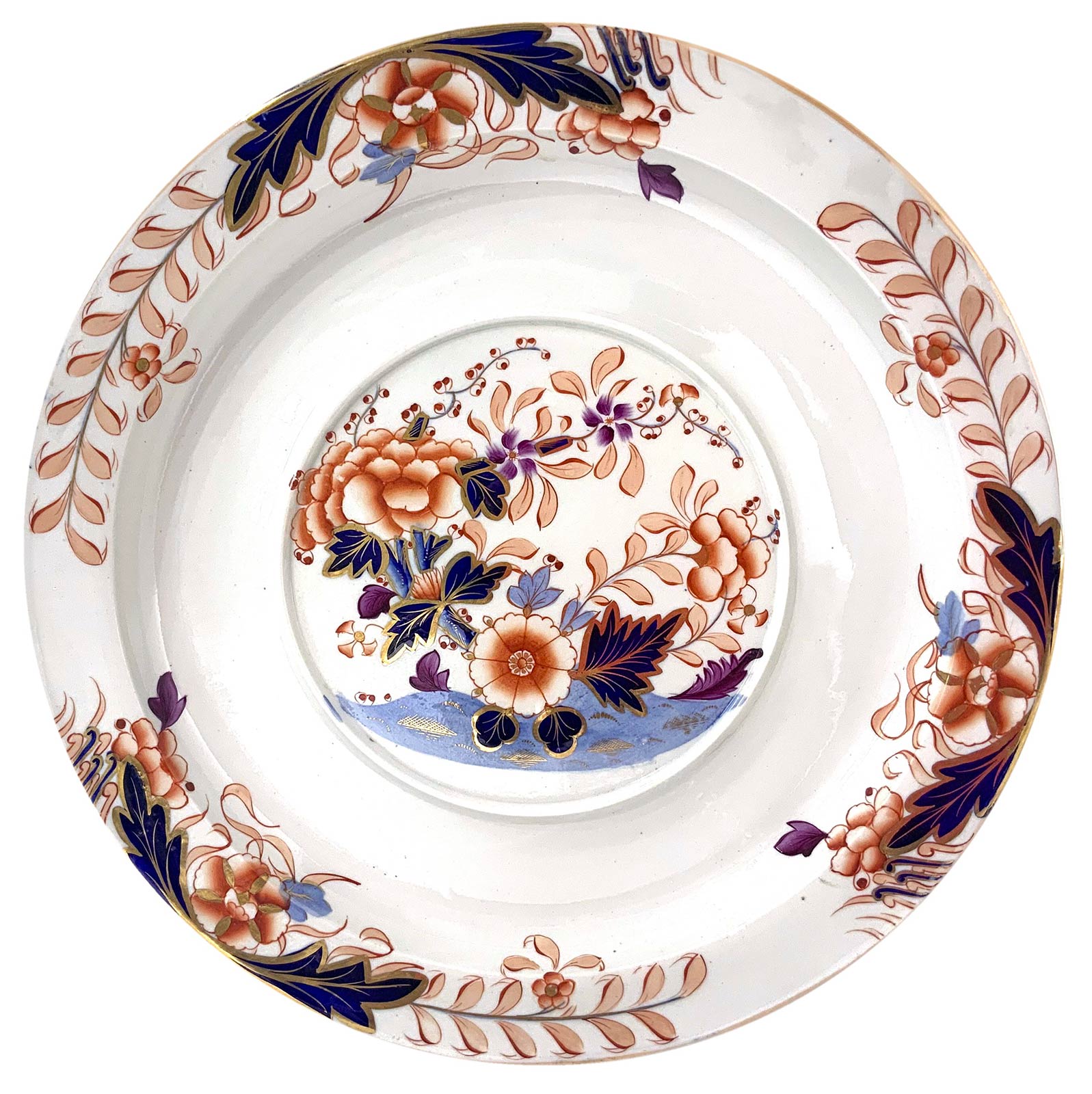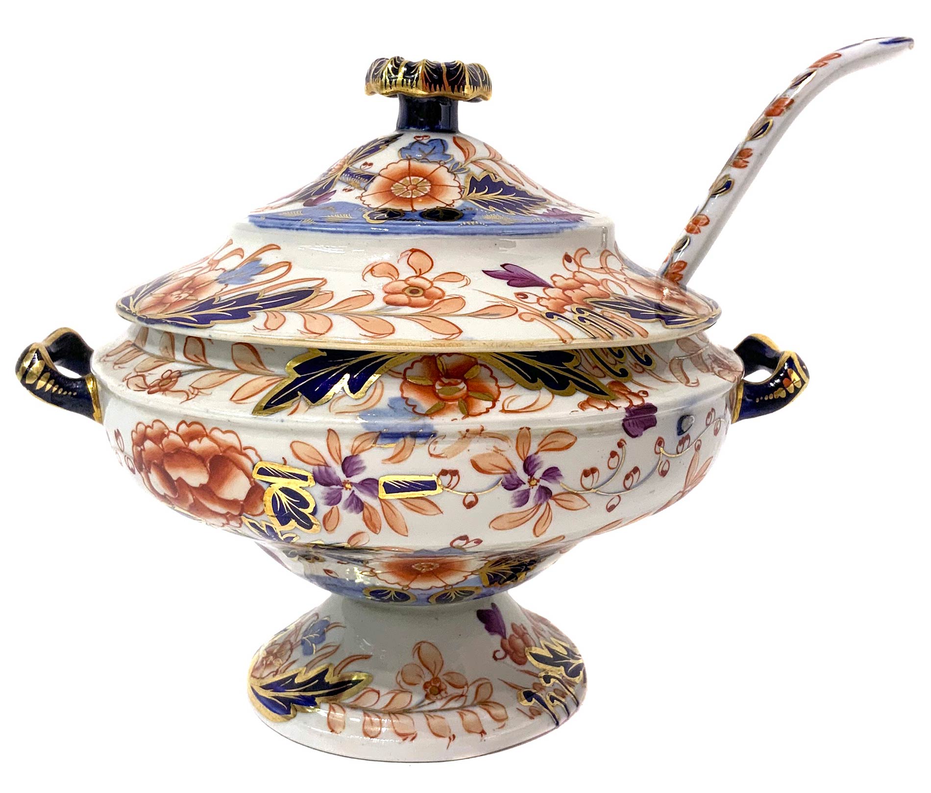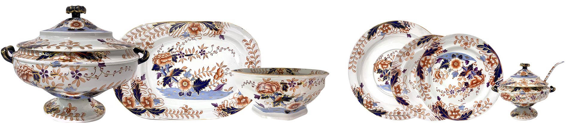 Servizio Davenport Longport Imari China, Servizio di piatti in porcellana, XIX secolo. Composto da 18 piatti piani, 9 piatti fondi, 2 piatti da portata ovali cm 36, 1 piatto da portata grande ovale cm 50, 1 piatto rotondo da portata cm 36, 1 piatto rotondo cm 35, 1 piatto rotondo cm 31, 2 piatti ovali cm 41 Provenienza casa nobiliare, 1 zuppiera, 1 salsiera, 1 insalatiera, 2 mestoli