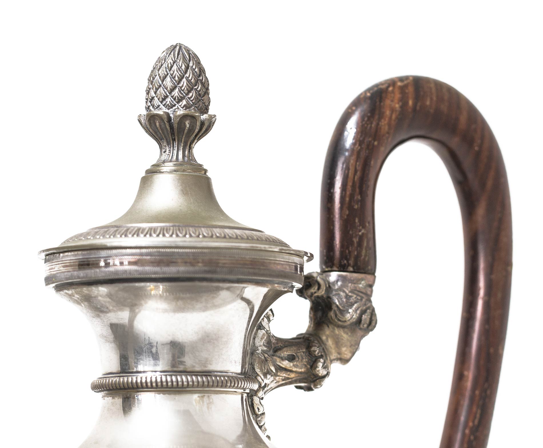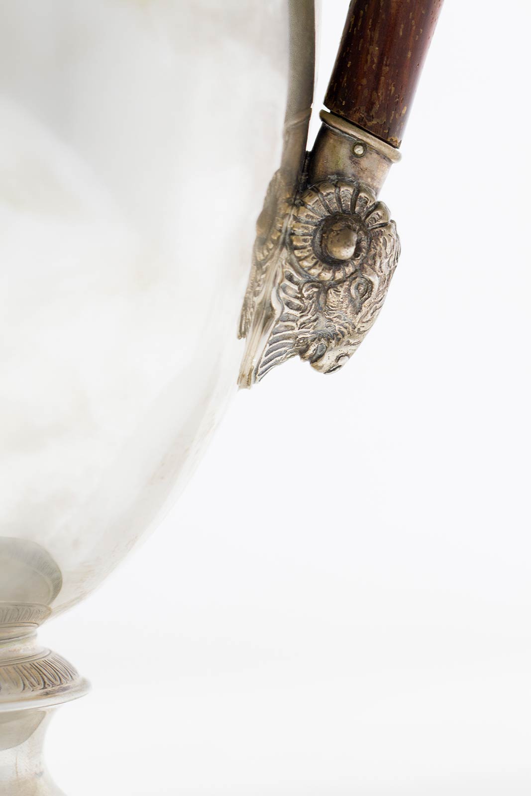 Teiera in argento 800 con versatoio in forma di testa equina - manico in legno. Firenze primi 900. Peso lordo Kg 1,280. H Cm 36
