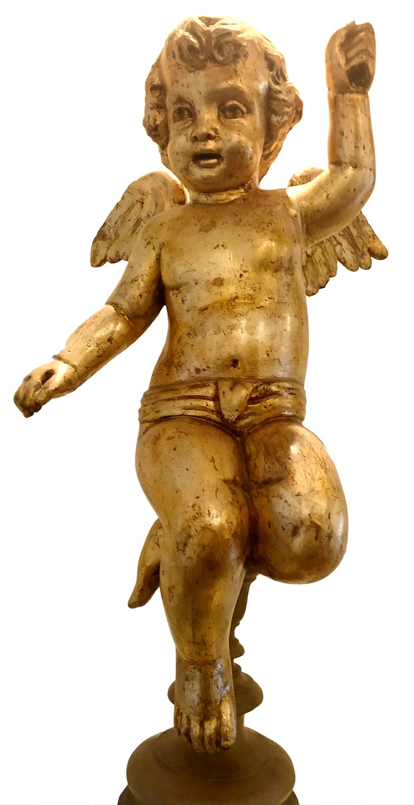 Angelo in legno dorato. Sicilia, XVIII secolo. Con base in legno. H cm 67 (con base)