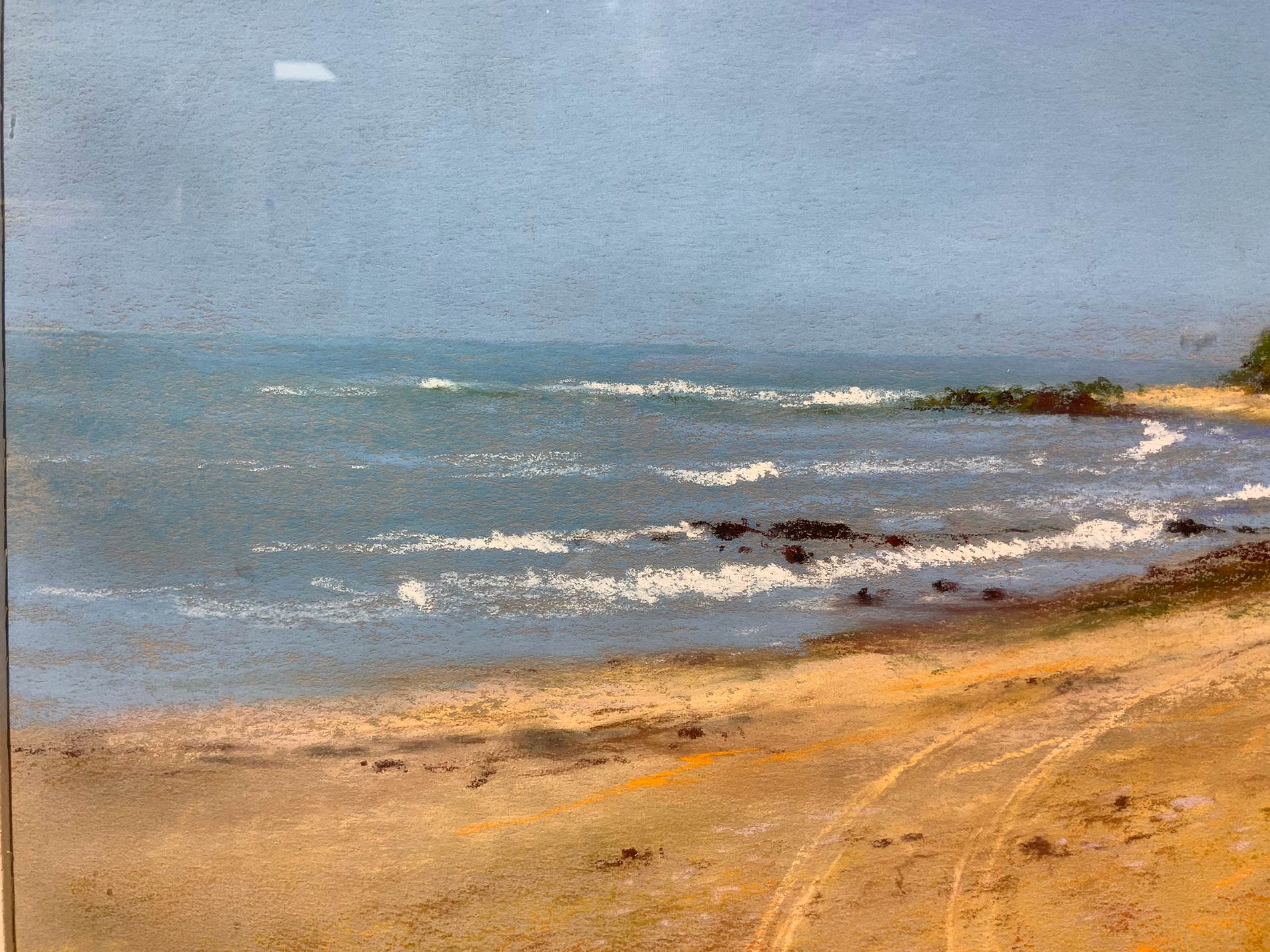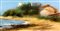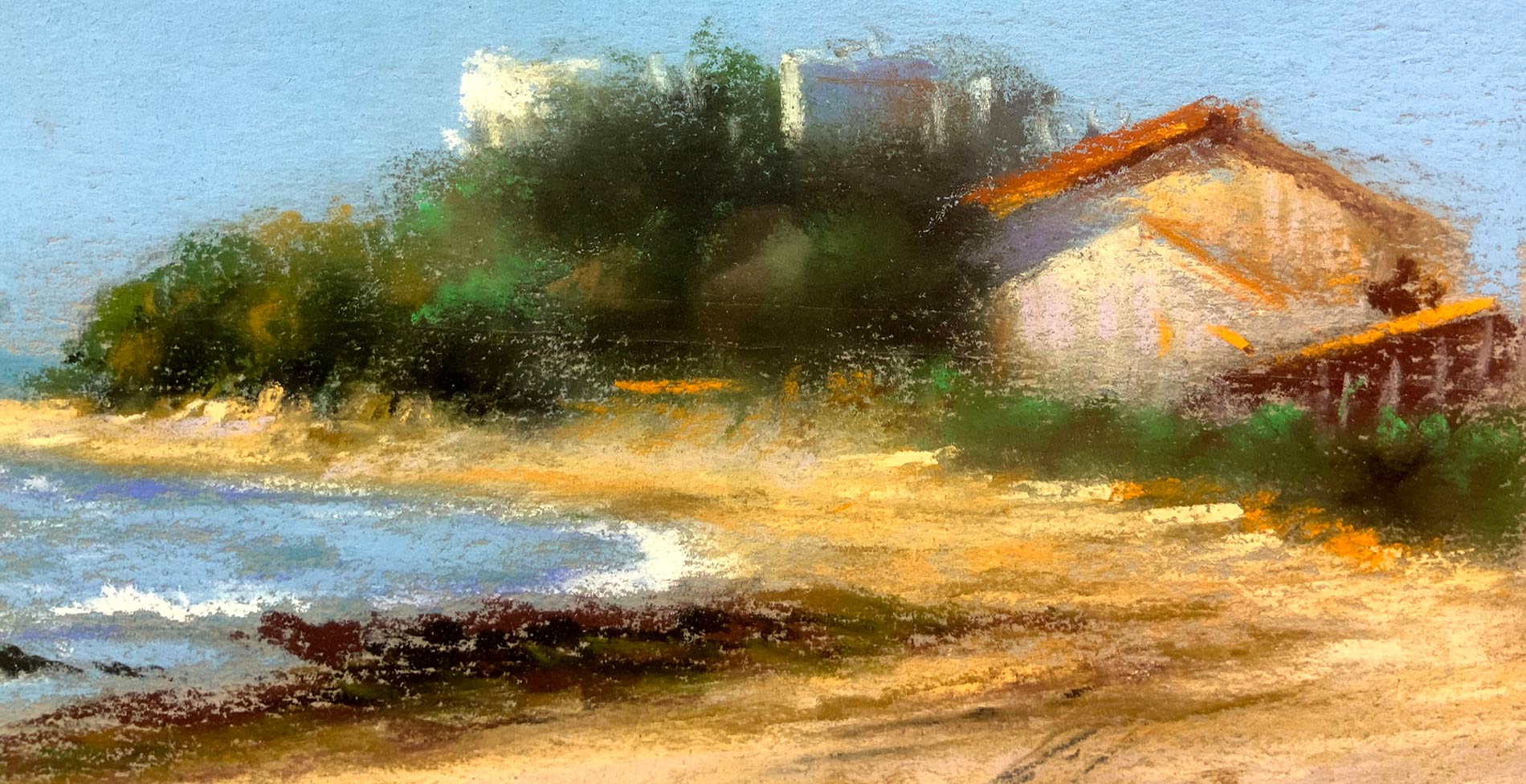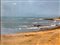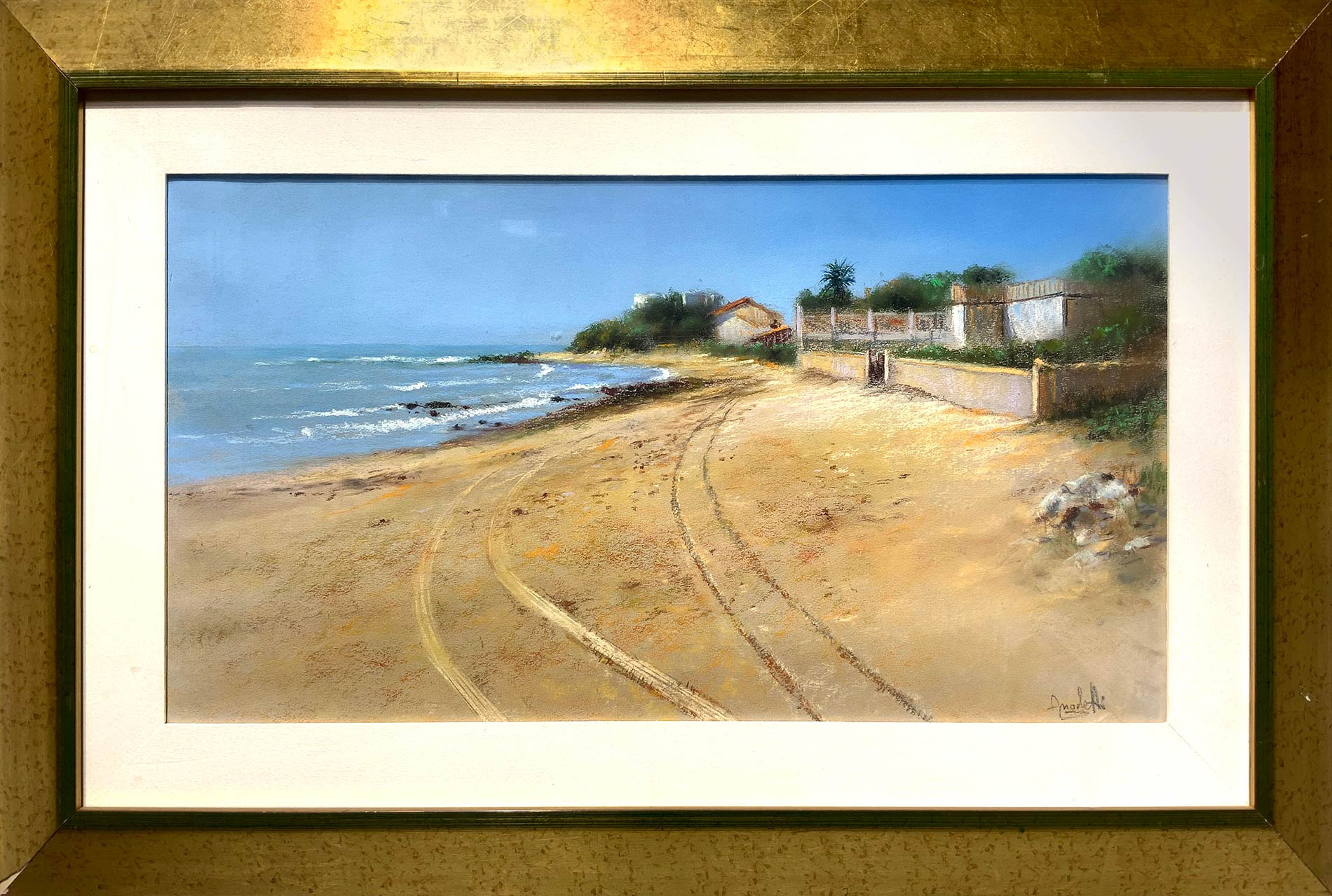 Giacomo Angiletti (Caltagirone, 1948). Marina con paesaggio di Pozzallo. 35x62, olio su cartone. Firmato e datato 2006 in basso a destra.