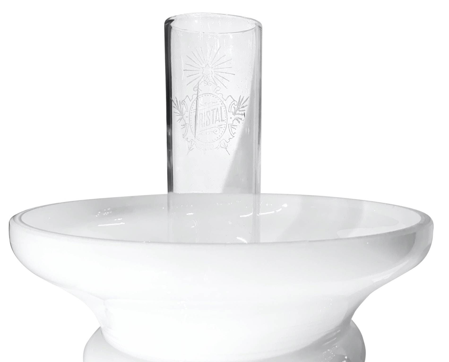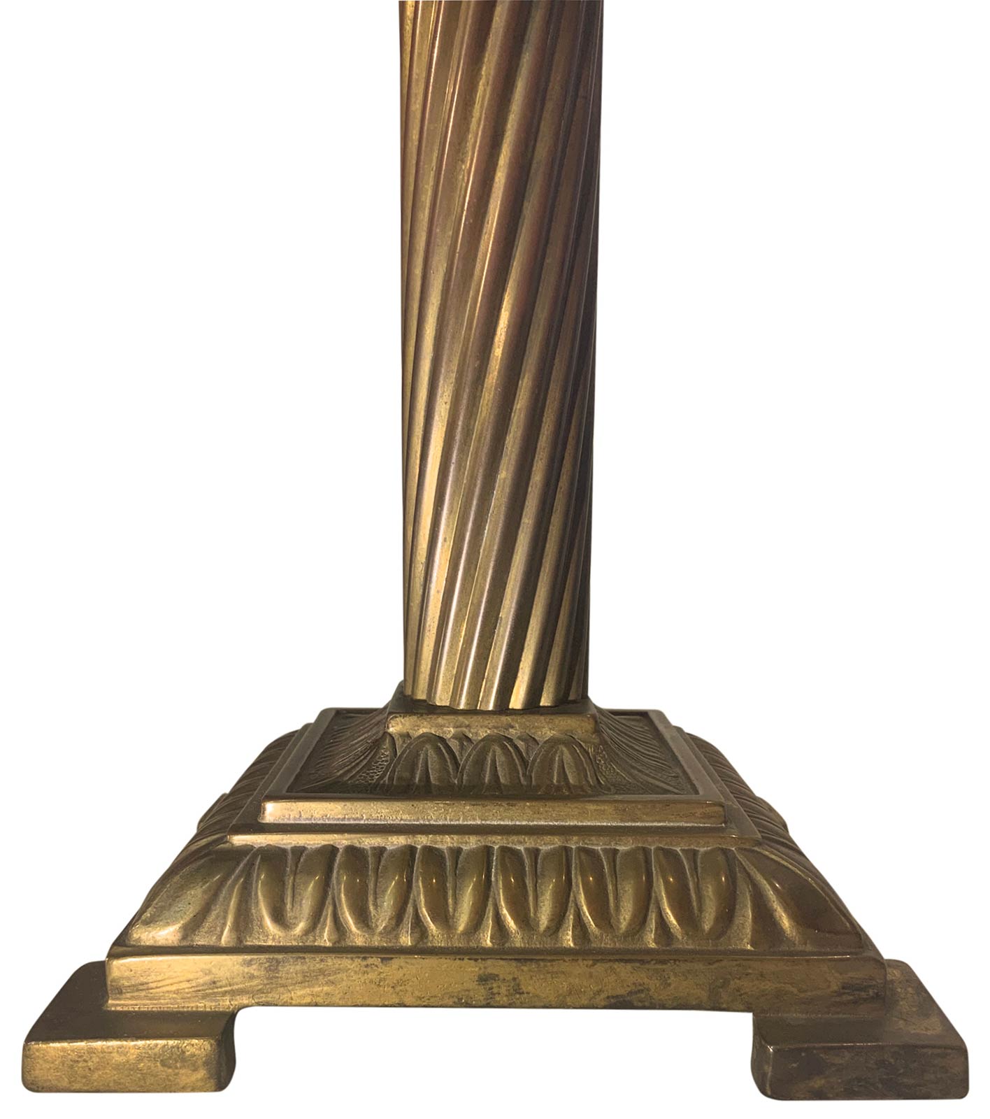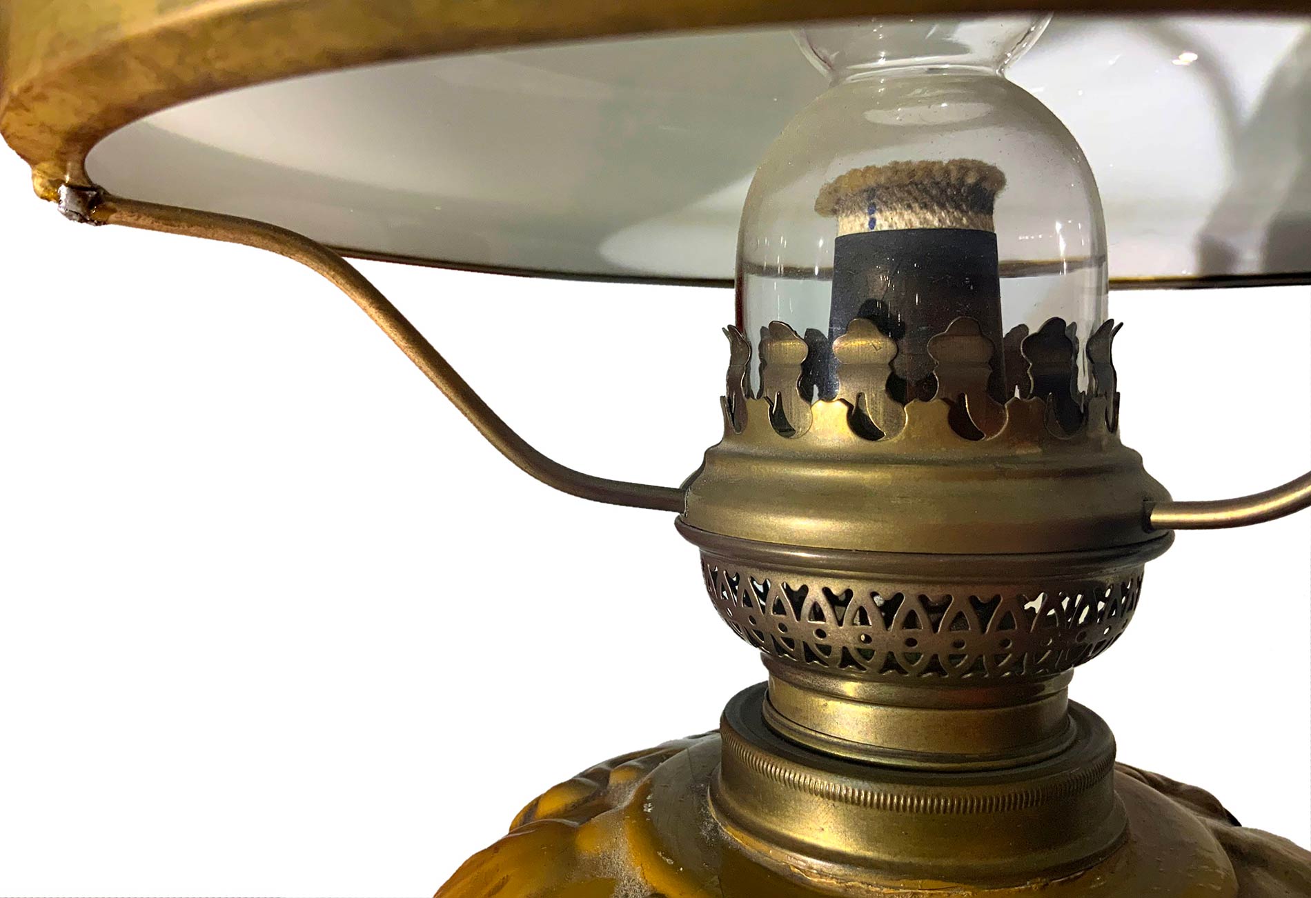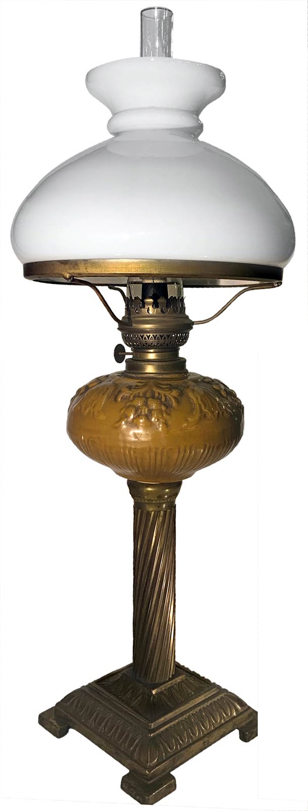 Lume in ceramica, XX Secolo. Base in ottone e coppa a campana, H cm 60