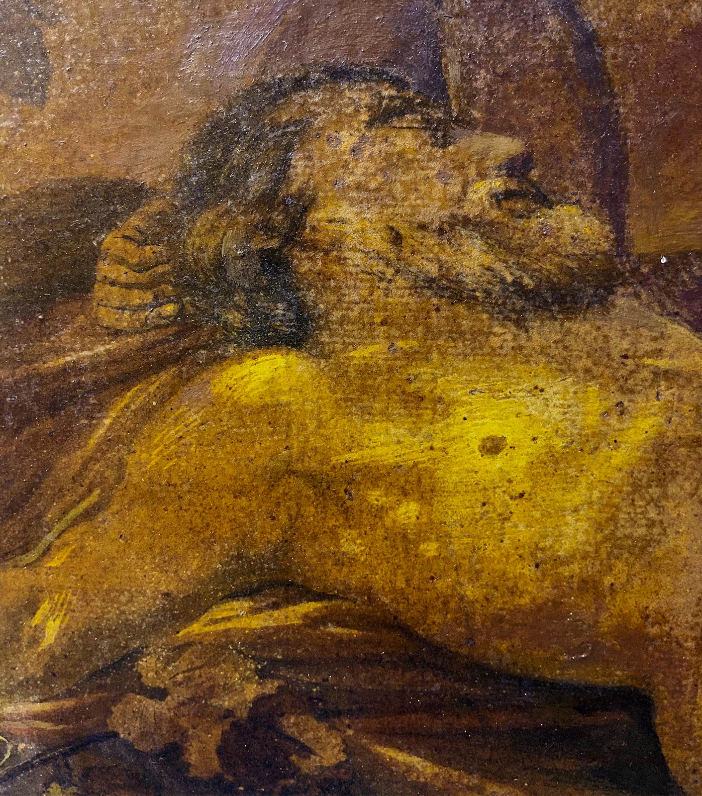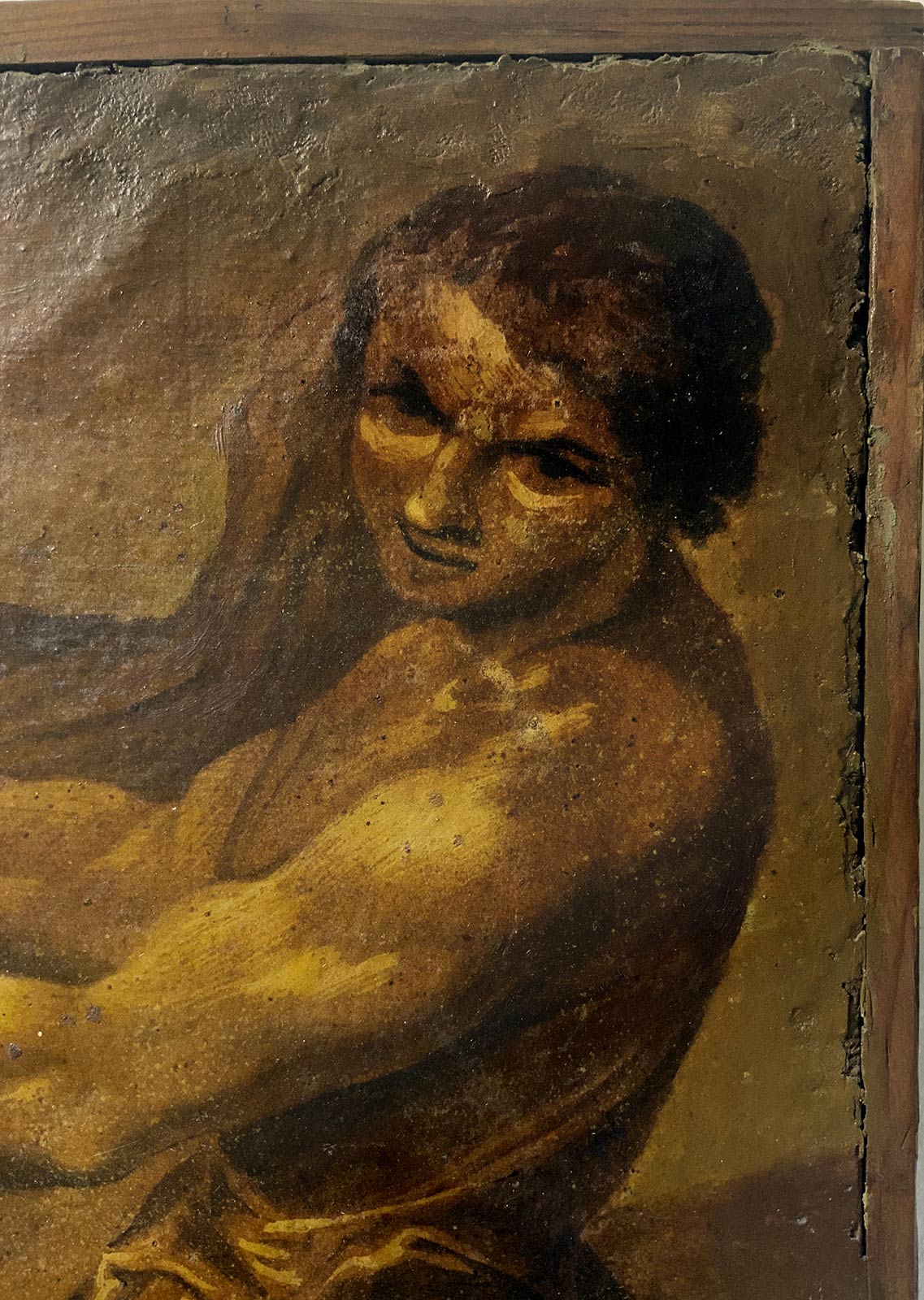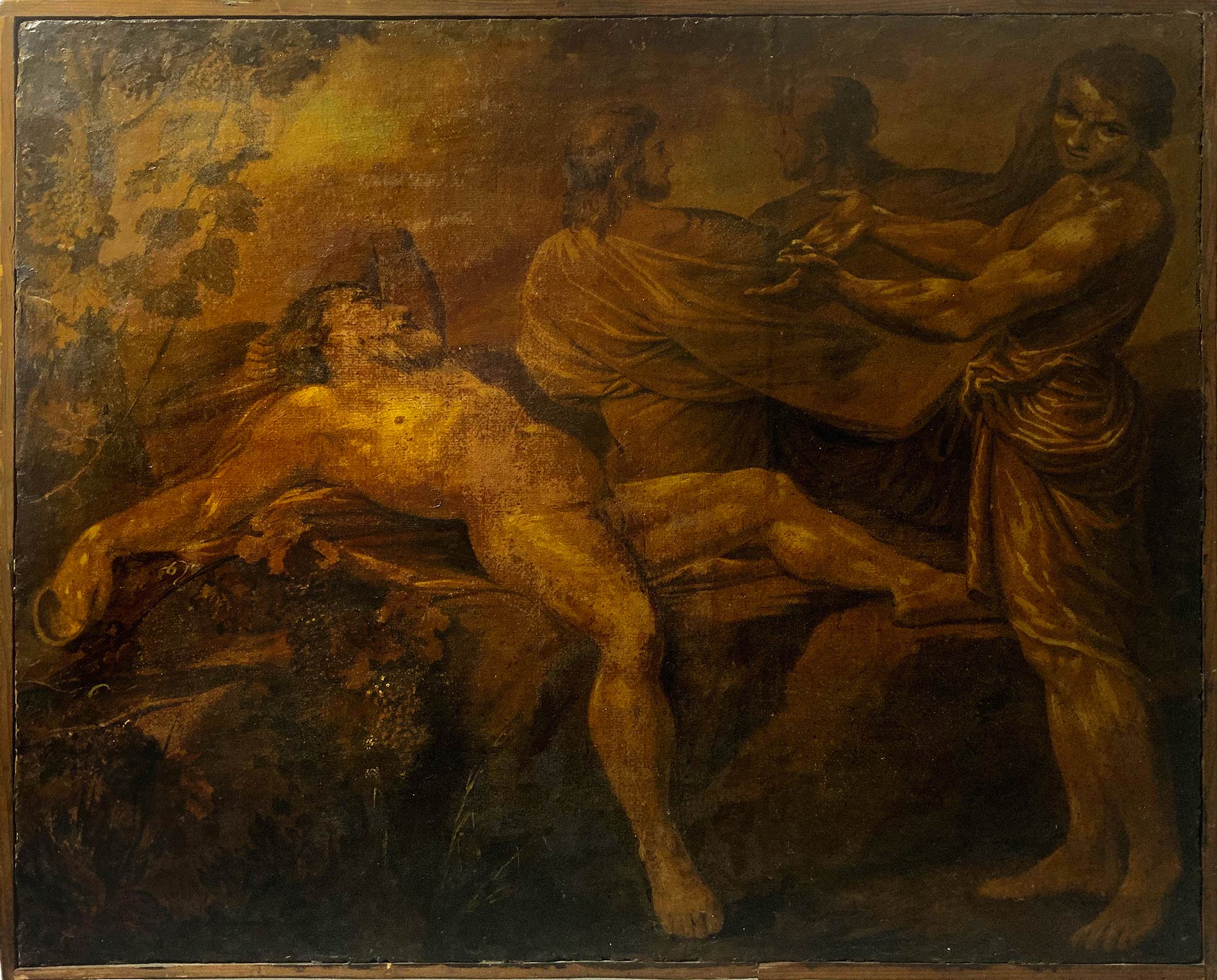 Pittore italiano del XVIII Secolo. L’ebrezza di Noè, copia da Andrea Sacchi. 46x56, olio su tela. Antica collezione Notaio Cav. Fazio. Superficie del dipinto risulta interessata dalla presenza di uno strato di vernice ossidata e ingiallita.