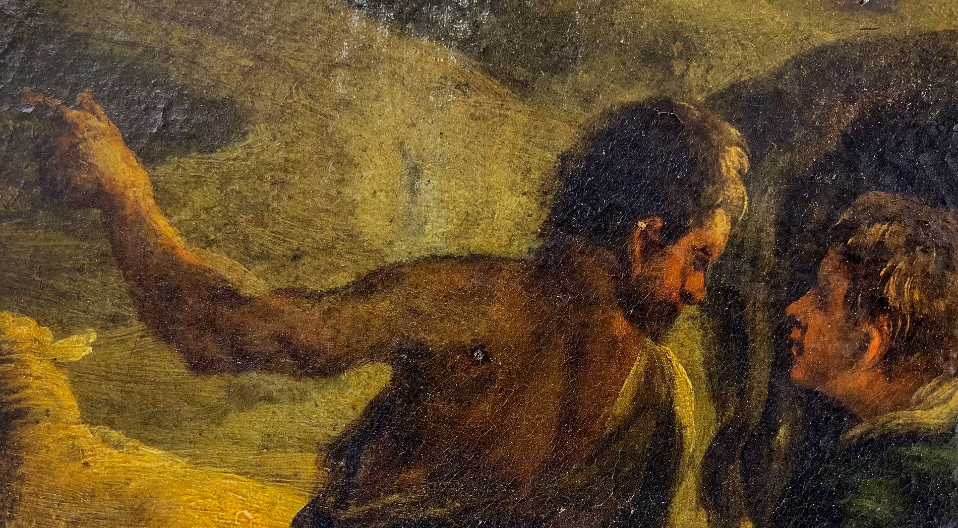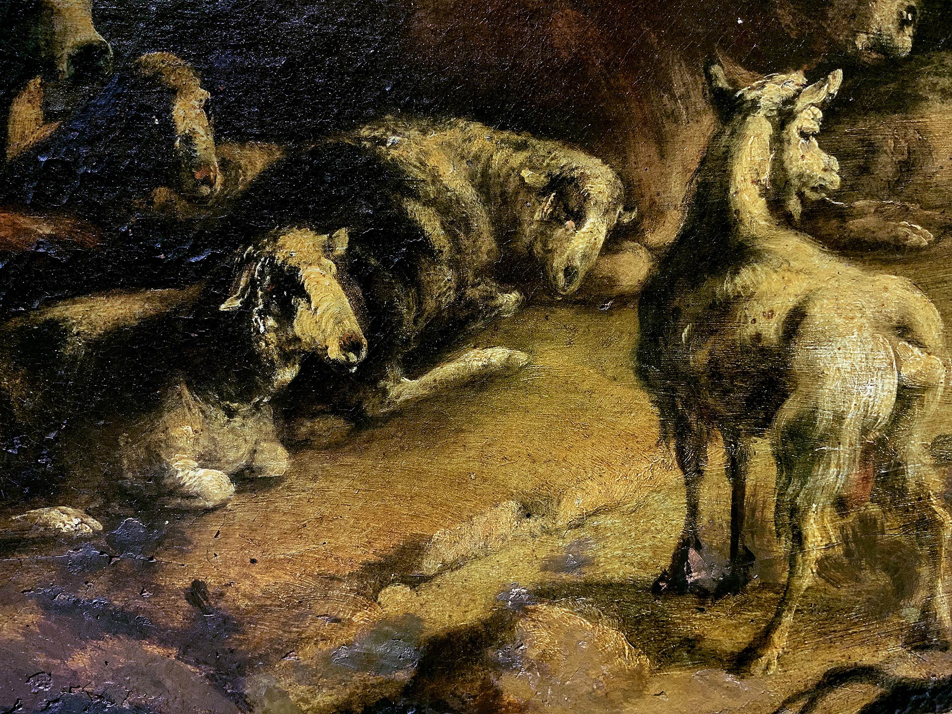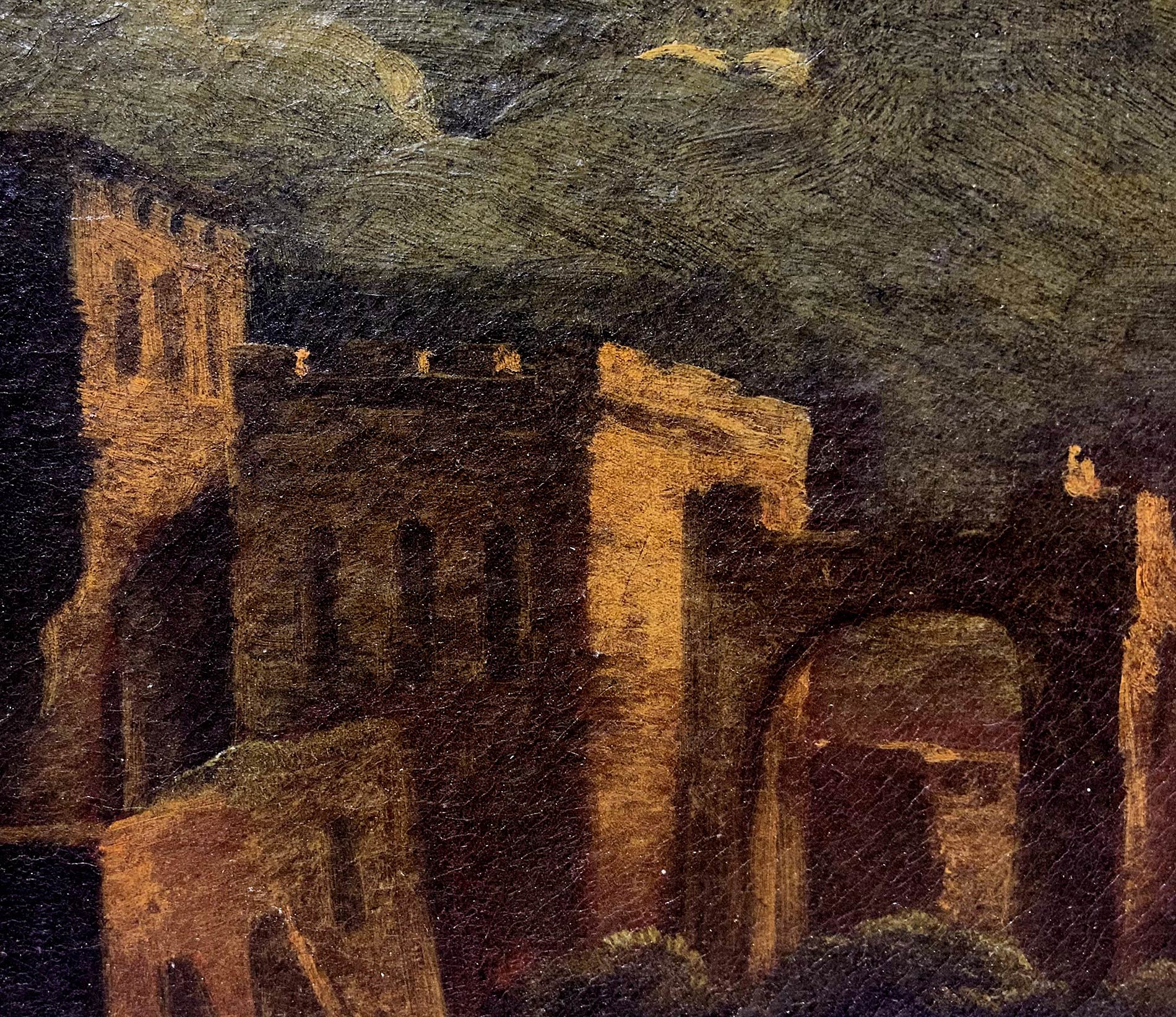 Pittore italiano del XVII/XVIII Secolo, ambito Romano. Paesaggio con rocca, figure e armenti. 75x130, olio su tela. Antica collezione Notaio Cav. Fazio. Superficie del dipinto risulta interessata dalla presenza di uno strato di vernice ossidata e ingiallita.