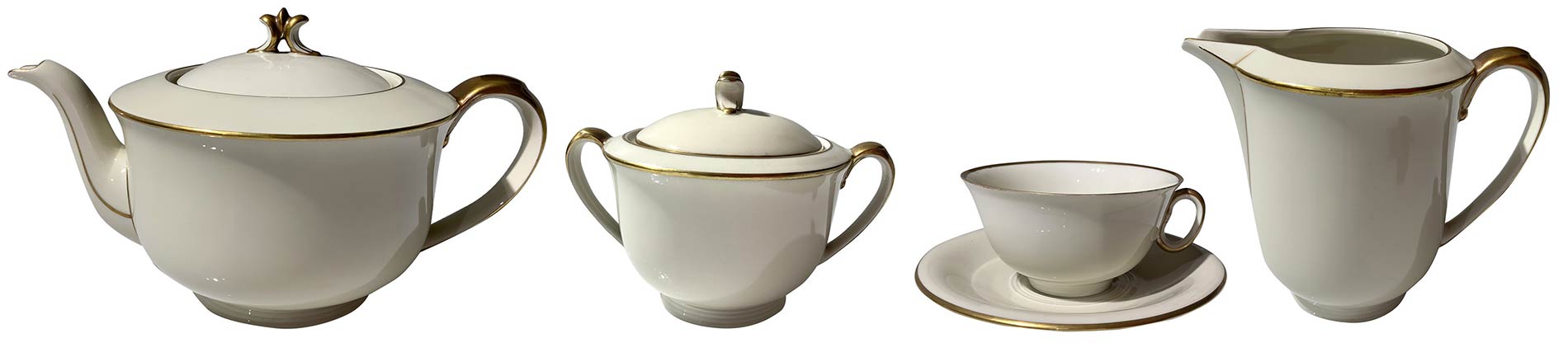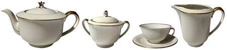 Hutschenreuther Hohenberg "Margarete", Bavaria, XX secolo. Servizio da The’ in porcellana bianca da 12 persone. Zuccheriera, lattiera, teiera. Minima sbeccatura su una tazza, fileur nella zuccheriera.