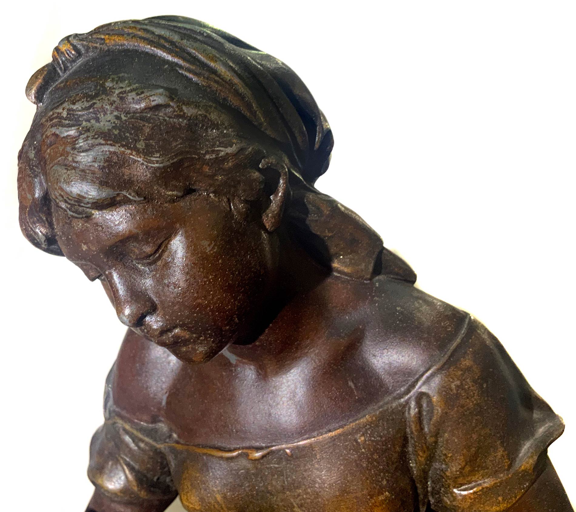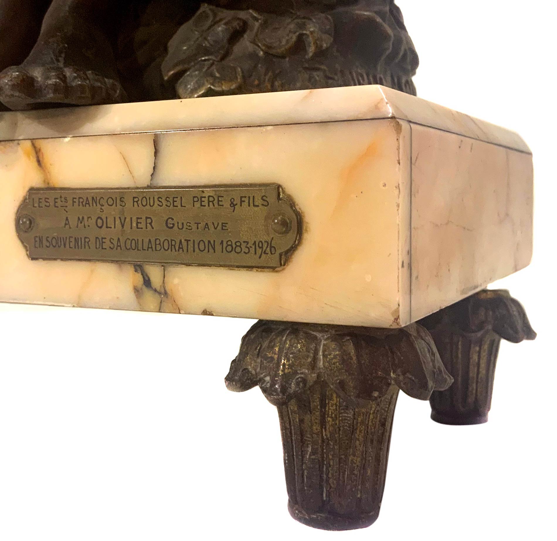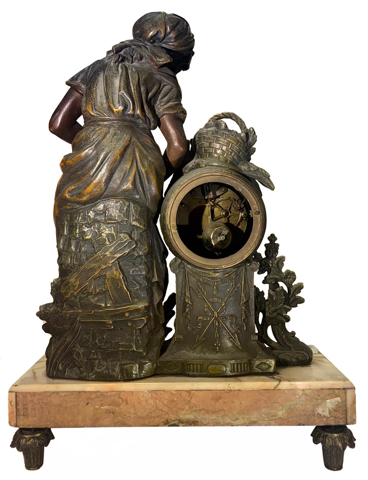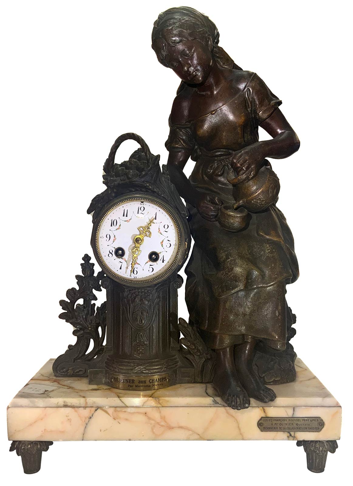 Orologio in antimonio con base in marmo e quadrante in porcellana. Fine XIX Secolo. Fanciulla con brocca. Dejeurner aux champs. Con dedica " Les ets Francois Roussel Pere & Fils a Ms Oliver Gustave, en souvenir de la collaboration 1883-1926". H cm 50, base 35x15. Da revisionare