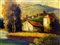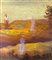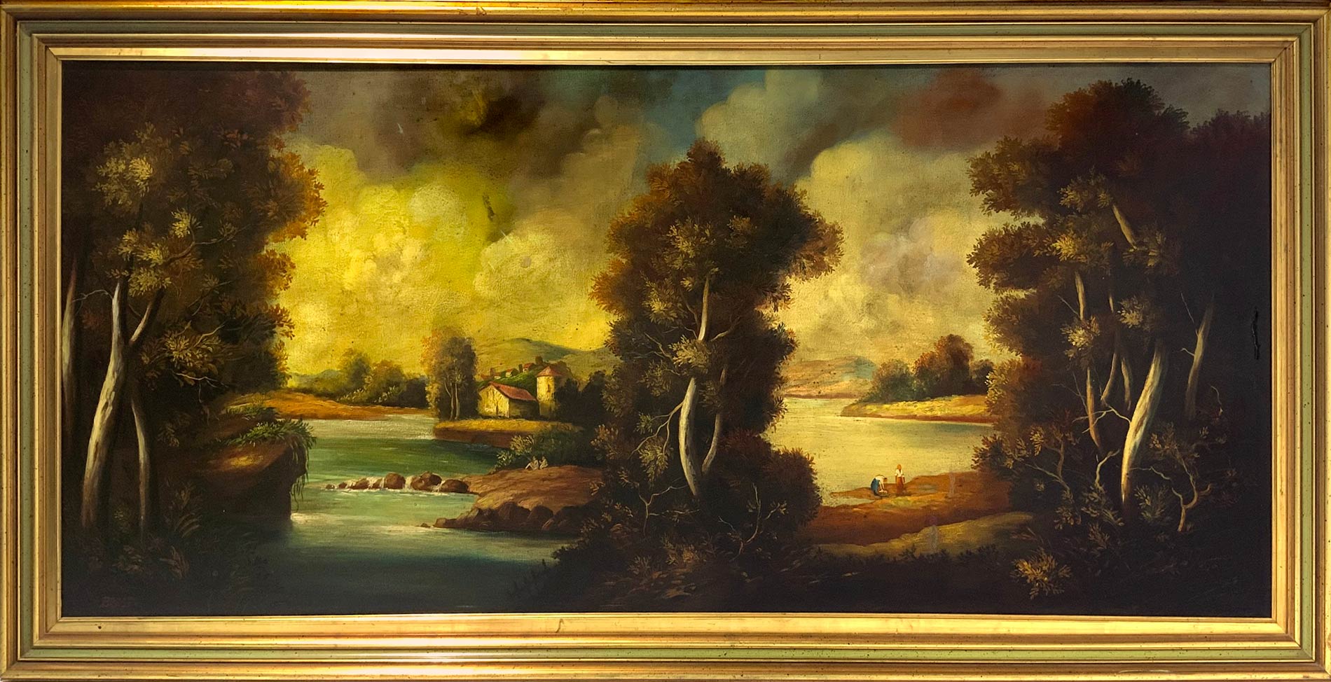 Pittore del XX secolo. Paesaggio lacustre con personaggi e case. 85x194, olio...