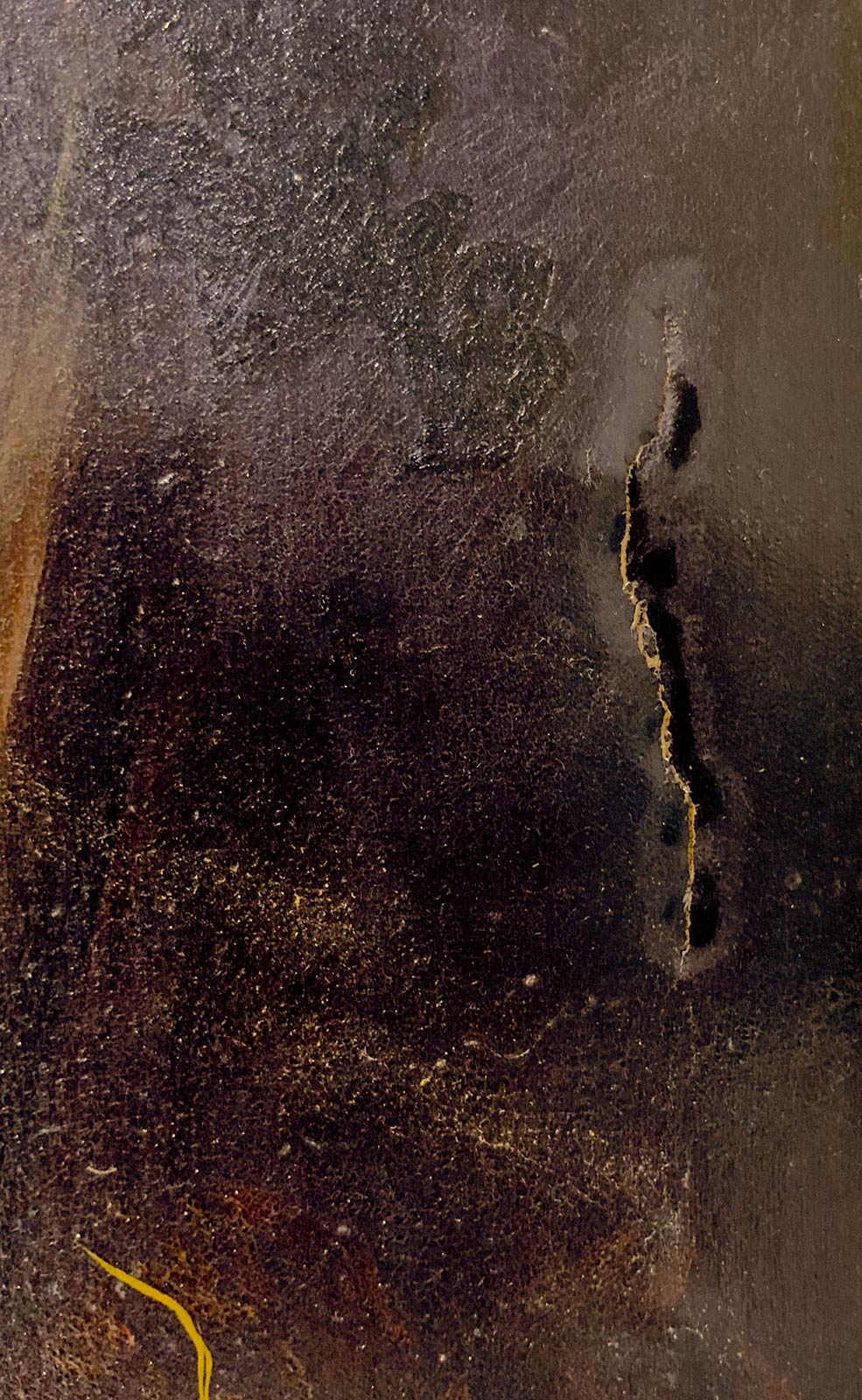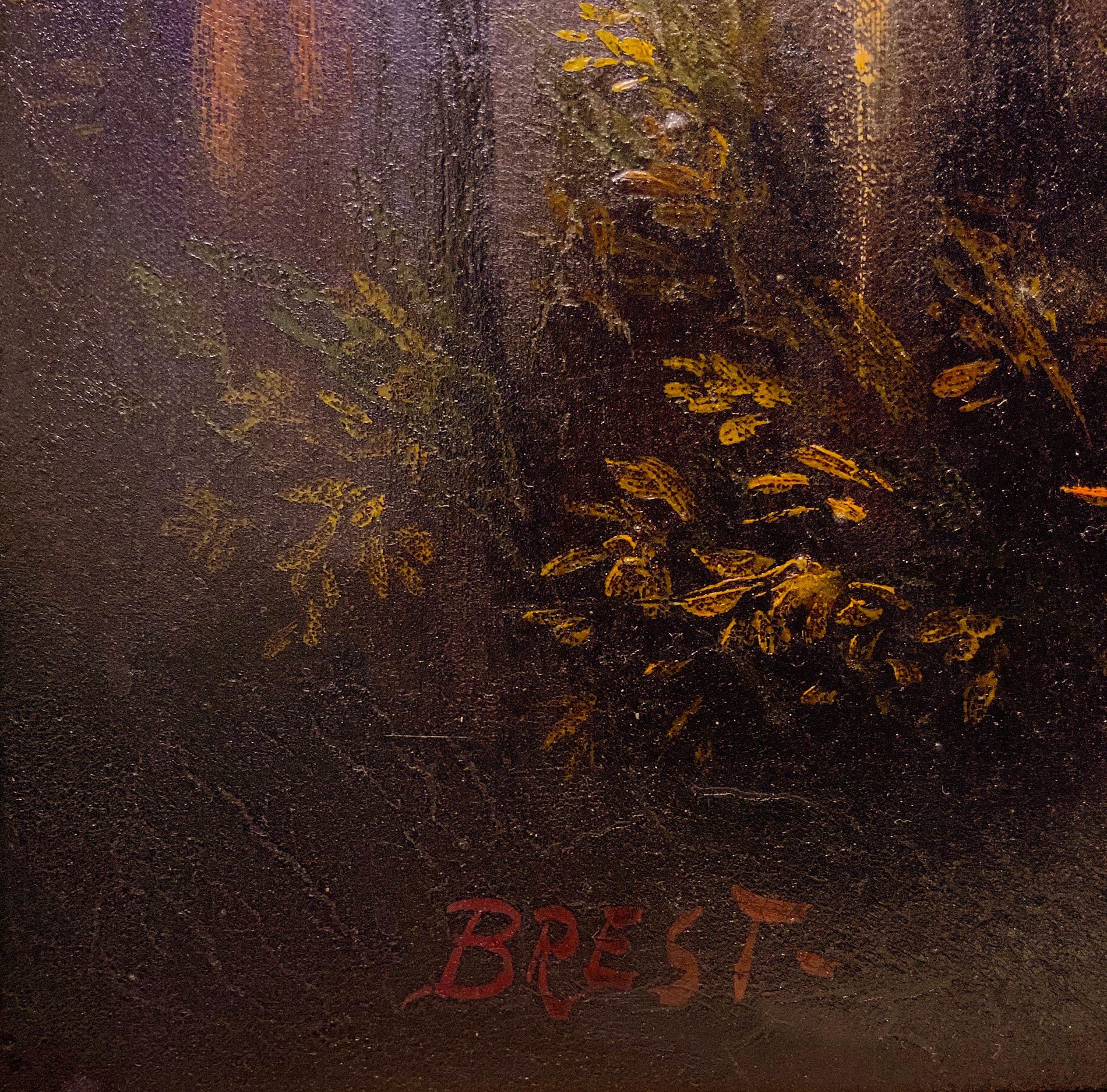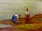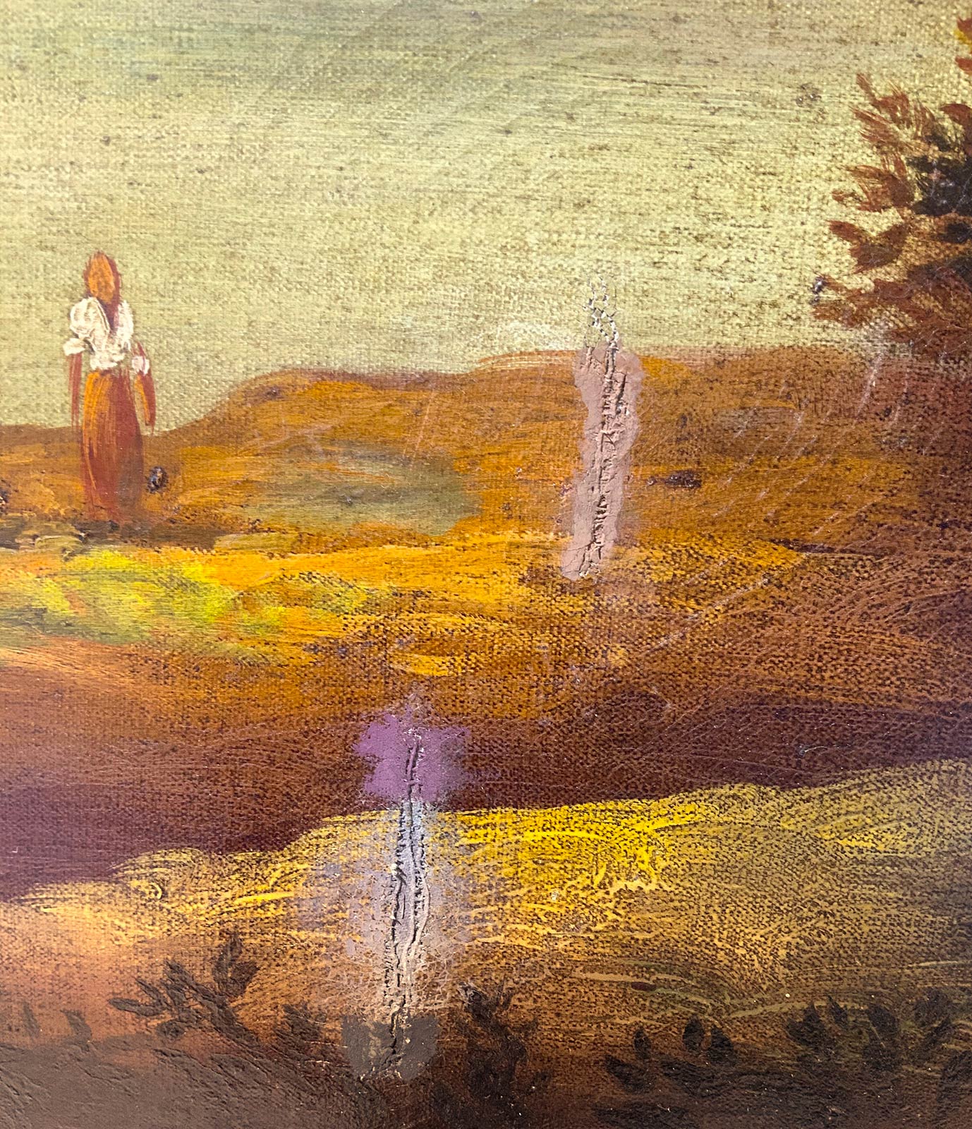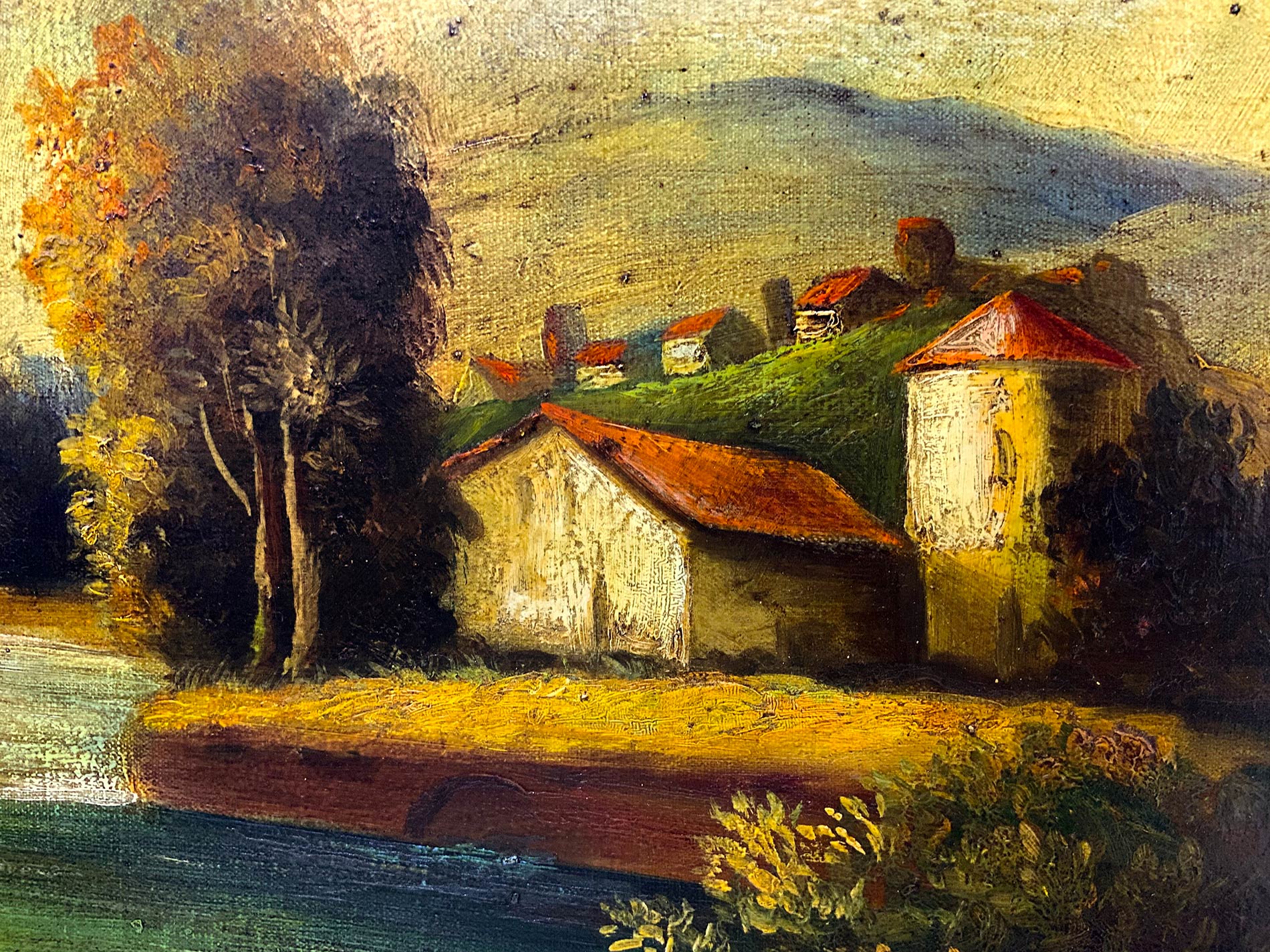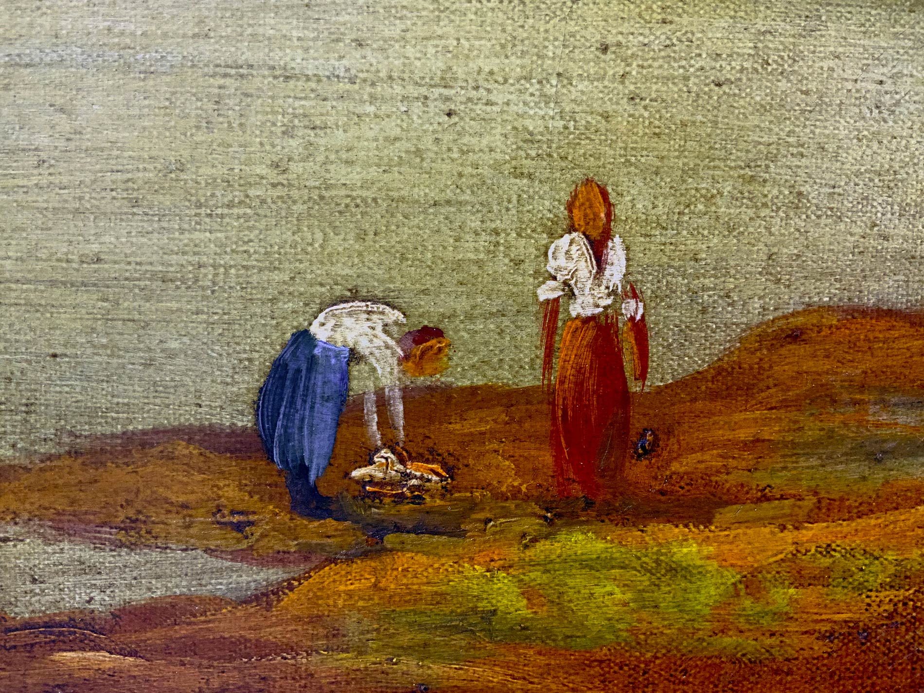Pittore del XX secolo. Paesaggio lacustre con personaggi e case. 85x194, olio su tela. Diversi buchi sulla tela. Firmato Brest