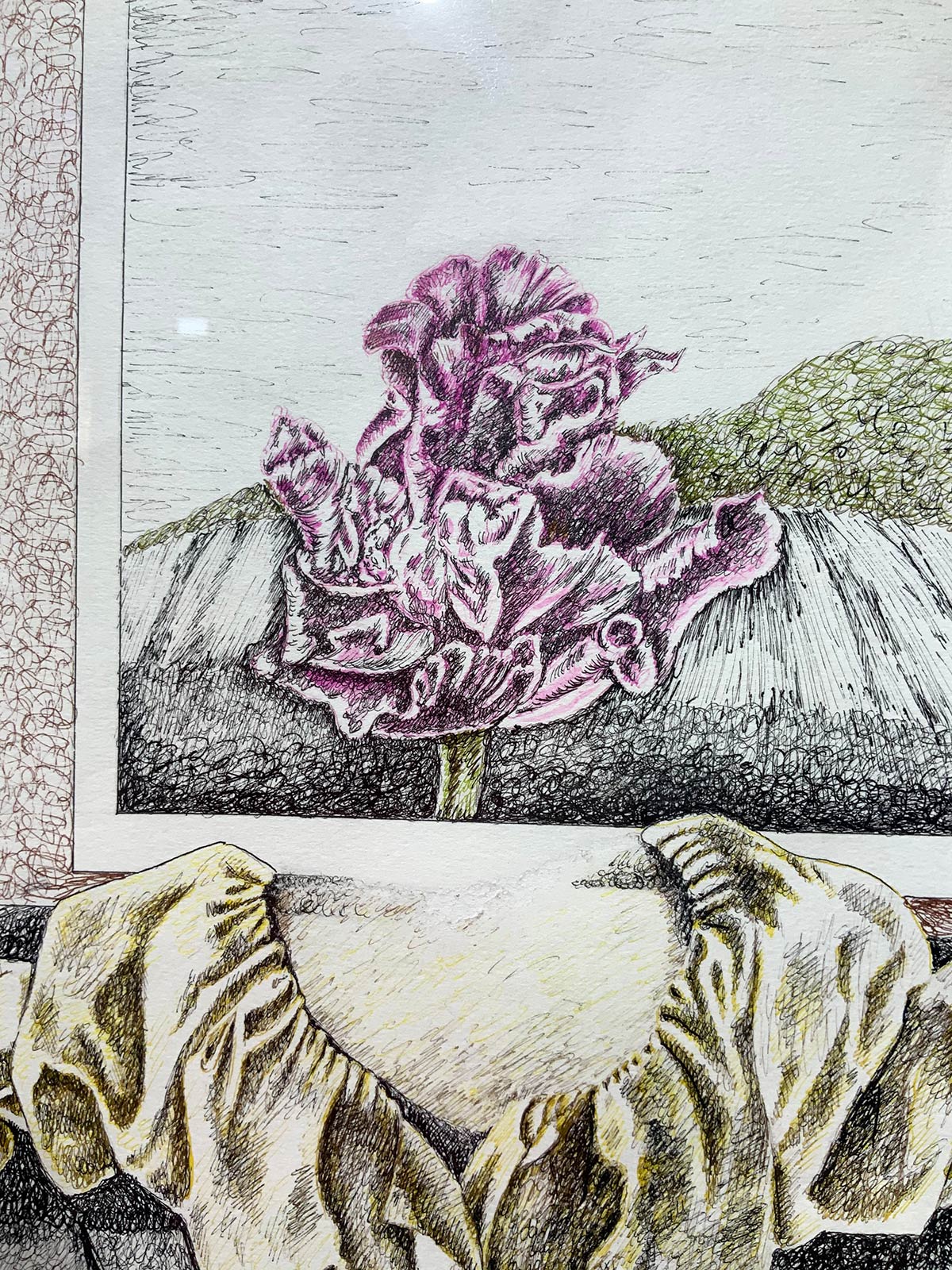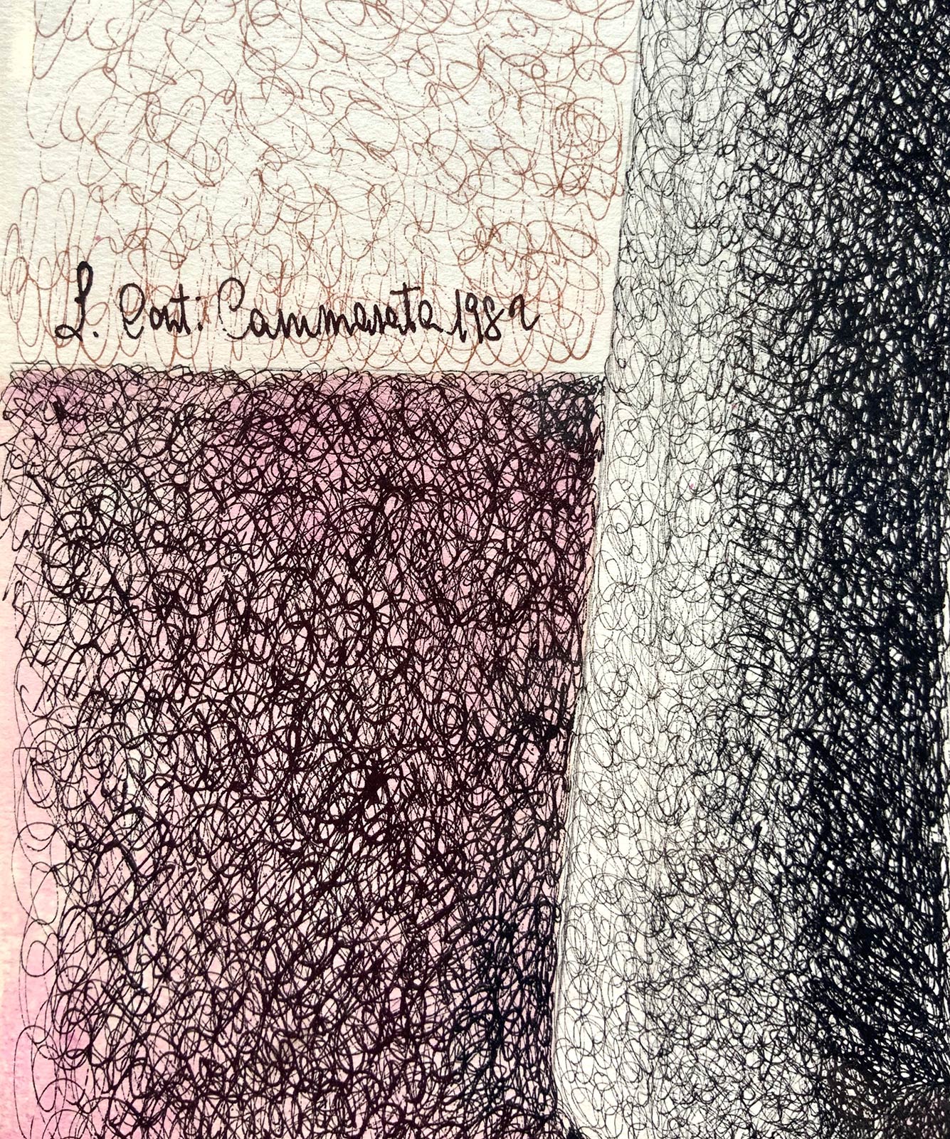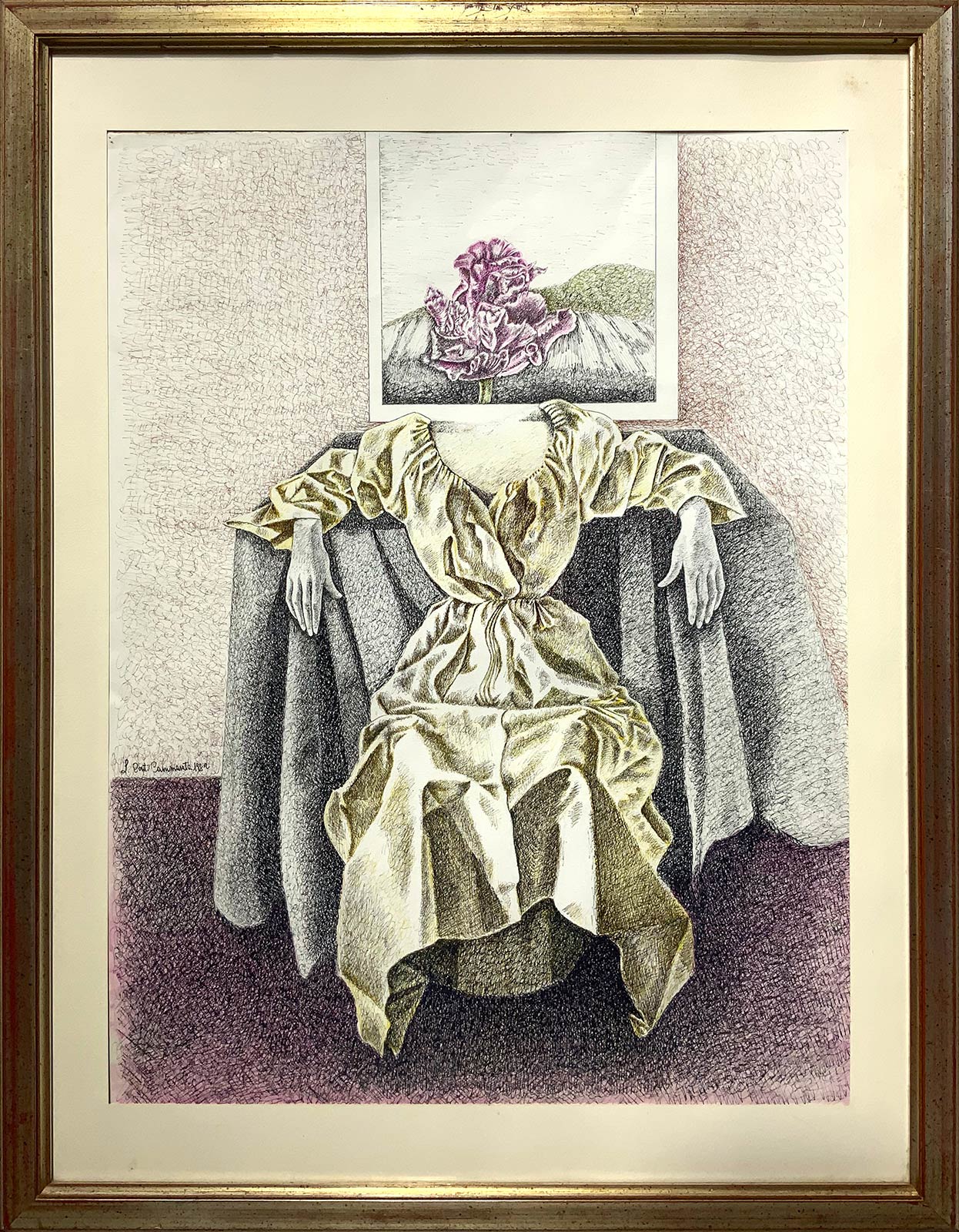 Donna con natura morta di fiori. 88x65, disegno colorato a china. Firmato e datato Conti Cammarata, 1982.