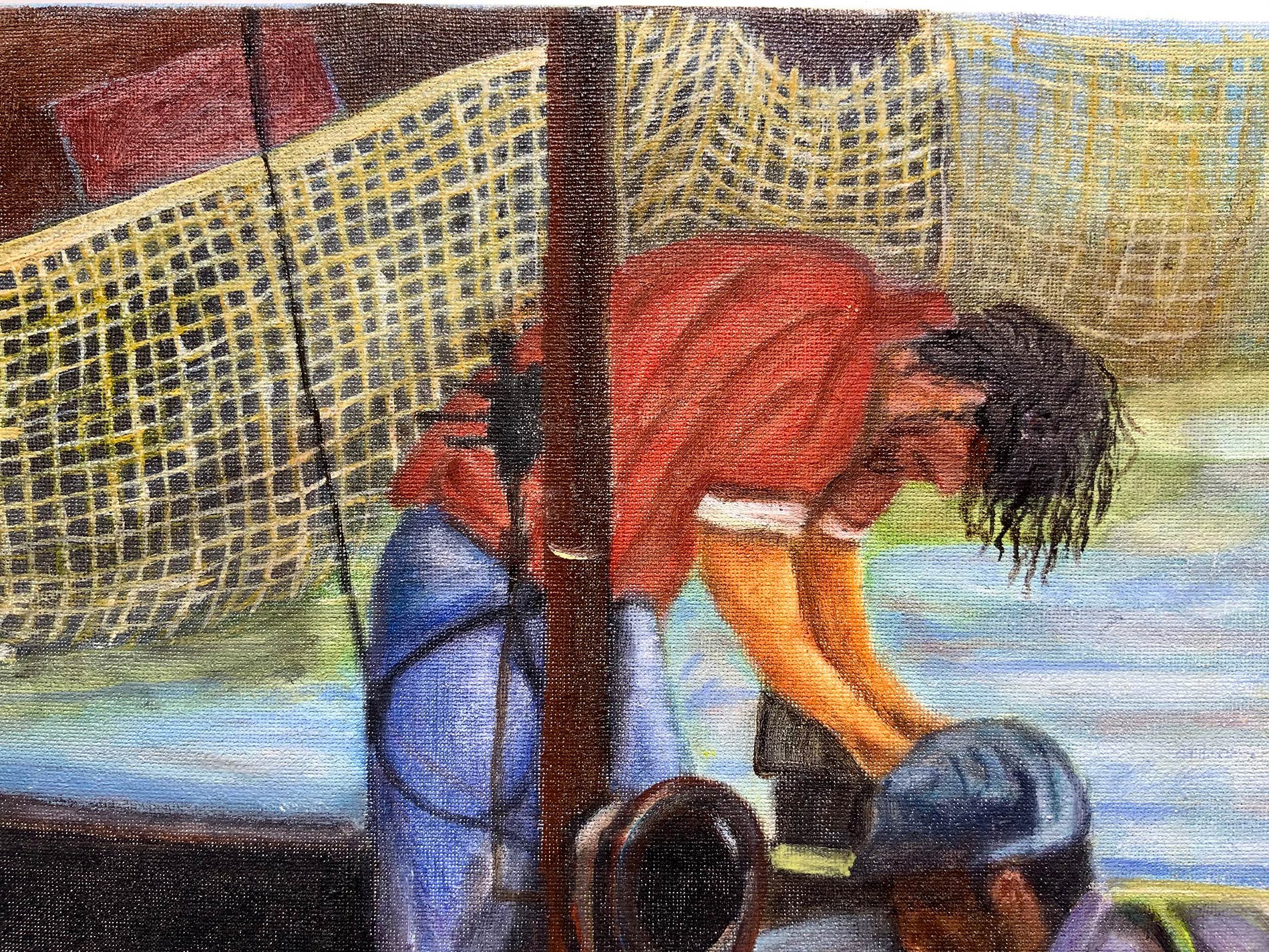 Anna Cannata (1944, Catania). La mattanza dei tonni. 70x90, olio su tela....