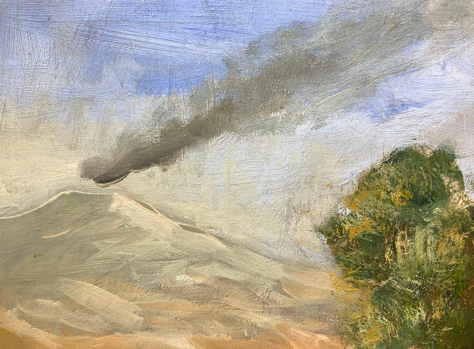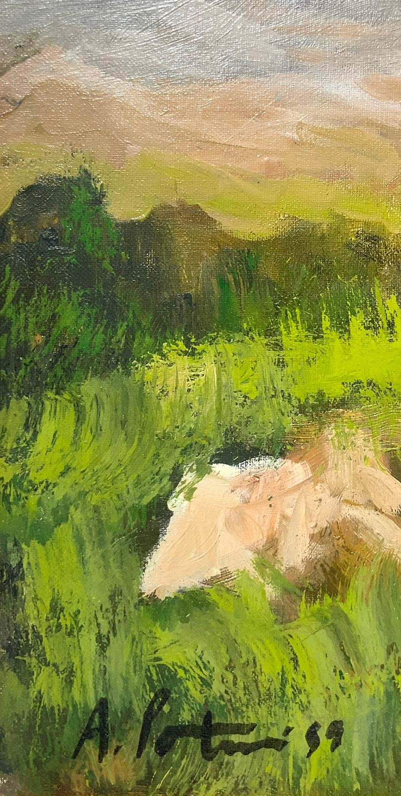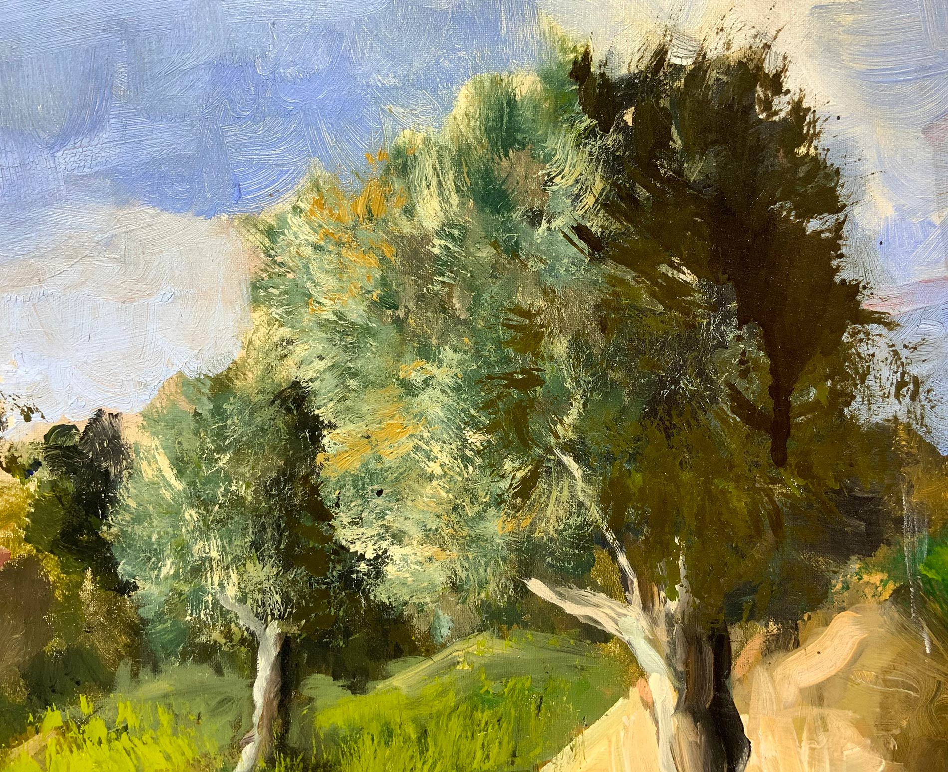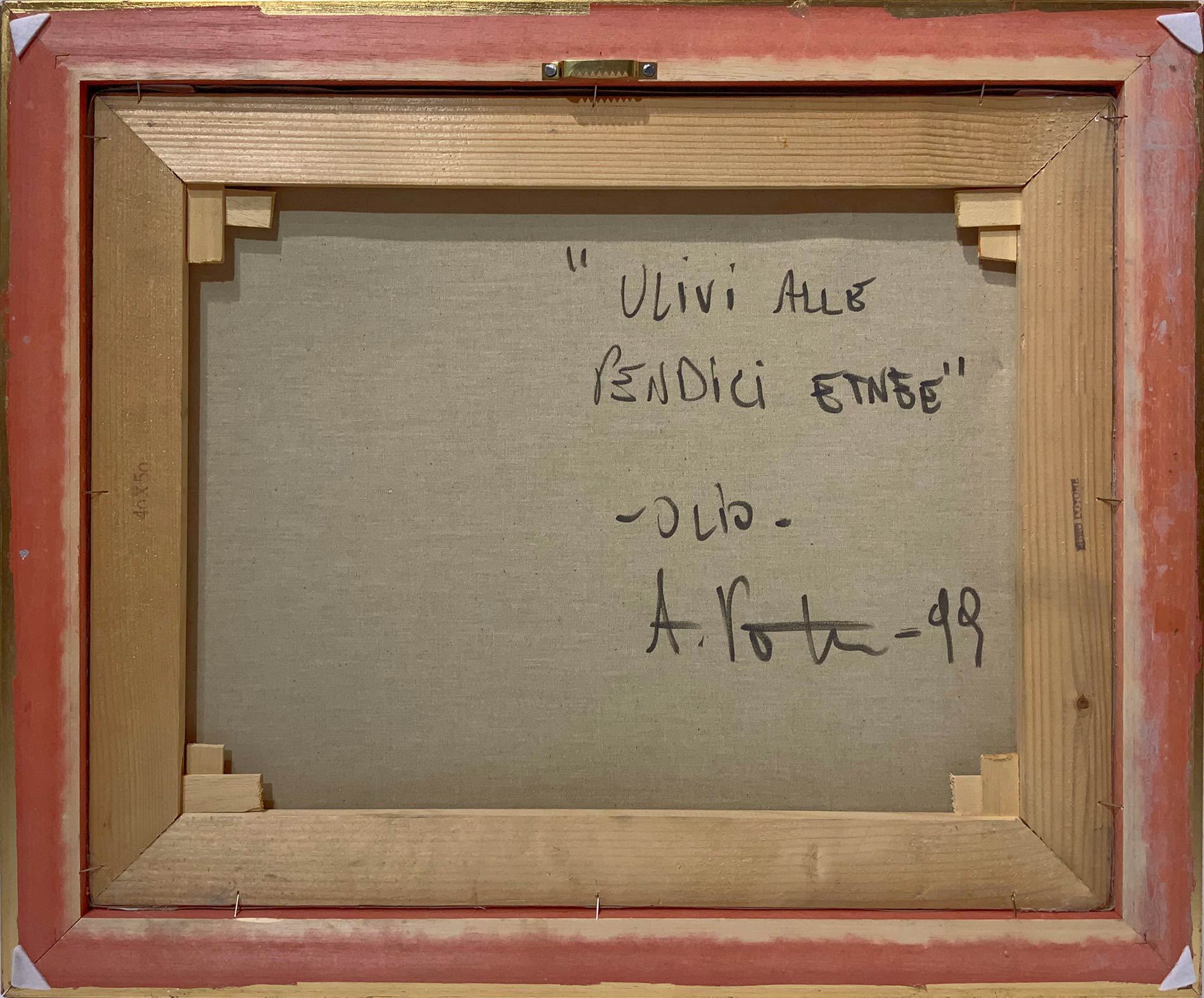 Pittore siciliano del XX secolo. Veduta dell’Etna da un uliveto. 40x50, olio su tela. Firmato A. Votini e datato 1999 in basso a sinistra.