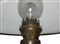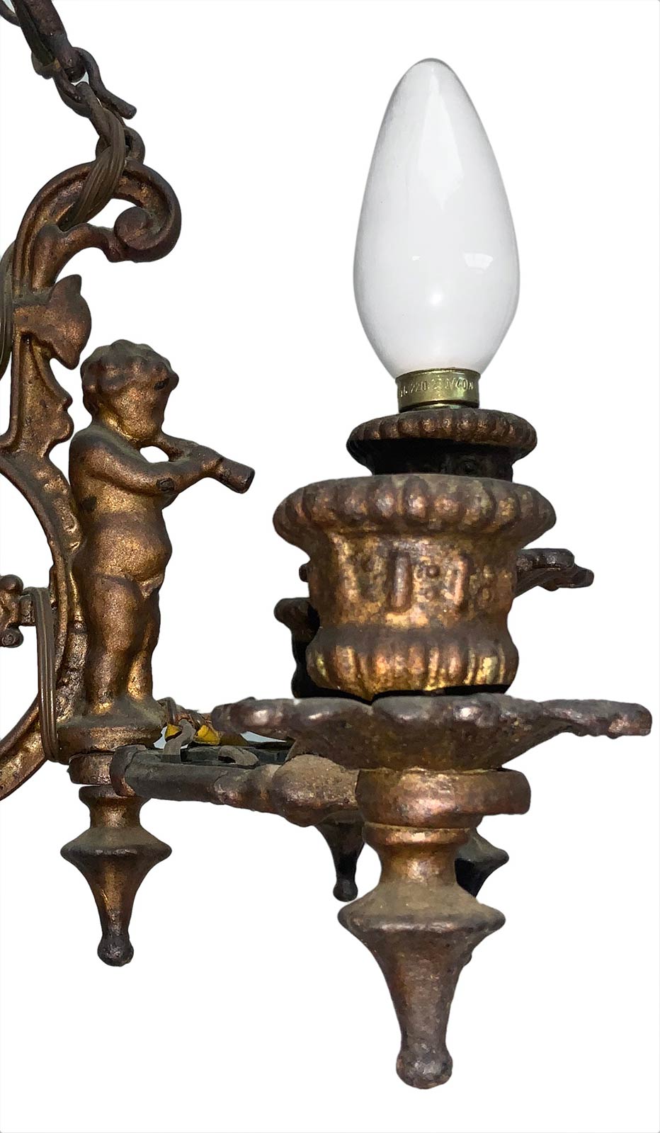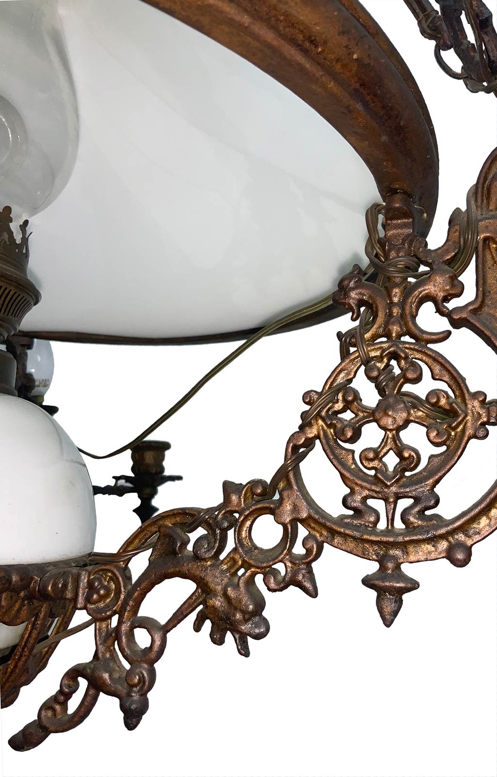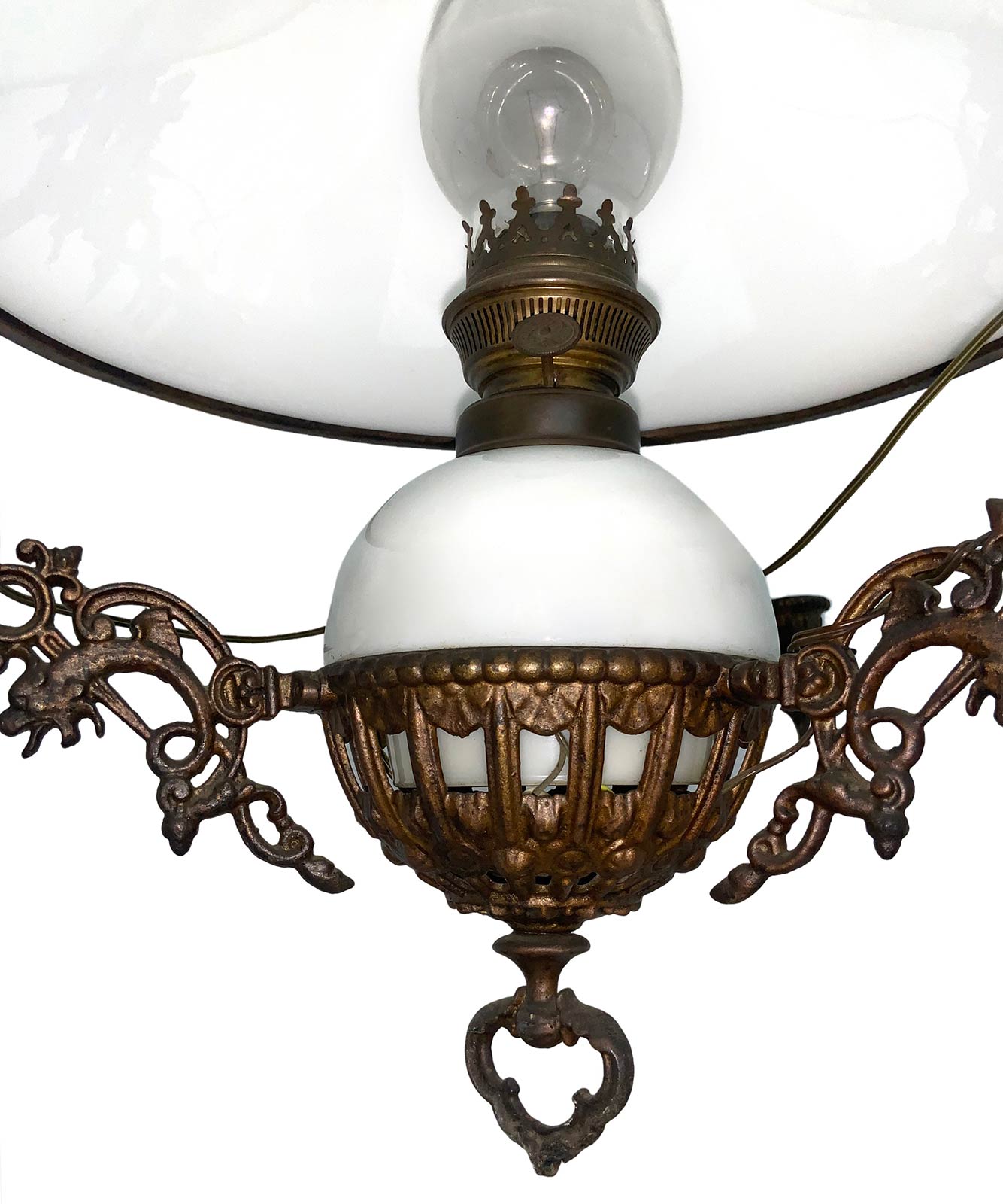 Lampadario in ottone con diffusore in vetro opalino bianco. Inizi XX secolo....