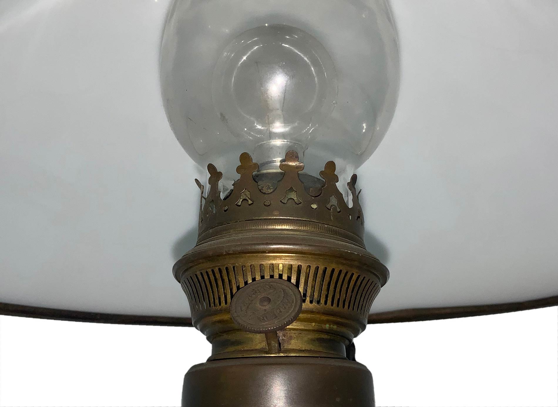 Lampadario in ottone con diffusore in vetro opalino bianco. Inizi XX secolo. H cm 102, diametro Cm 45